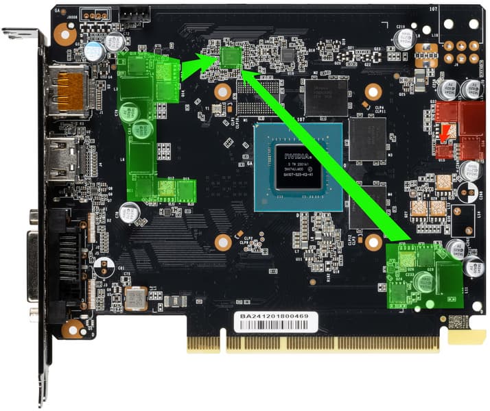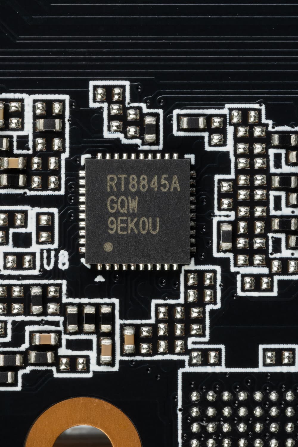 Зеленым цветом отмечены фазы питания графического ядра, а также их ШИМ-контроллер, а красным — то же для микросхем памяти. Все контроллеры расположены на лицевой стороне PCB. Для управления схемой питания ядра используется ШИМ-контроллер RT8845A (Richtek).