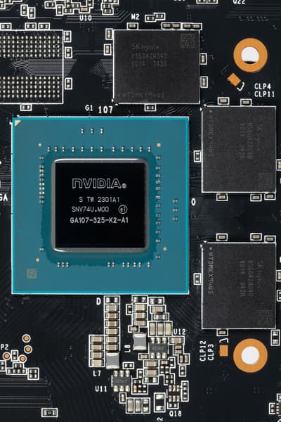 Графическое ядро — чип GA107-325, выпущенный на 1-й неделе 2023 года, то есть Nvidia уже очень давно практикует выпуск подобных вариантов (напомним про ОЕМ-варианты GeForce RTX 3050). Маркировка «-325» как раз и говорит о том, что в ядре меньше блоков, чем у обычного GeForce RTX 3050 (у того в маркировке «-400»).