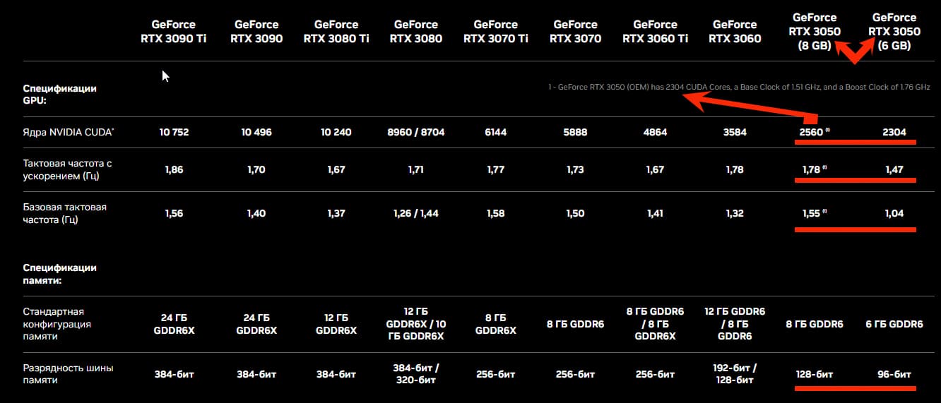 | GPU | GeForce RTX 3050 (GA107, урезанная версия) | GeForce RTX 3050 (GA107, полная версия) | |