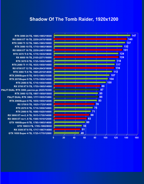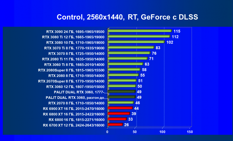 Разумеется, как и в случае со старшими ускорителями новой серии, GeForce RTX 3060 реализует в играх все преимущества технологии трассировки лучей в сочетании с DLSS. И в том же разрешении Full HD производительность GeForce RTX 3060 при включении RT+DLSS является более чем достаточной. Да и без DLSS во многих играх с RT новинка показывает приличную скорость. GeForce RTX 3060 является прямым конкурентом ускорителям Radeon RX 6600 XT/5700 XT и прошлым GeForce RTX 2070 и GeForce RTX 2060 Super. Radeon RX 6600 XT выигрывает в традиционных играх с растеризацией, но сильно проигрывает в играх с RT, поэтому итоговую оценку дать сложно.