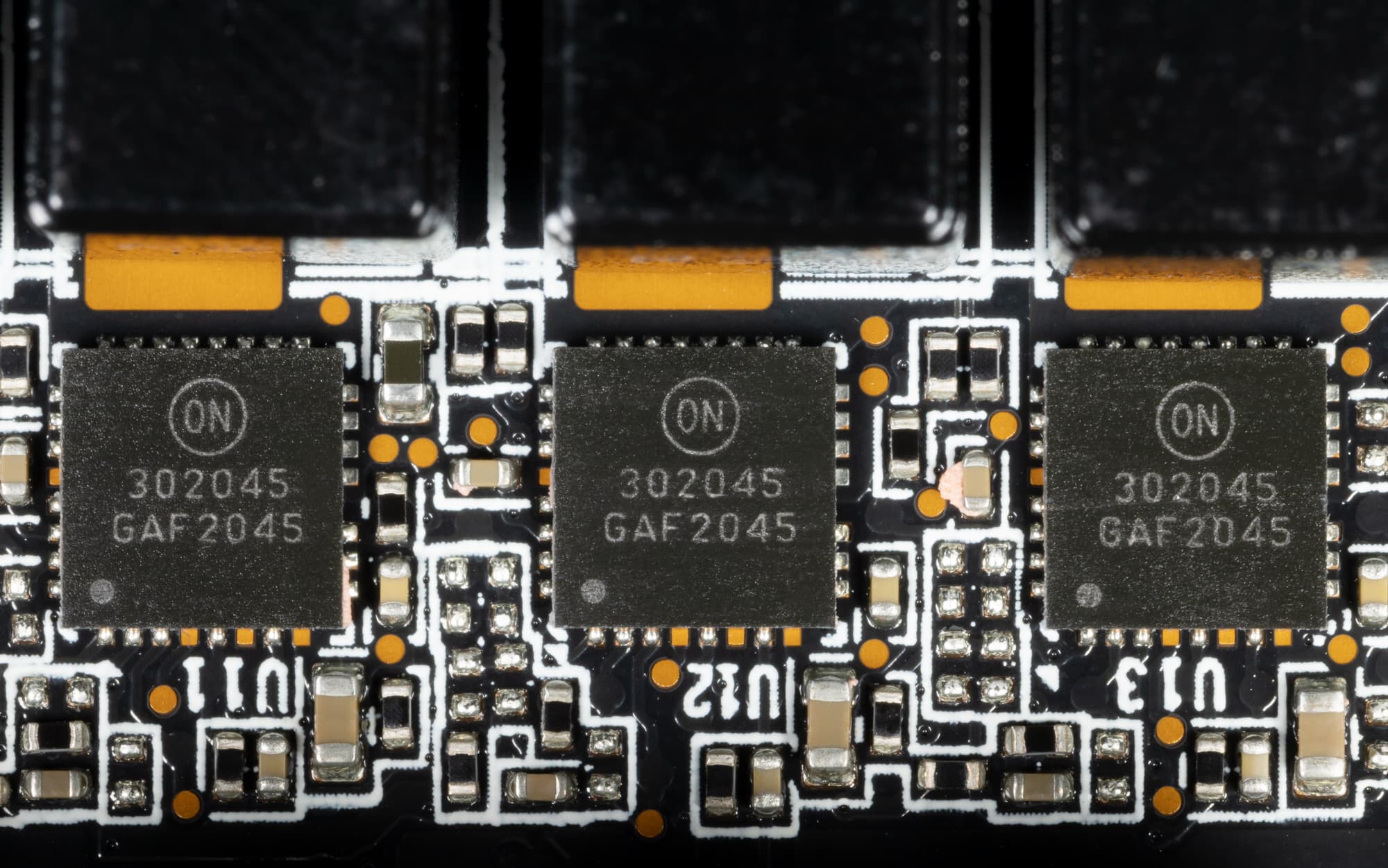 В преобразователе питания, традиционно для всех видеокарт Nvidia, используются транзисторные сборки DrMOS — в данном случае мосфеты схемы питания GPU NCP302045 (On Semiconductor) и мосфеты схемы питания памяти SM7342EKKP (Sinopower).