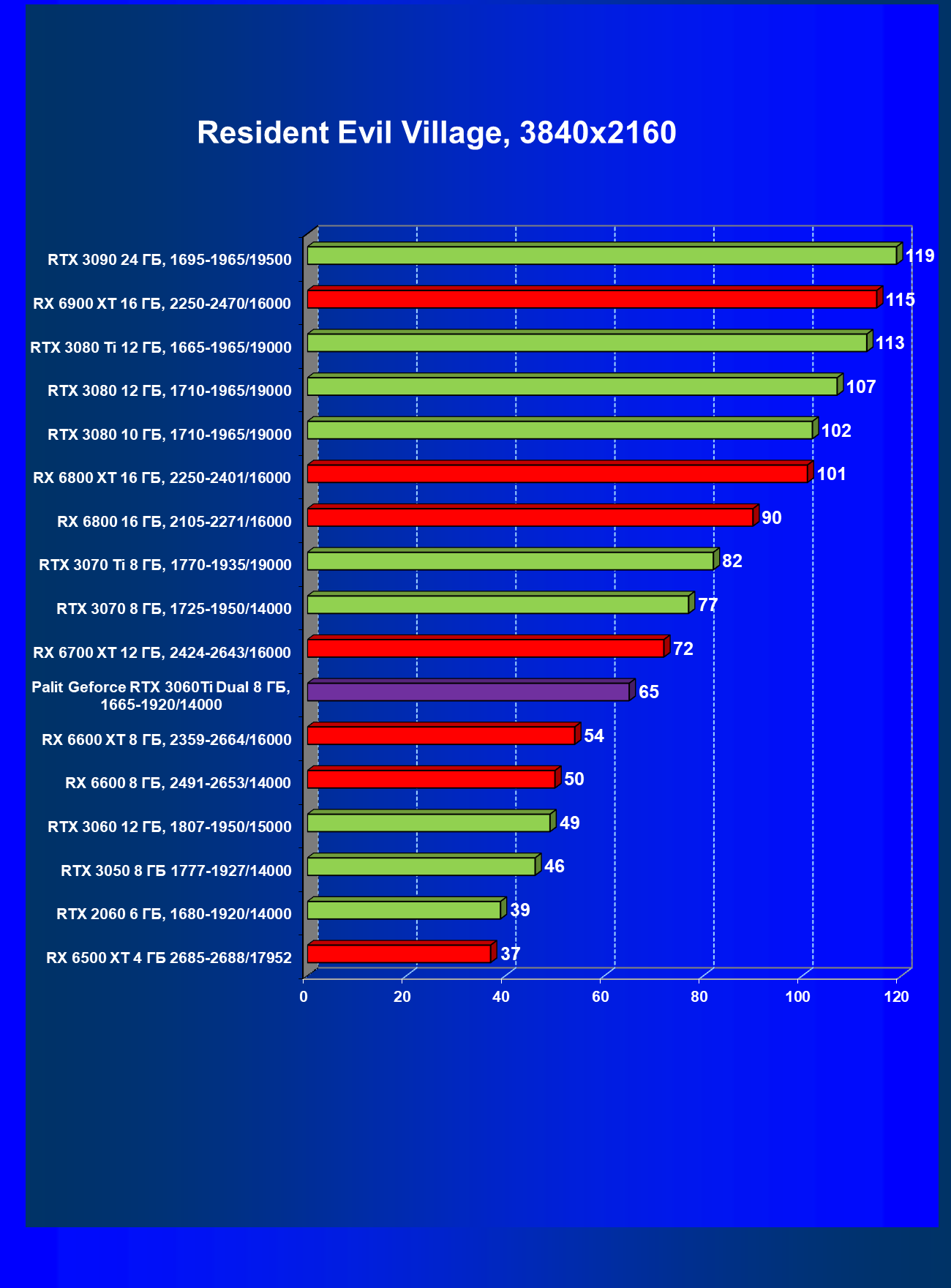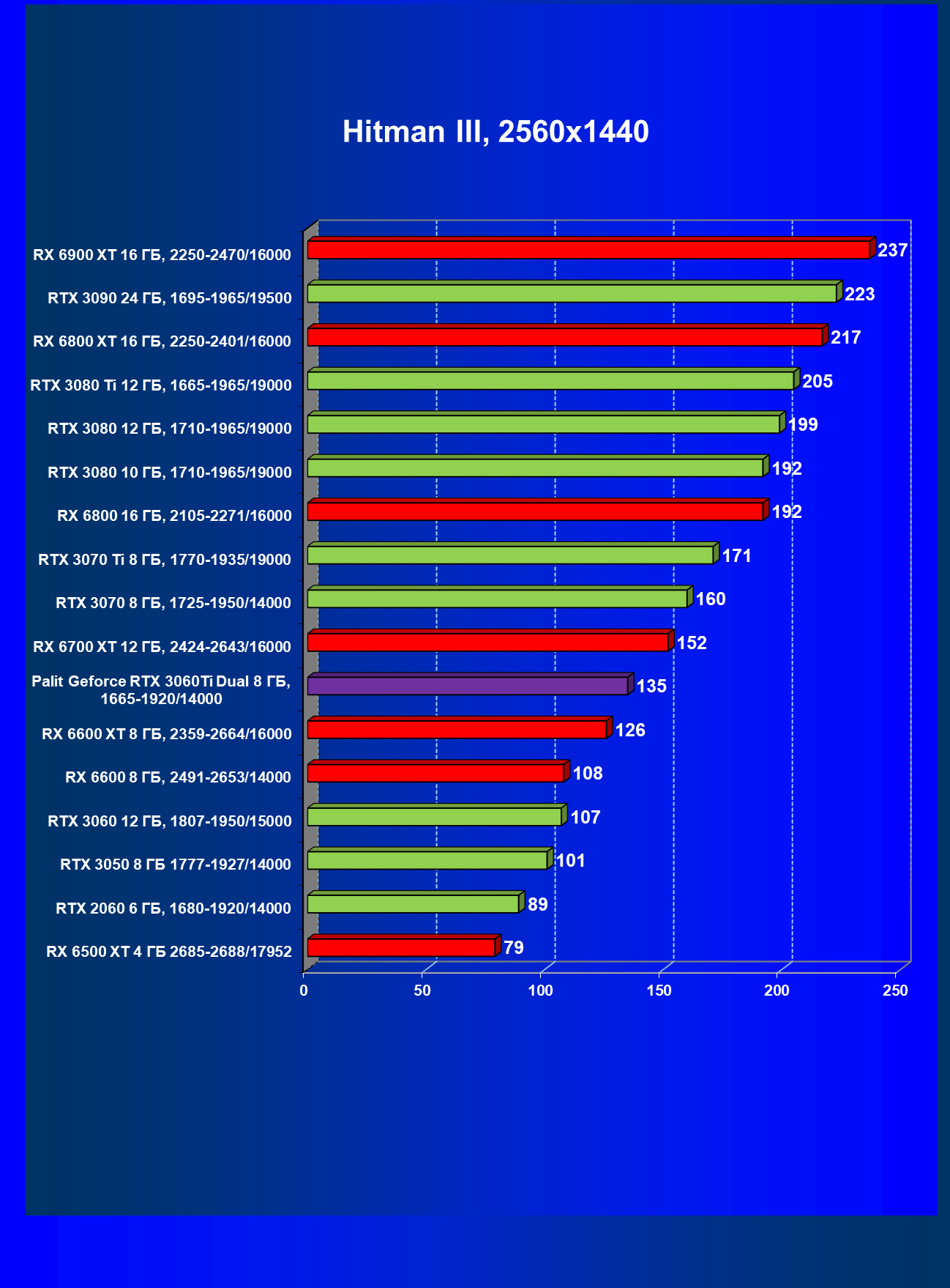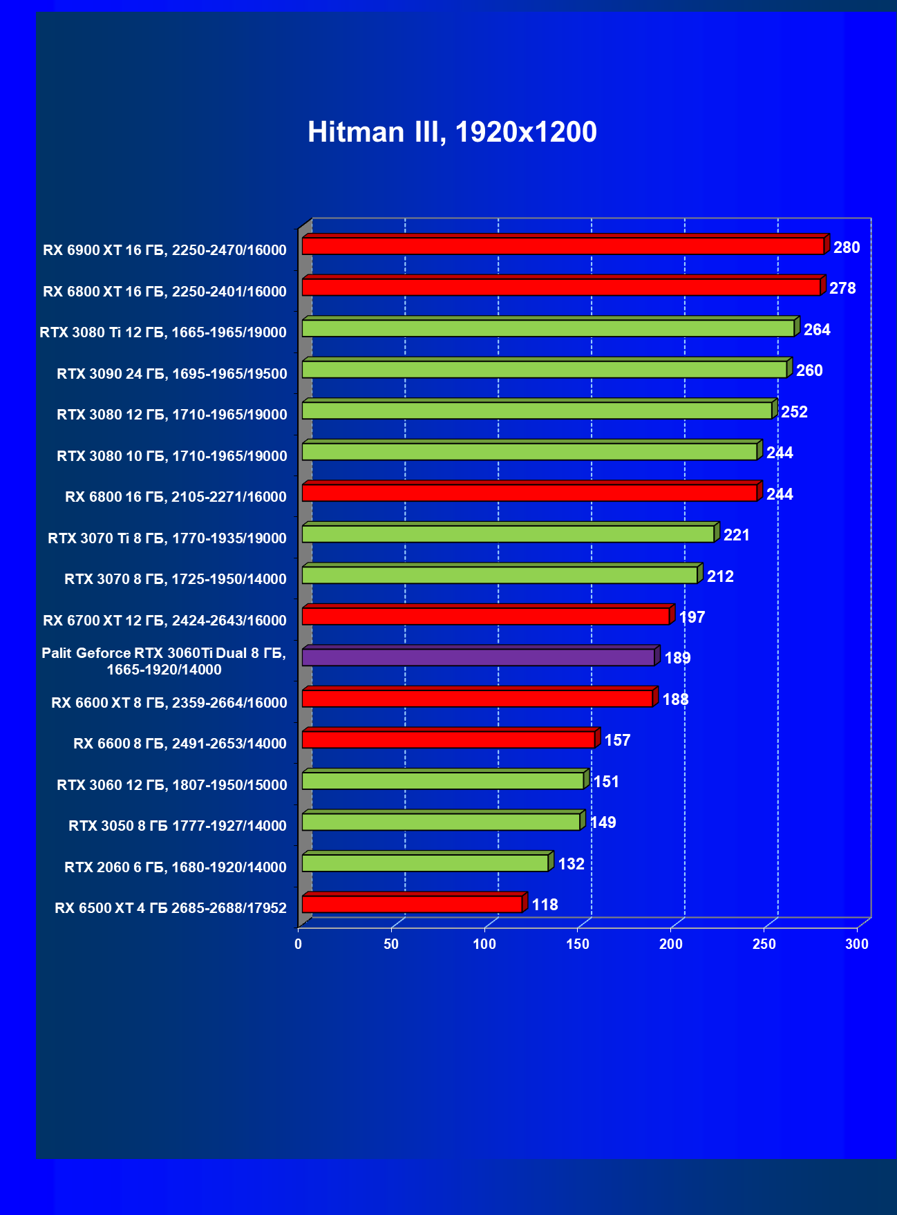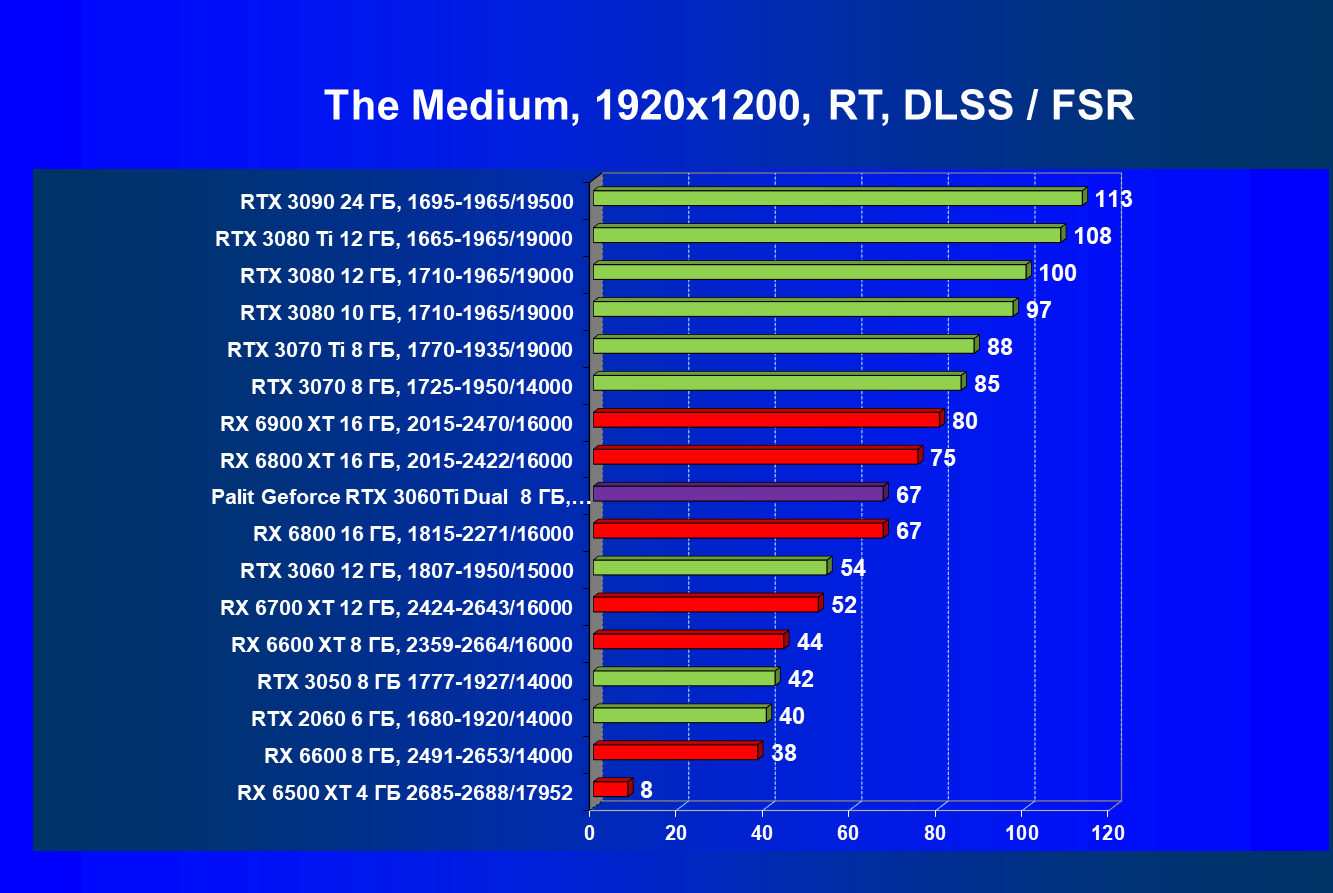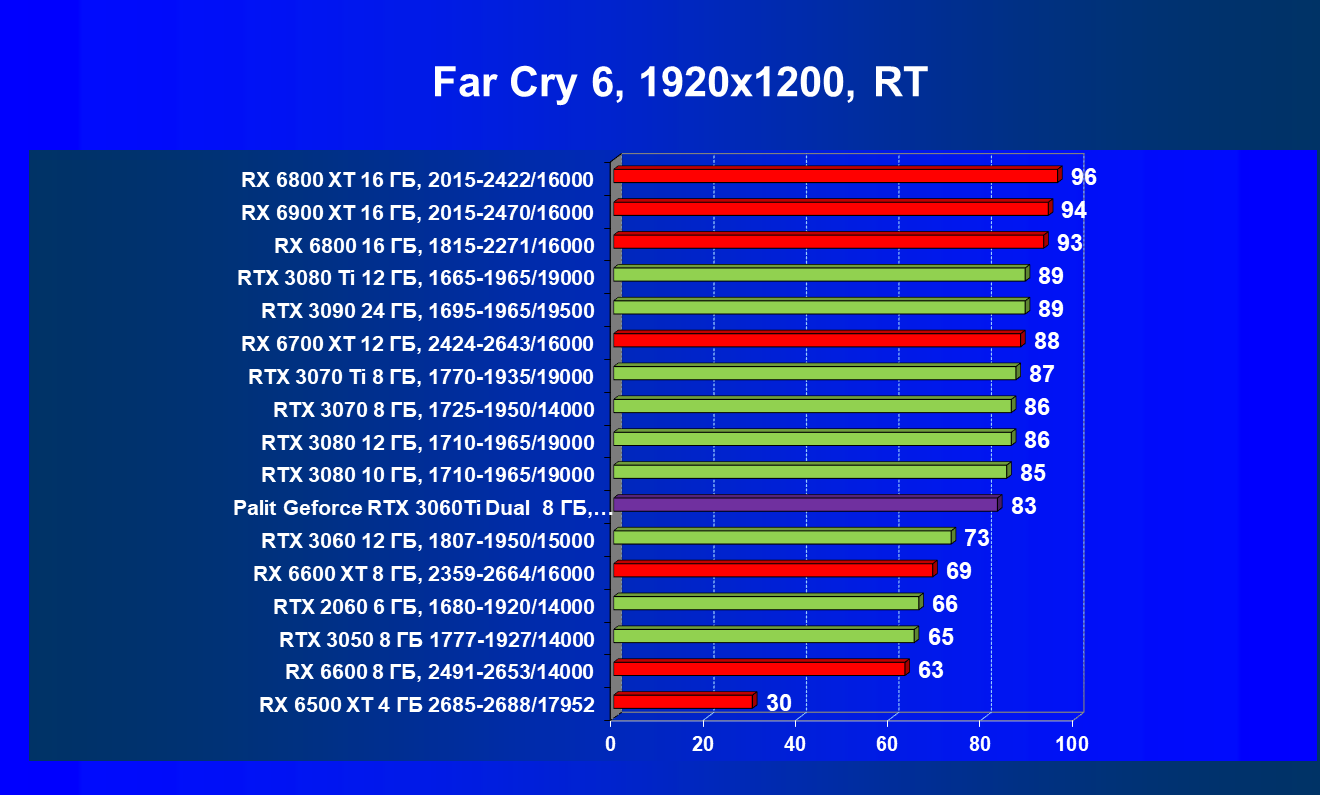 Рейтинг составлен по всем тестам без использования технологий трассировки лучей. Этот рейтинг нормирован по наиболее слабому ускорителю из группы карт — Radeon RX 6500 XT (то есть сочетание скорости и функций Radeon RX 6500 XT приняты за 100%). Рейтинги ведутся по 17 периодически исследуемым нами акселераторам в рамках проекта Лучшая видеокарта месяца. В данном случае из общего списка выбрана группа карт для анализа: GeForce RTX 3060 Ti и его конкуренты. Сам GeForce RTX 3060 Ti представлен картой Palit.