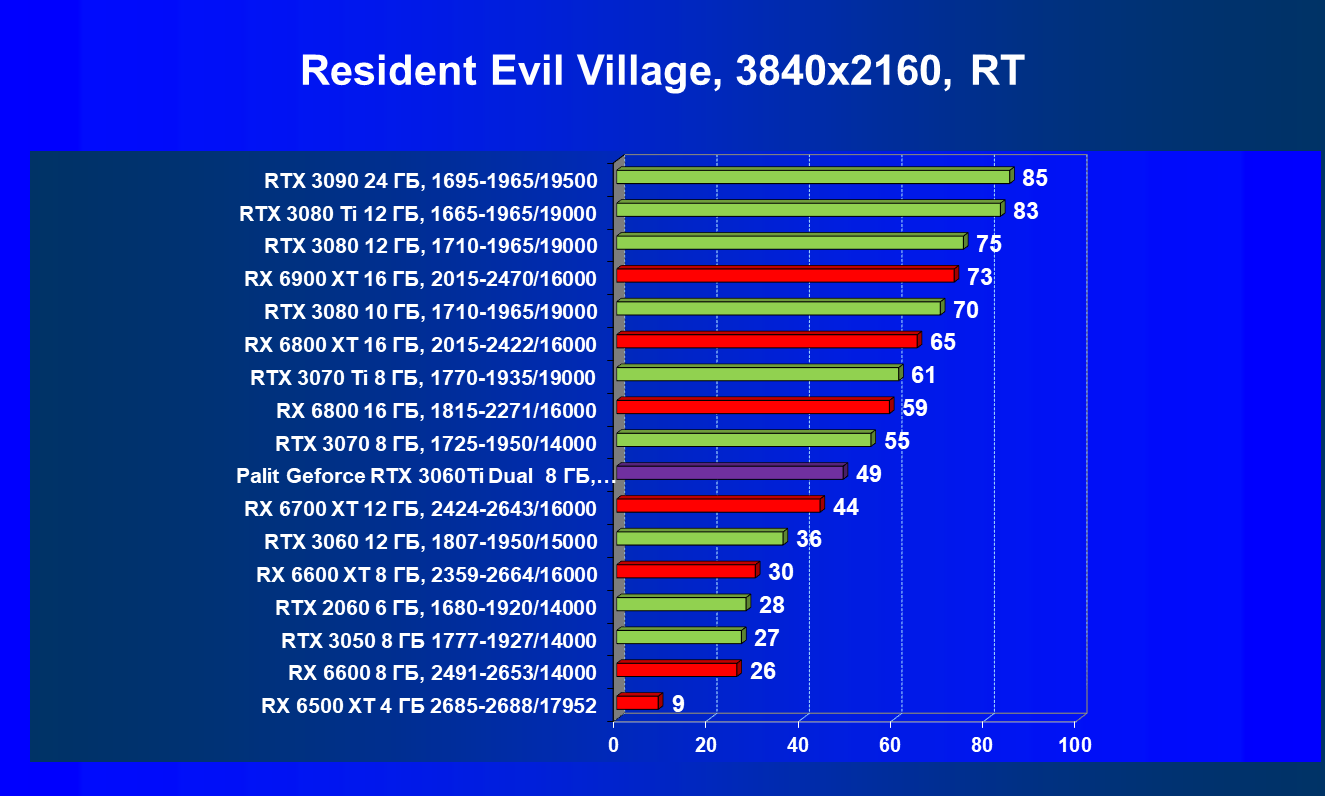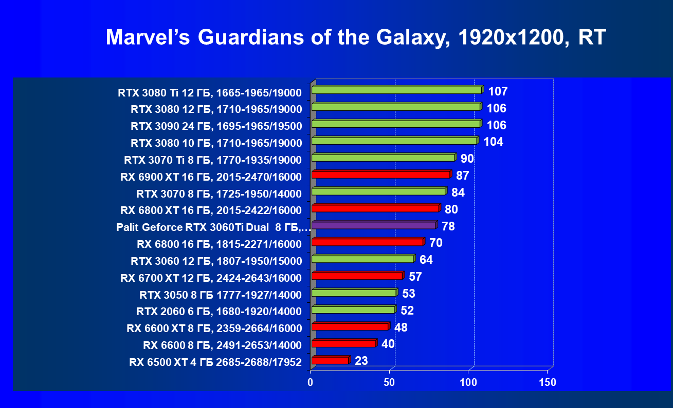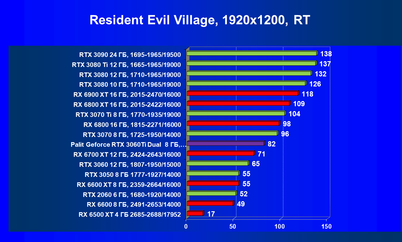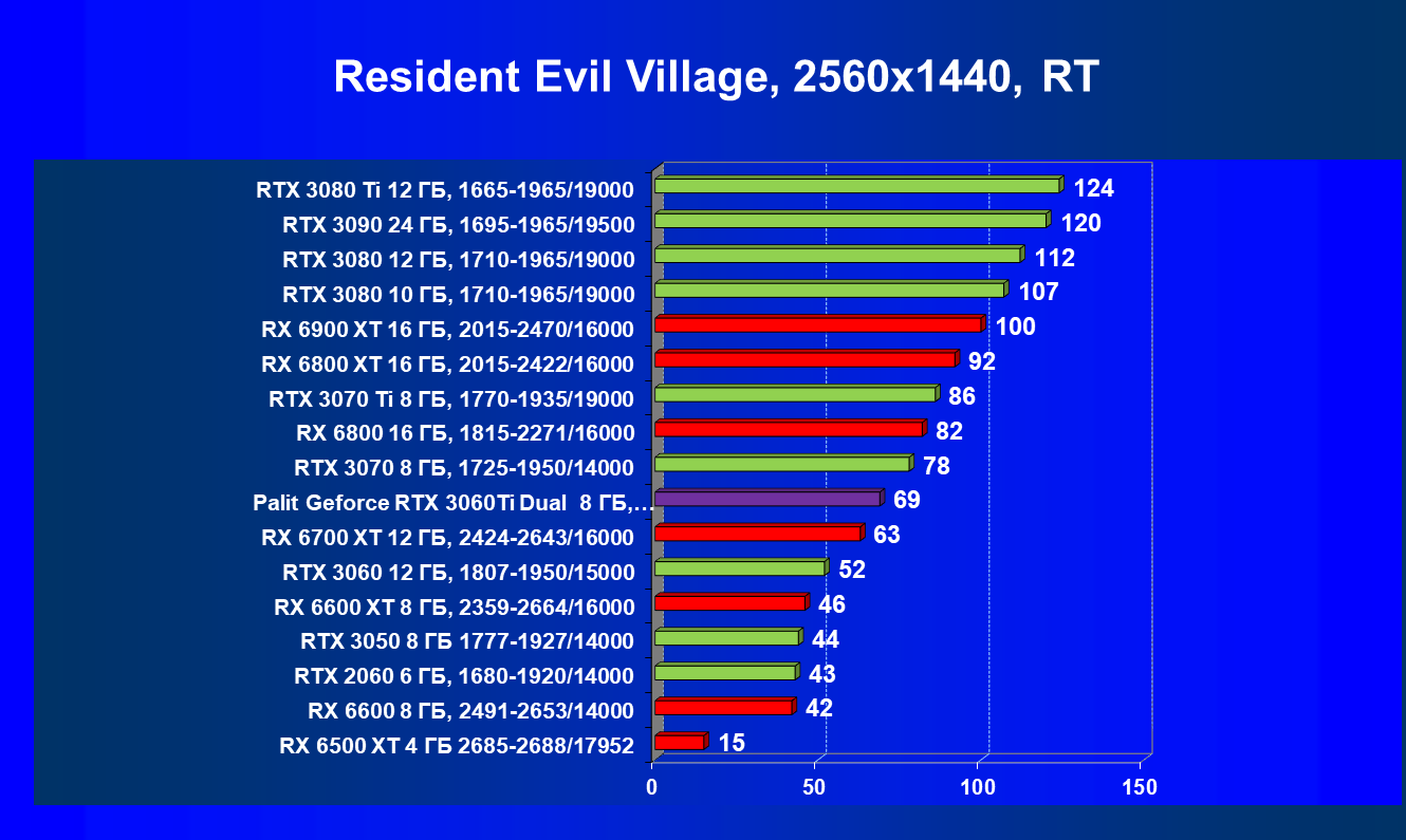 Здесь карта Palit уже обошла конкурента, которому даже поддержка FSR в ряде игр не помогает компенсировать сильное падение производительности от включения трассировки лучей.