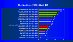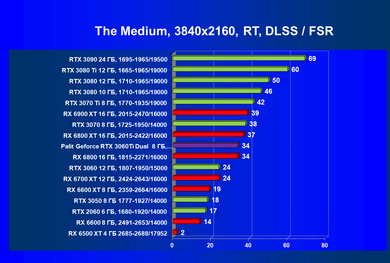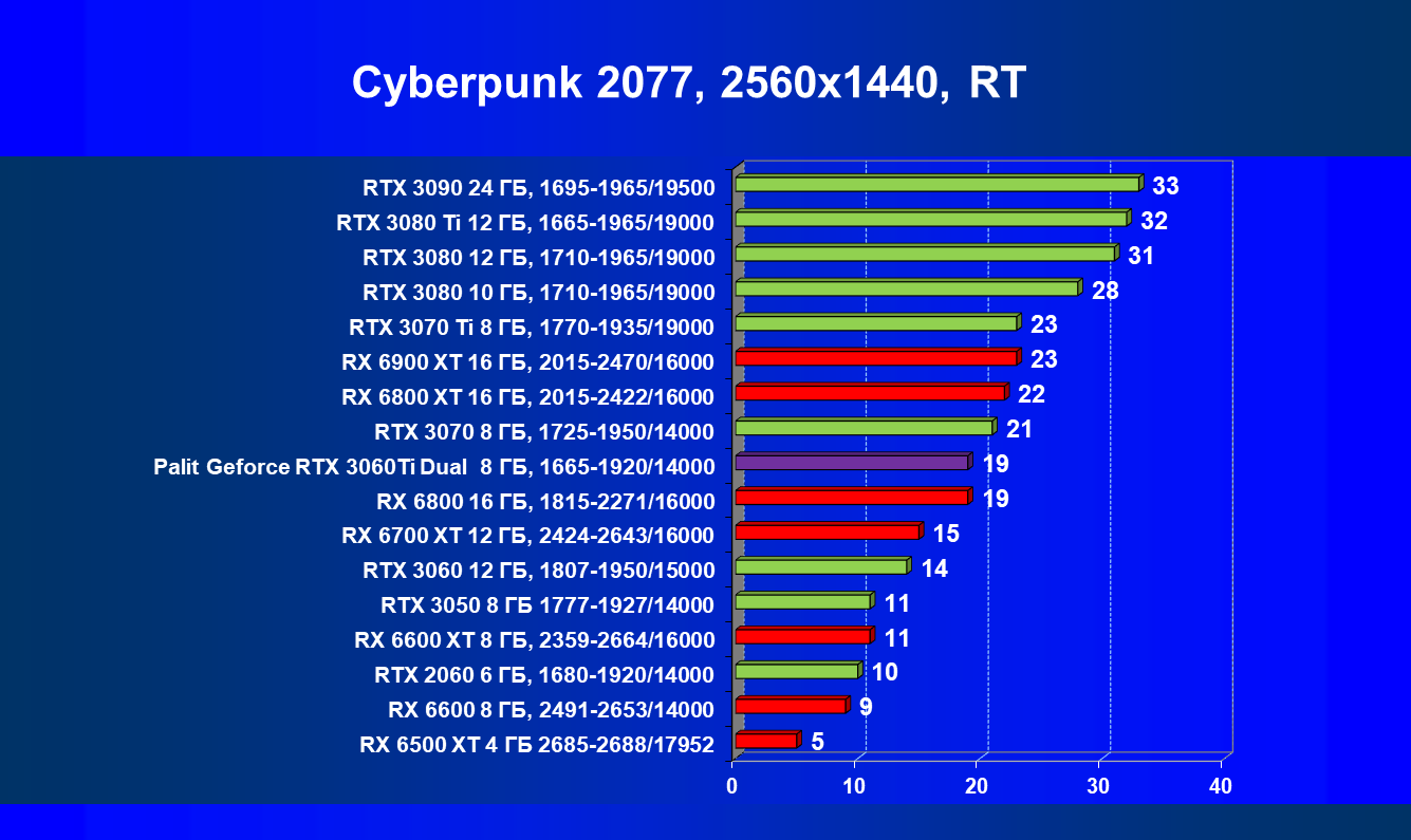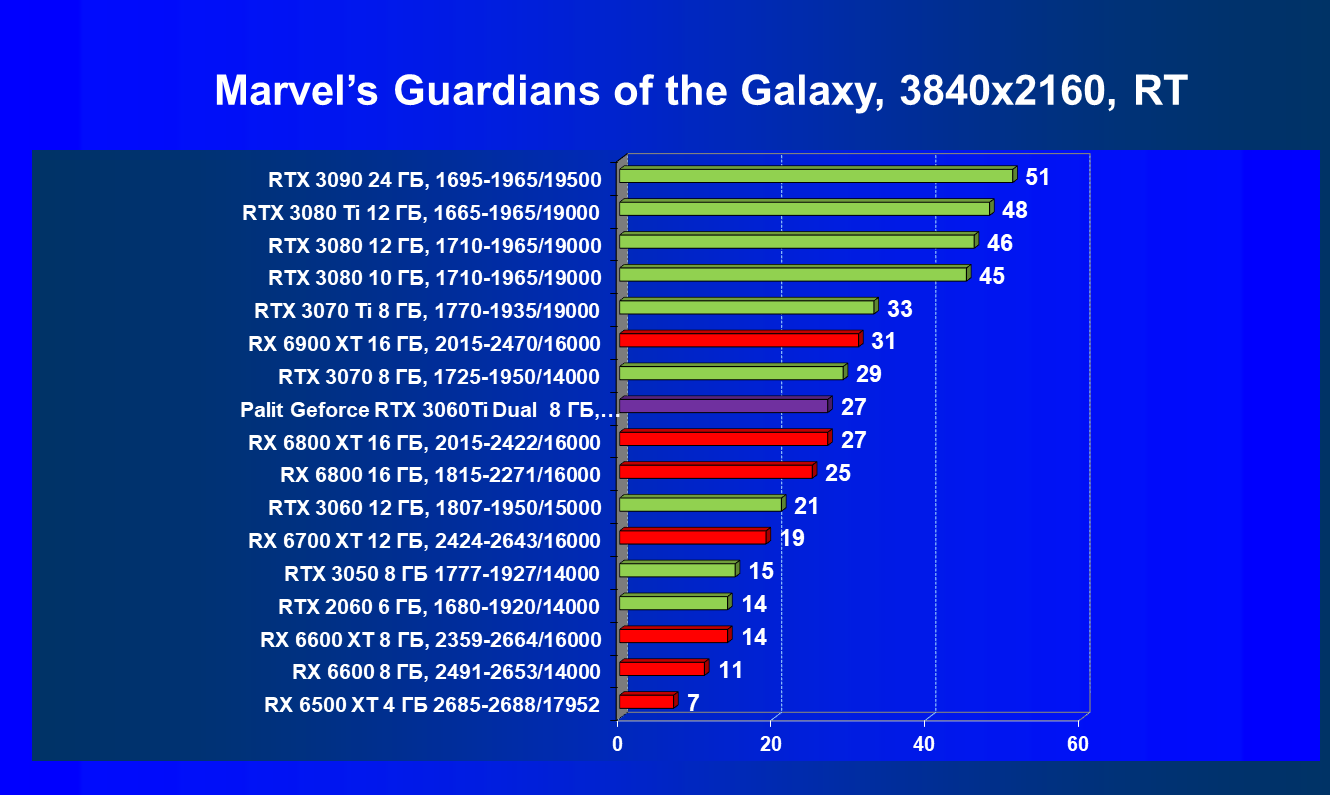 Здесь карта Palit уже обошла конкурента, которому даже поддержка FSR в ряде игр не помогает компенсировать сильное падение производительности от включения трассировки лучей.