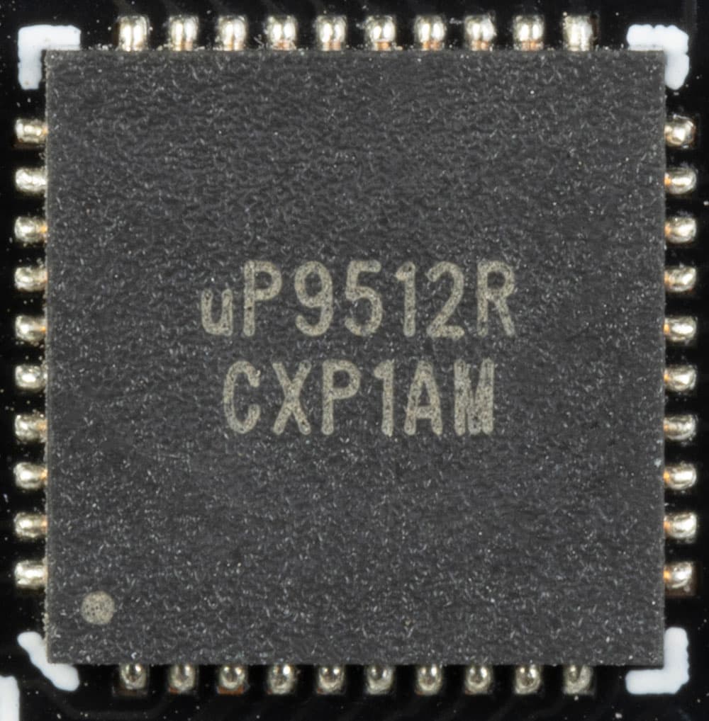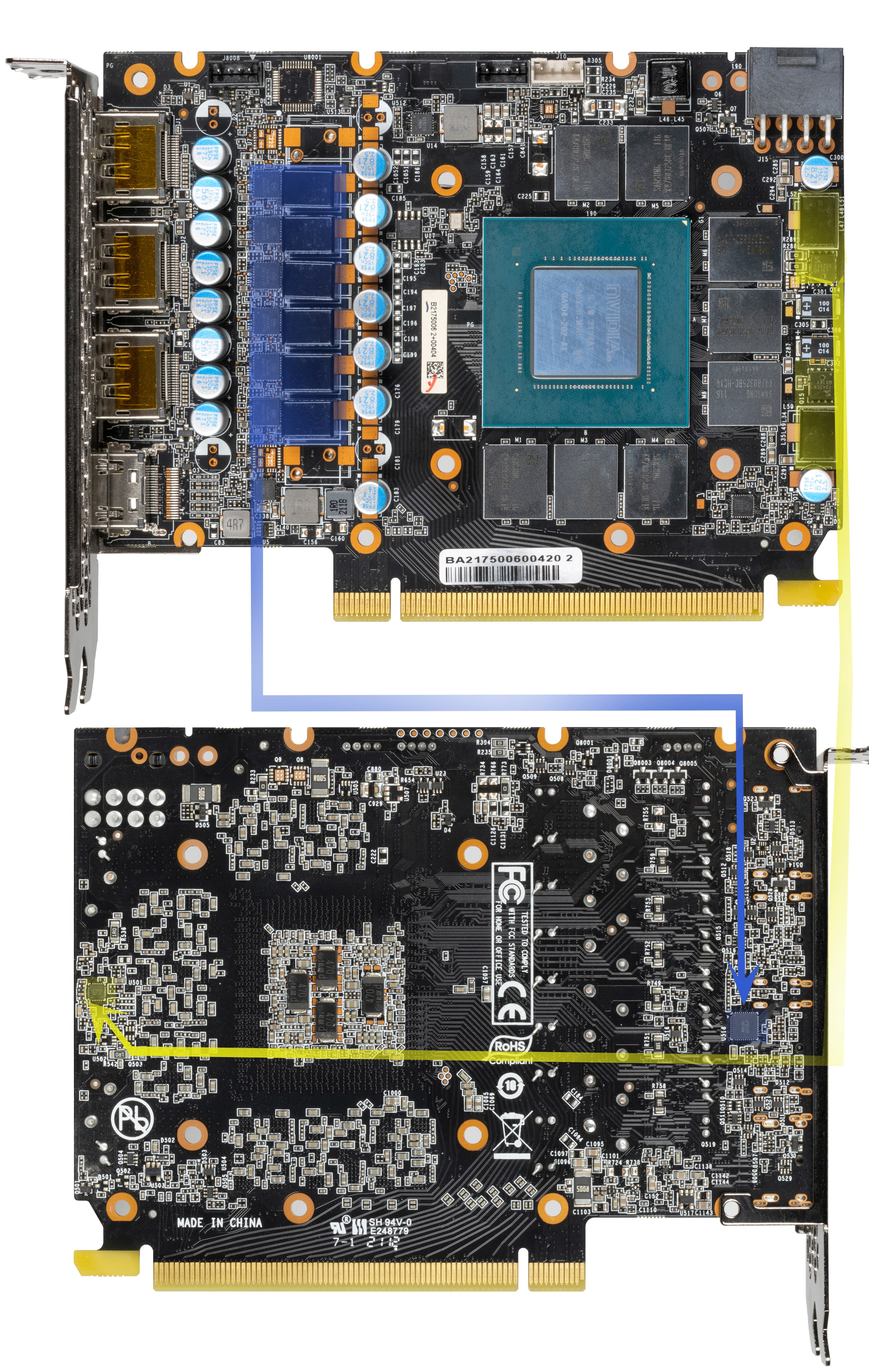 Синим цветов отмечены фазы питания графического процессора (ГП), а желтым — памяти. Для управления схемой питания ядра используется ШИМ-контроллер uP9512R (uPI Semiconductor), расположенный на тыльной стороне платы. Справа от ГП расположены 2 фазы на память, слева — 6 фаз питания ядра.