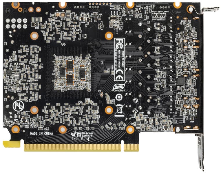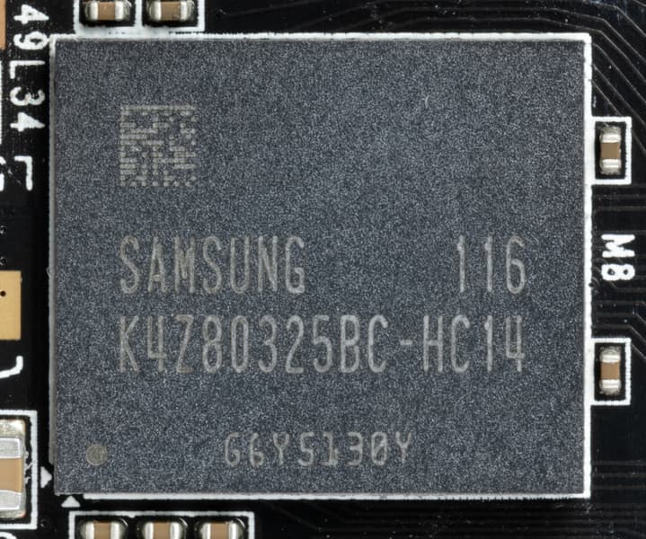 Карта имеет 8 ГБ памяти GDDR6 SDRAM, размещенной в 8 микросхемах по 8 Гбит на лицевой стороне PCB. Микросхемы памяти Samsung (GDDR6, K4Z80325BC-HC14) рассчитаны на условную номинальную частоту работы в 3500 (14000) МГц.