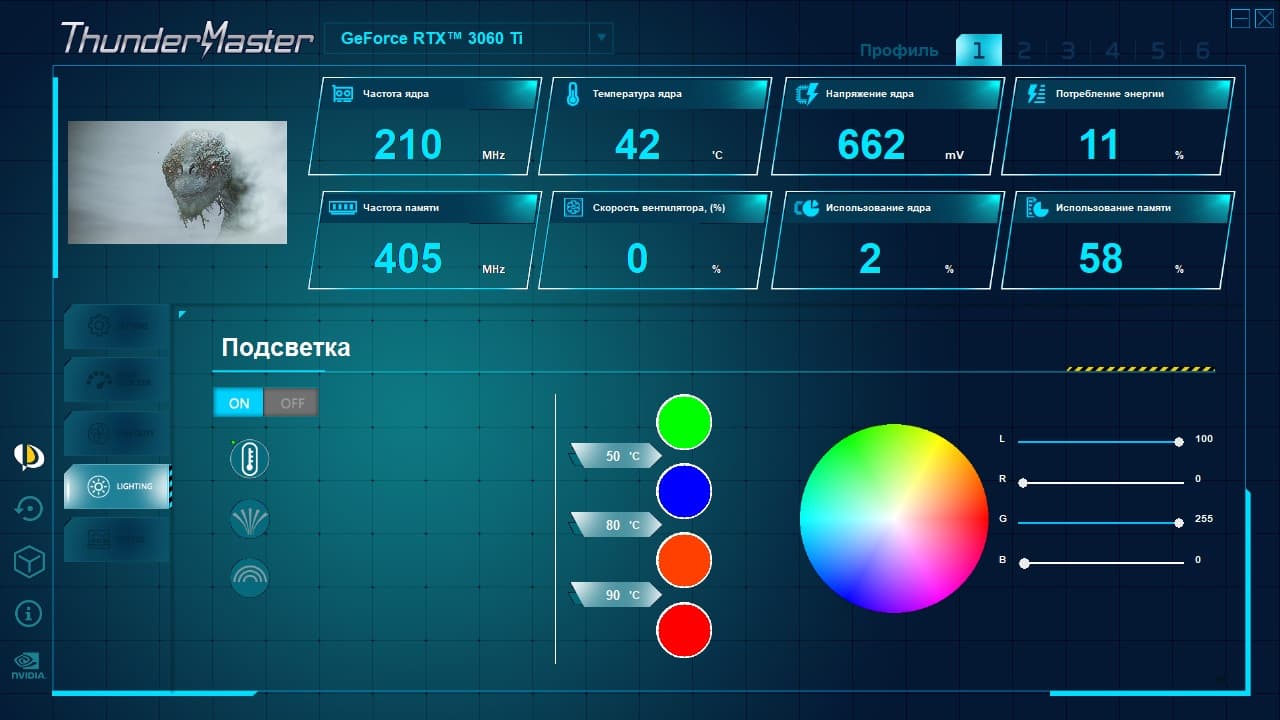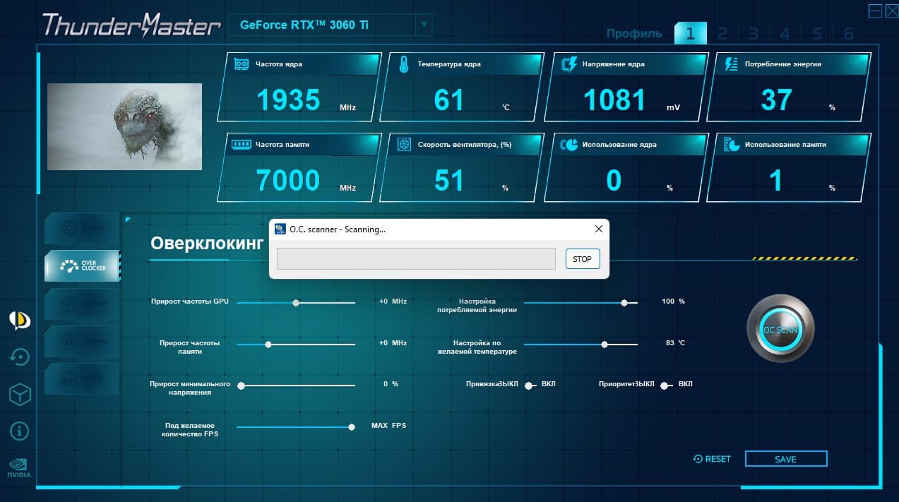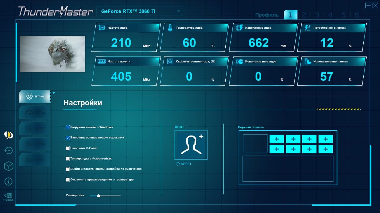 Для управления работой картой компания Palit предлагает утилиту собственной разработки — Thunder Master. Это приятная в использовании программа, в которой можно изменить даже аватарку. Разумеется, с помощью этой утилиты можно настраивать частоты работы карты, обороты вентиляторов, следить за данными мониторинга.