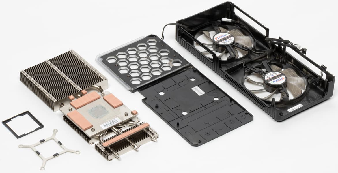 Основной пластинчатый радиатор, выполненный из медного сплава, имеет тепловые трубки, подведенные к теплосъемнику для охлаждения GPU и микросхем памяти.