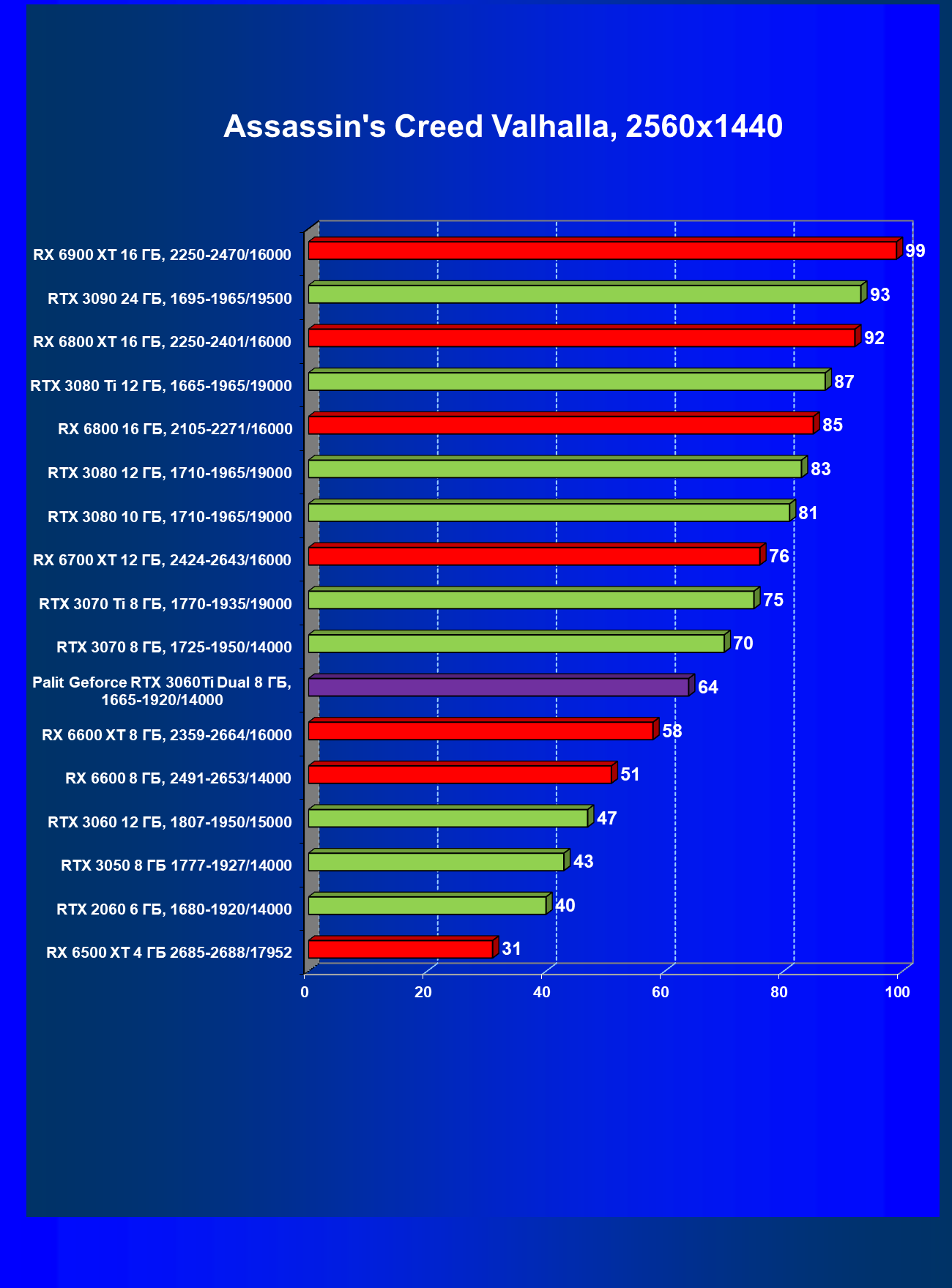 Рейтинг составлен по всем тестам без использования технологий трассировки лучей. Этот рейтинг нормирован по самому слабому ускорителю — Radeon RX 6500 XT (то есть сочетание скорости и функций Radeon RX 6500 XT приняты за 100%). В данном случае из общего списка выбрана группа карт для анализа, в которую входят GeForce RTX 3060 Ti и его конкуренты.
