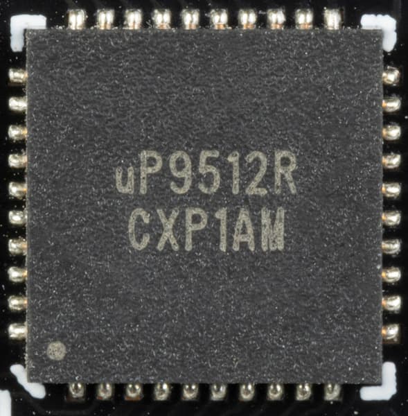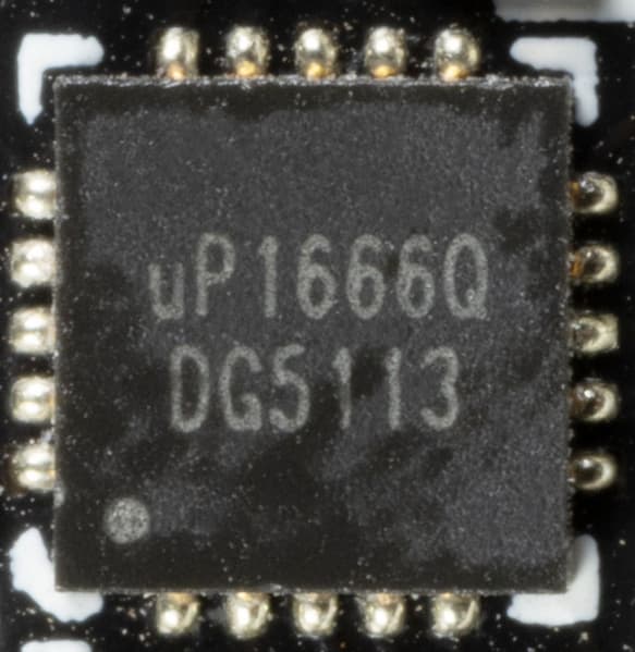 На той же стороне имеется ШИМ-контроллер uP1666Q (uPI Semiconductor), который управляет двухфазной схемой питания микросхем памяти.