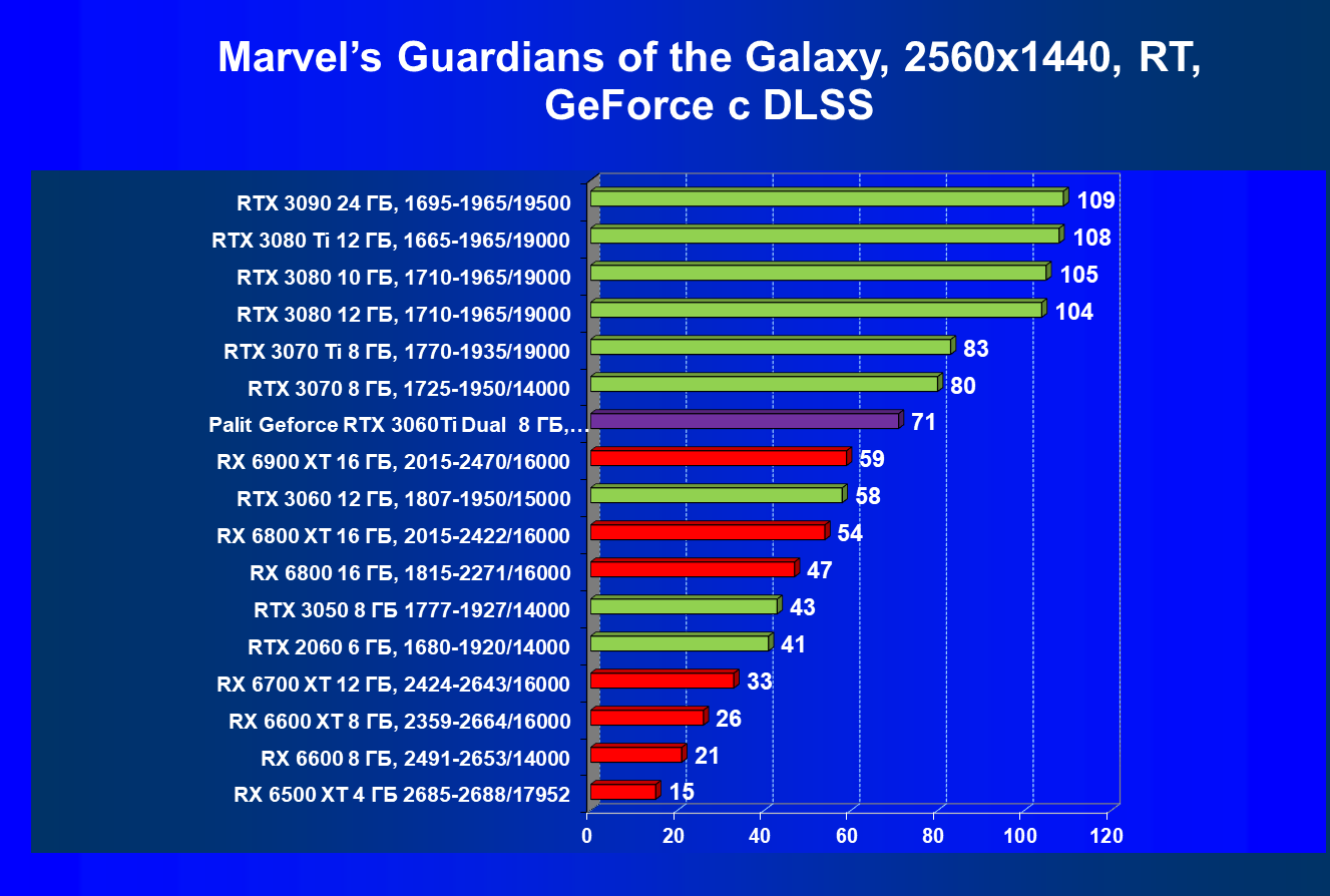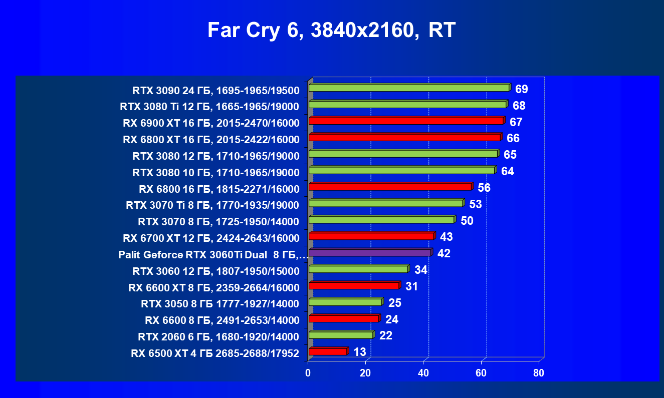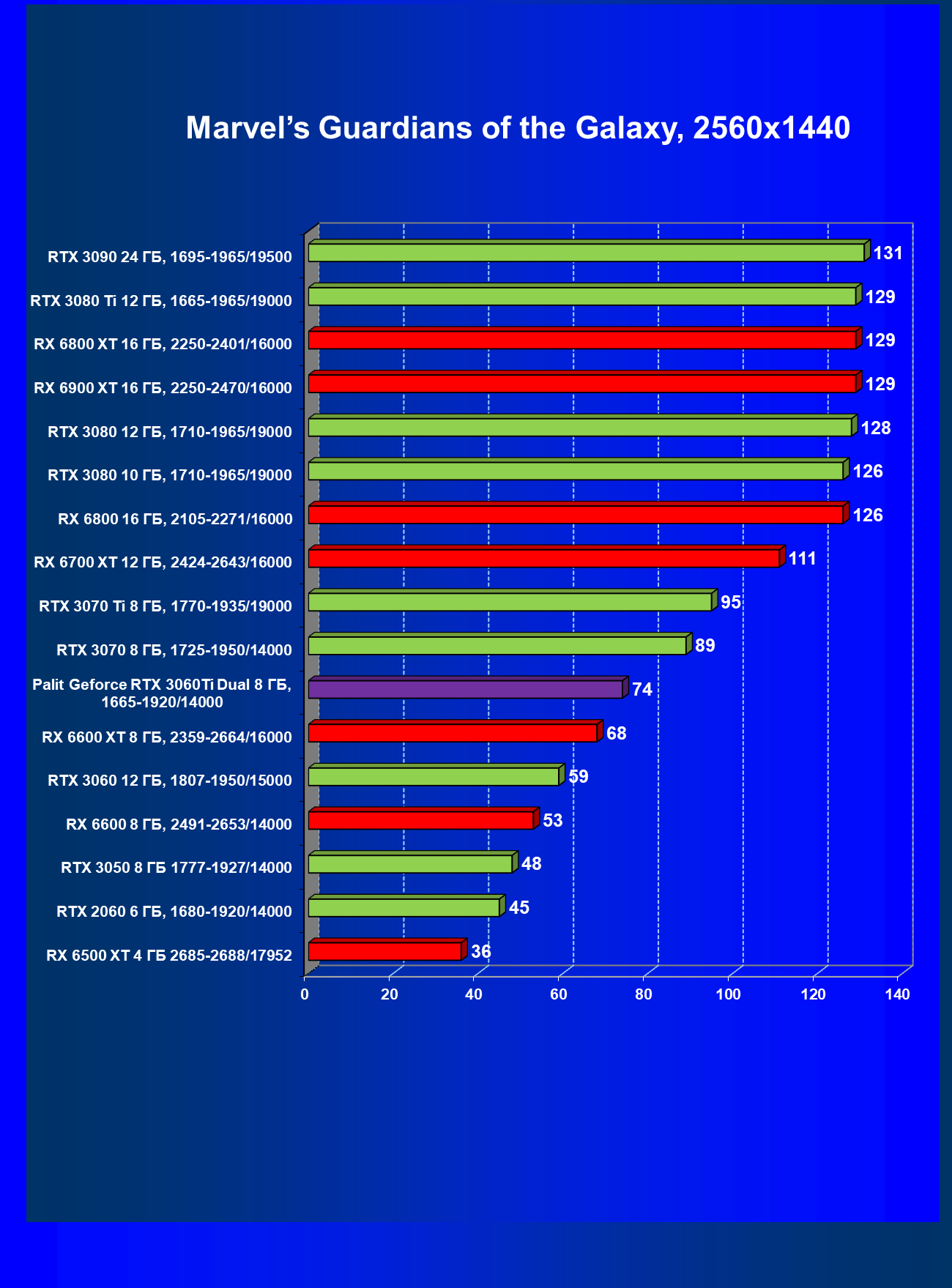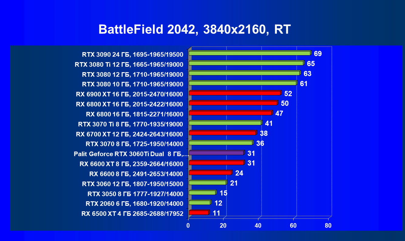 | 14 | RX 6600 8 ГБ, 2491—2653/14000 | 180 | 31 | 59 000 |