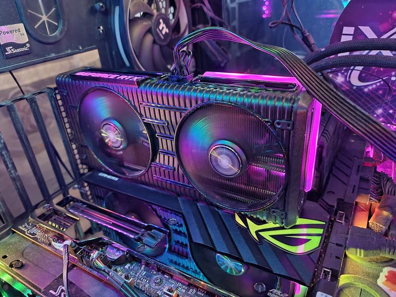 У обозреваемой карты светится надпись GeForce RTX на верхнем торце кожуха, а также имеется подсветка по периметру продуваемой насквозь области. Подсветка настраивается с помощью фирменной утилиты (см. выше).