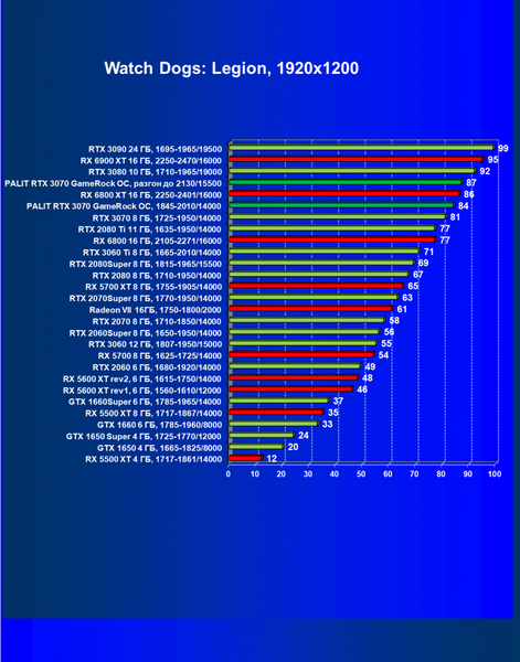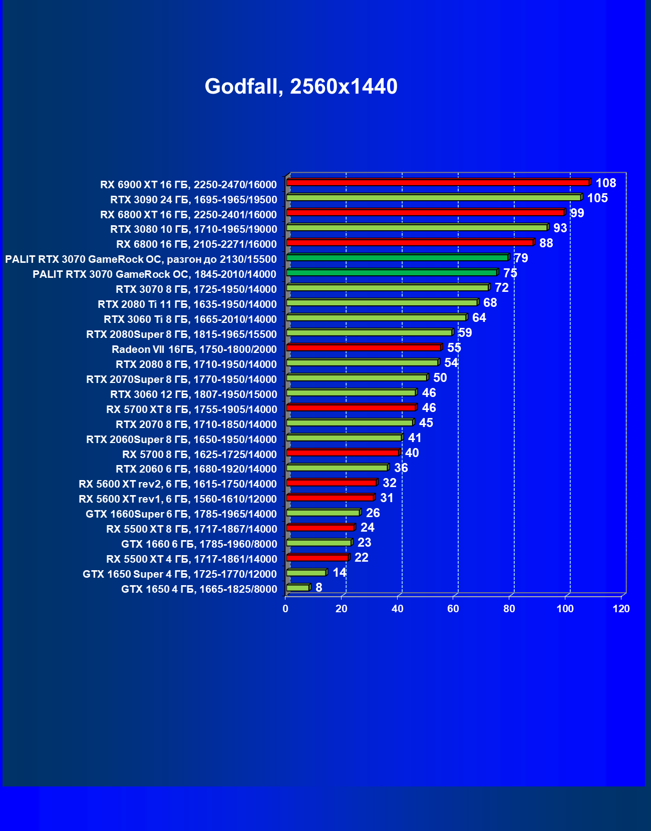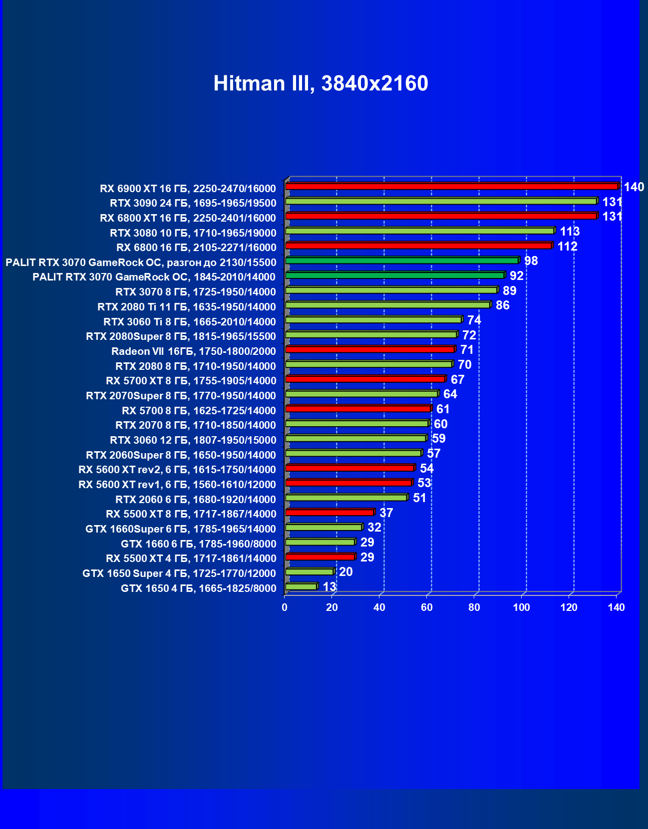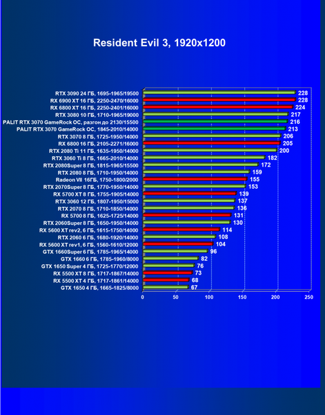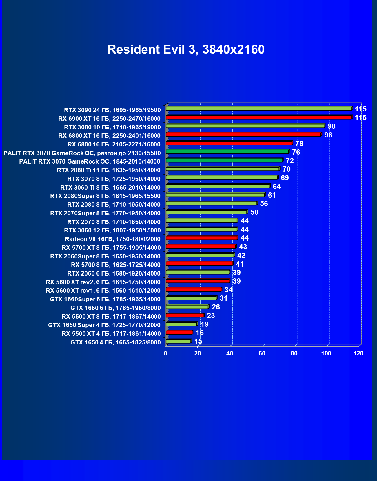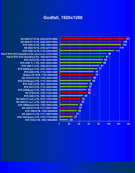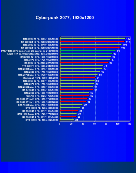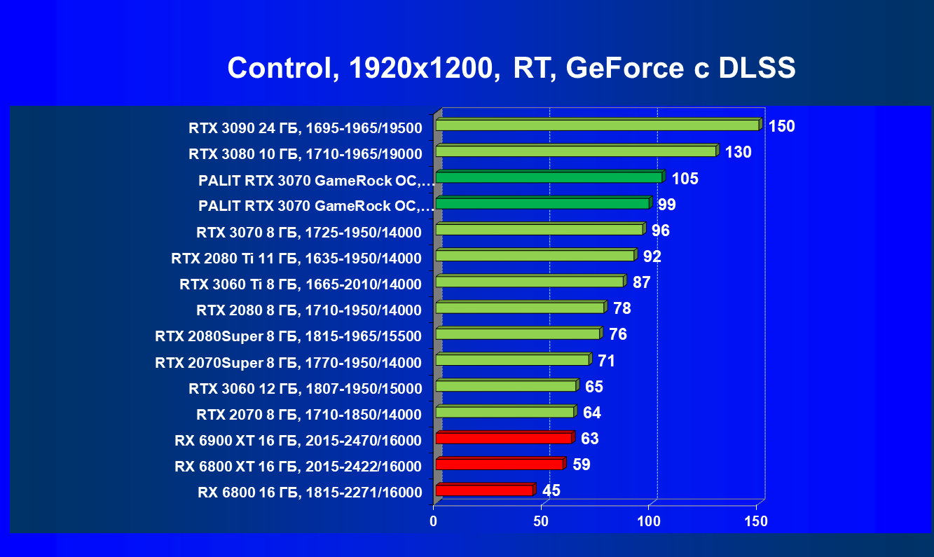 Всем интересующимся хорошо известно, что Radeon RX 6800 немного обходит GeForce RTX 3070 в играх с растеризацией без трассировки лучей. Небольшой фабричный разгон карты Palit не позволил ей догнать соперника, а вот с ручным разгоном карта уже заняла первое место в группе, обойдя Radeon RX 6800, который, кстати, уже можно найти дешевле, чем GeForce RTX 3070.