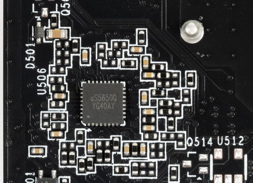 На той же задней стороне имеется ШИМ-контроллер uS5650Q (uPI), который управляет 2-фазной схемой питания микросхем памяти.