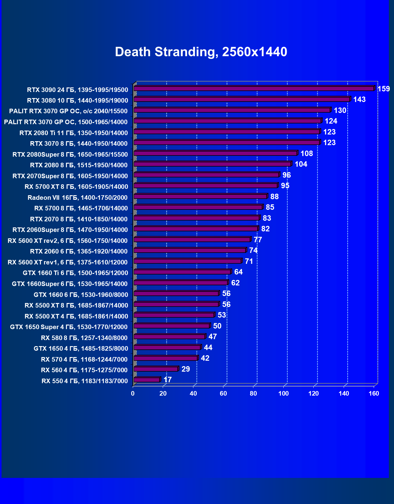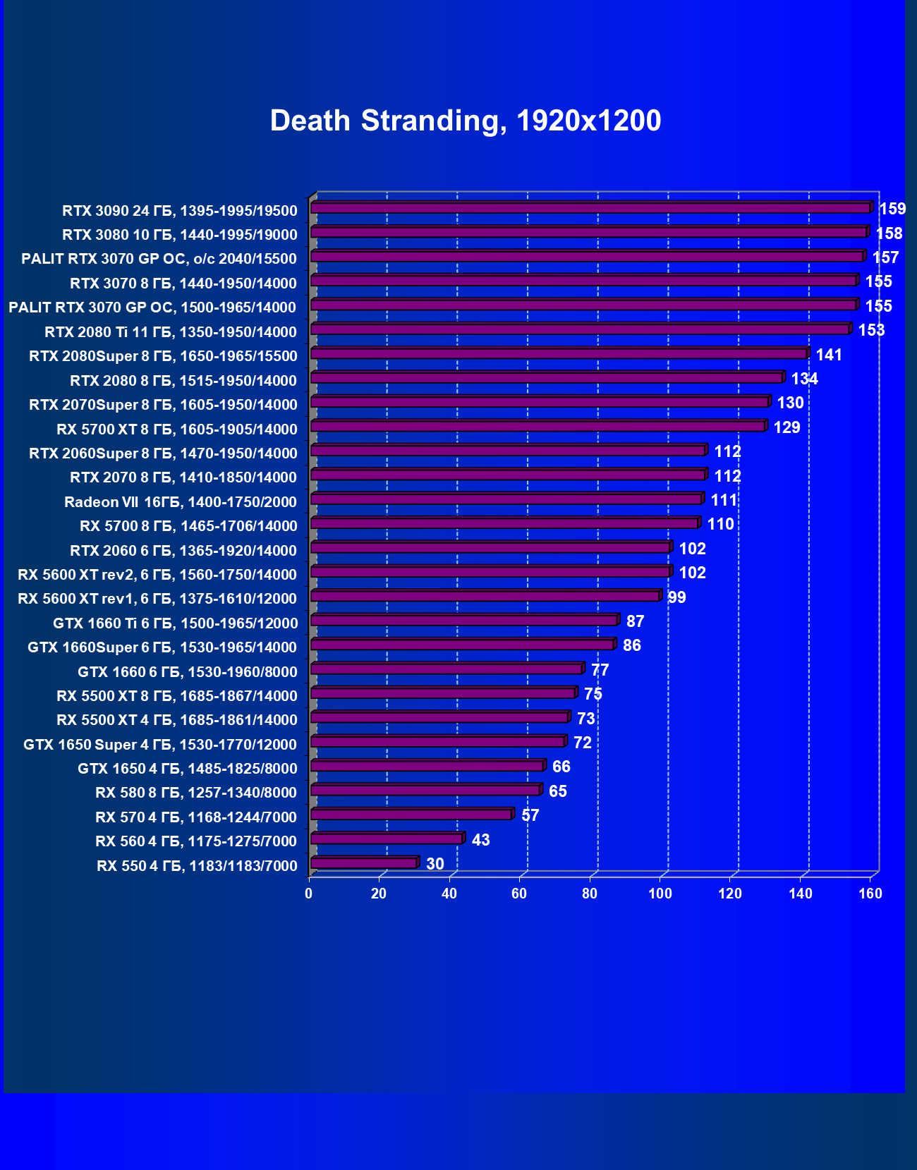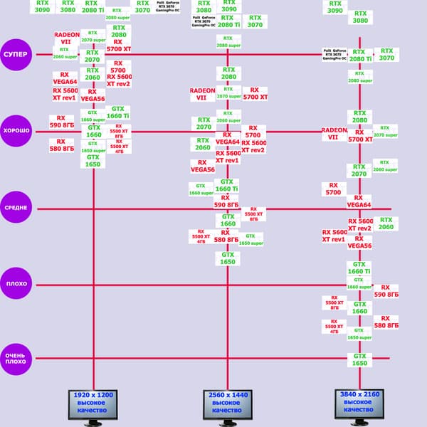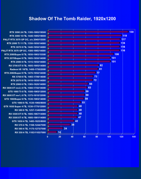 На момент подготовки обзора видеокарты GeForce RTX 3070 в продаже еще не появлялись (а GeForce RTX 3080/3090) если и появлялись, то мгновенно пропадали, так что для составления рейтинга мы вынуждены взять на всю новую линейку условные цены, исходя из рекомендованных Nvidia. И если это допущение оправдается на практике, то у GeForce RTX 3070 может быть большое будущее среди ускорителей в ценовом сегменте около 50 тысяч рублей.