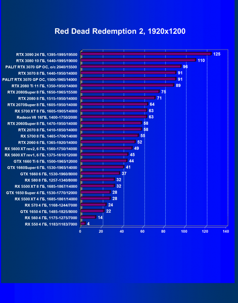 В поколении GeForce RTX 30 улучшены технологии RT (расчет освещения с помощью трассировки лучей) и DLSS (интеллектуальная реализация антиалиасинга, обсчитываемая тензорными ядрами). Поэтому дополнительно мы приводим тесты с включенной RT, а в ряде игр — и DLSS. Разумеется, в этом случае сравнивать пока придется только видеокарты Nvidia.