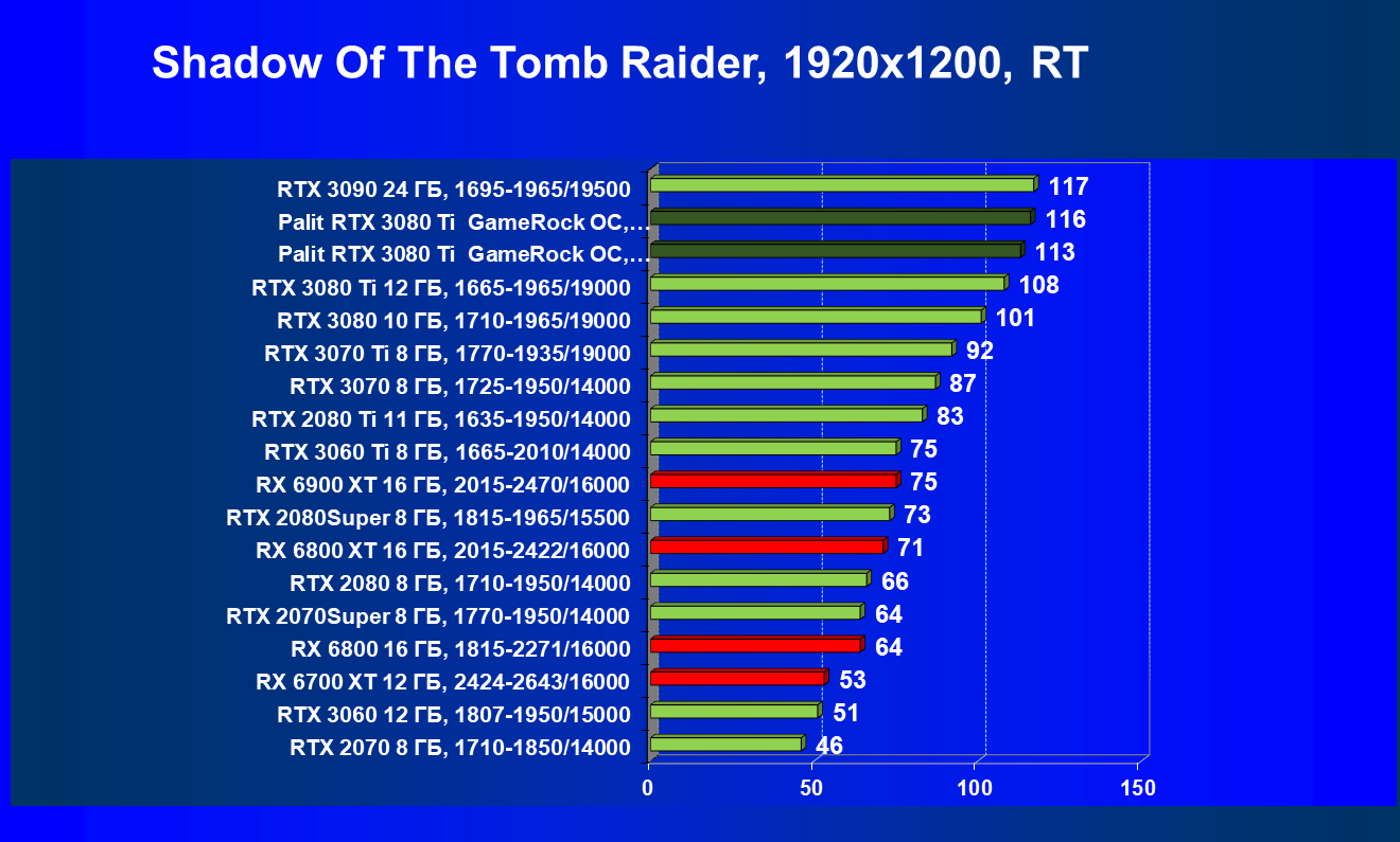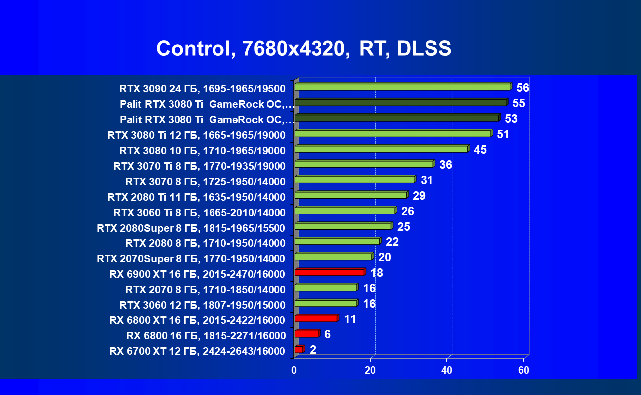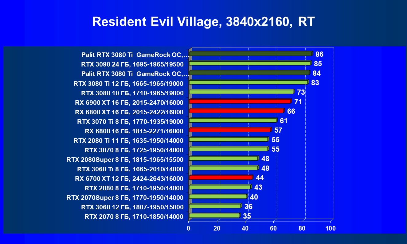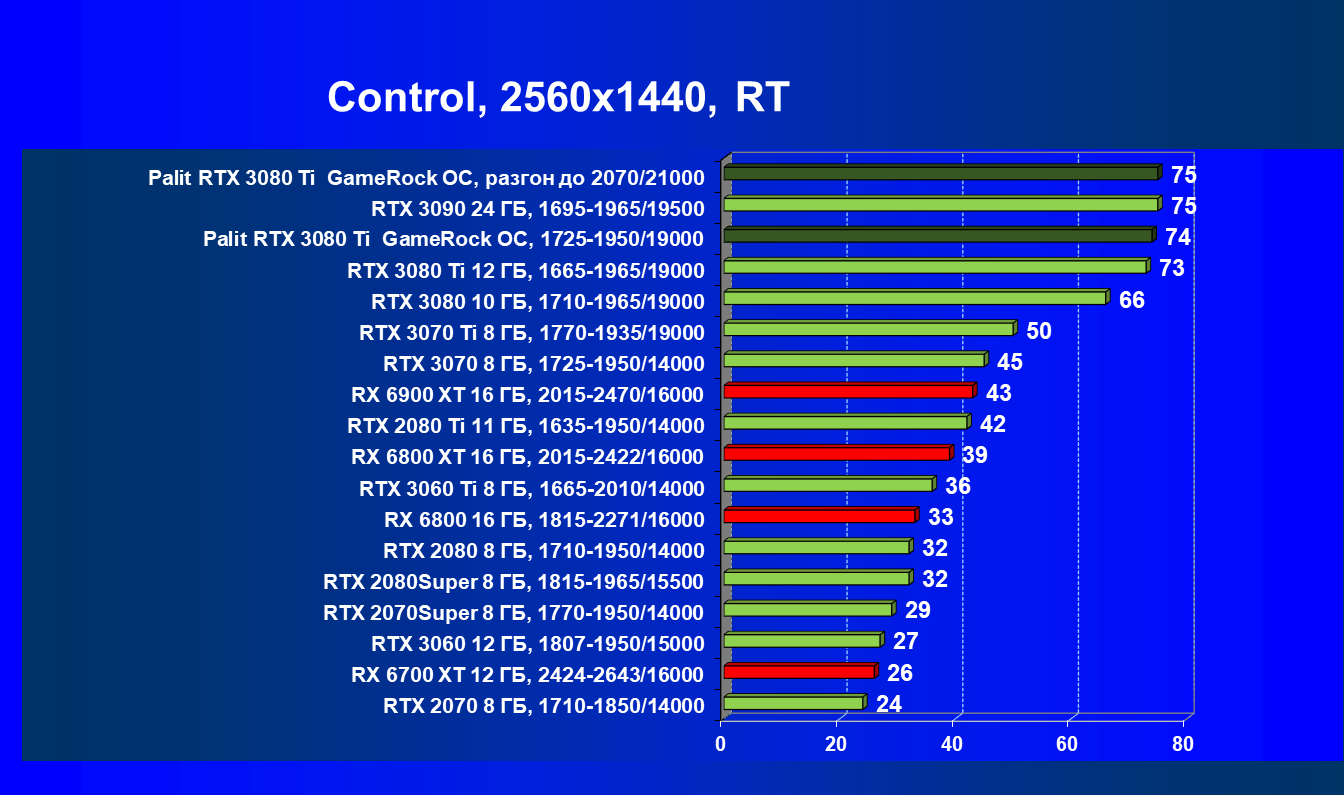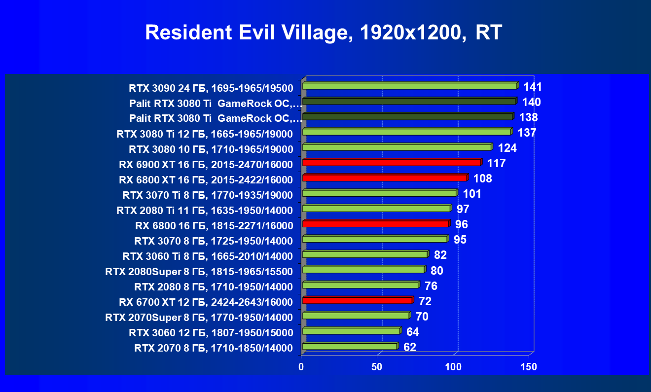 Здесь все логично: RTX 3090 находится в лидерах, за ней следует RX 6900 XT, которую уже преследует RTX 3080 Ti. Карта Palit по частотам работы практически идентична референс-аналогу, поэтому разница между ними ничтожна.