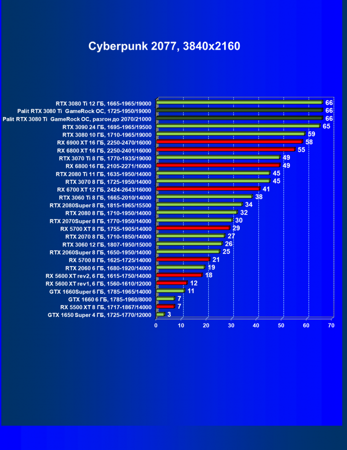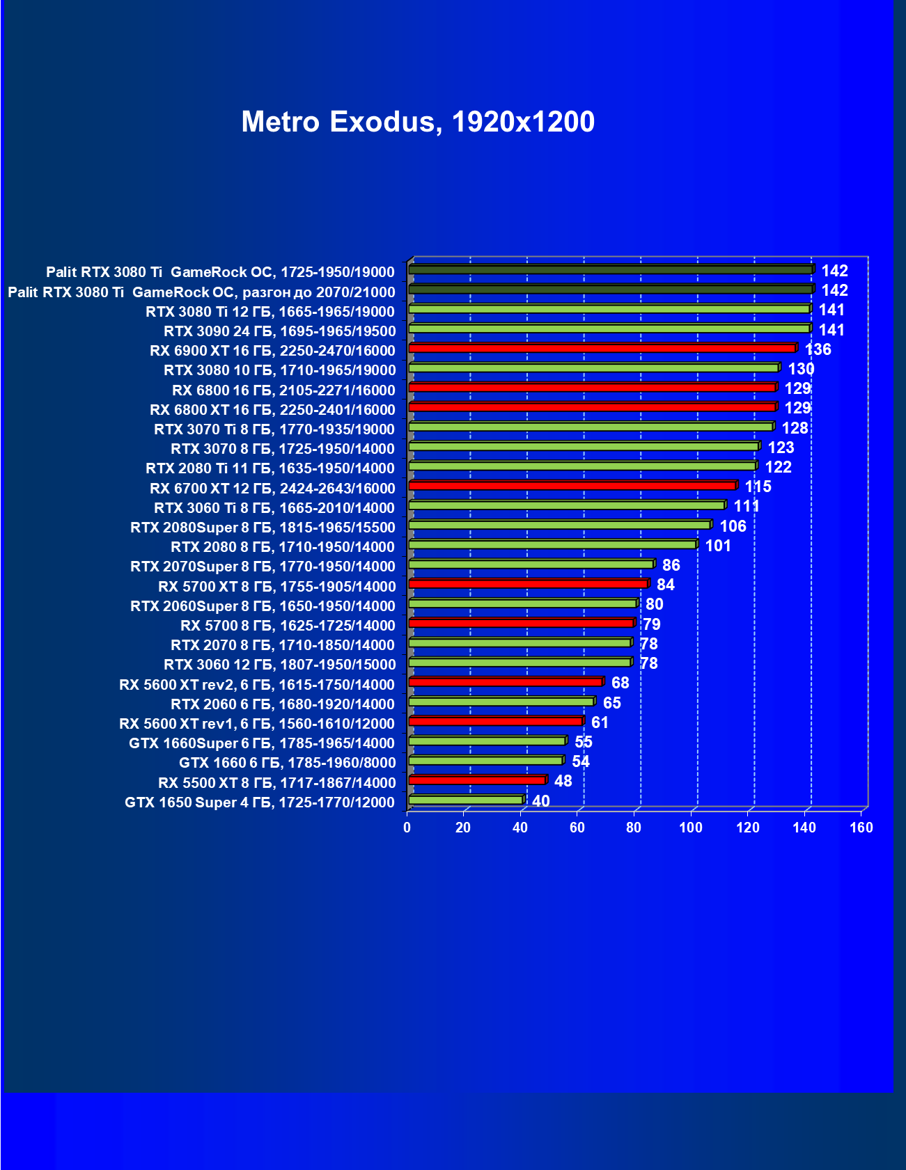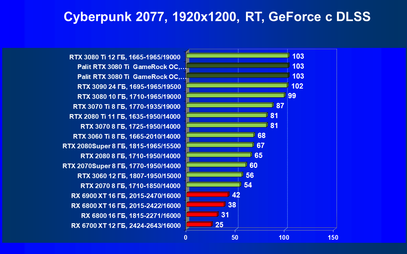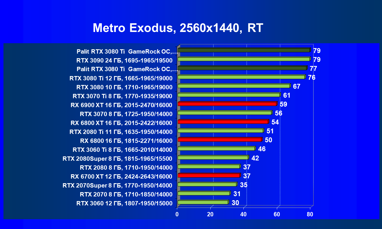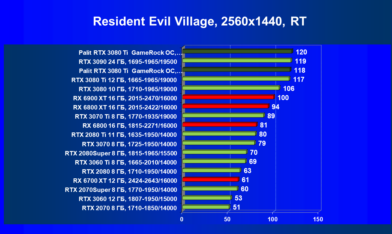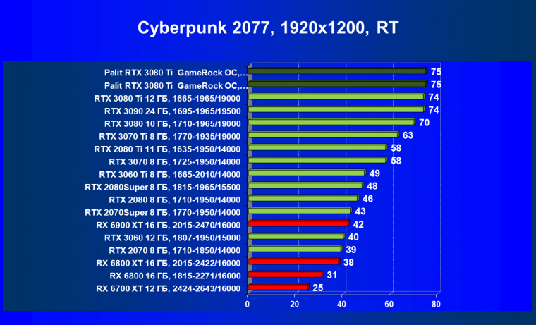 Здесь все логично: RTX 3090 находится в лидерах, за ней следует RX 6900 XT, которую уже преследует RTX 3080 Ti. Карта Palit по частотам работы практически идентична референс-аналогу, поэтому разница между ними ничтожна.