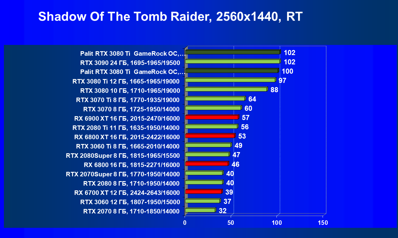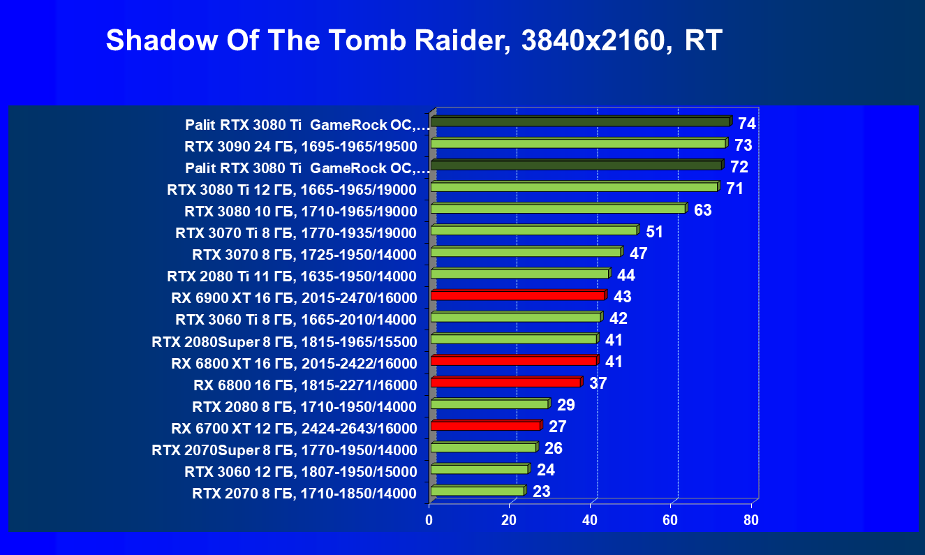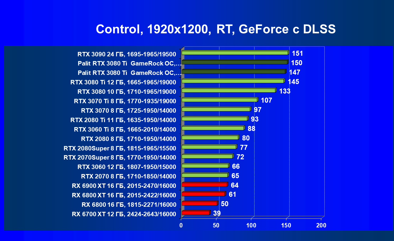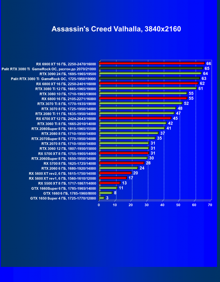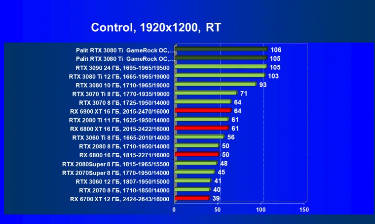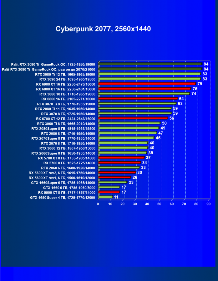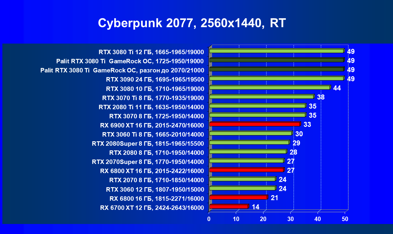 Здесь все логично: RTX 3090 находится в лидерах, за ней следует RX 6900 XT, которую уже преследует RTX 3080 Ti. Карта Palit по частотам работы практически идентична референс-аналогу, поэтому разница между ними ничтожна.