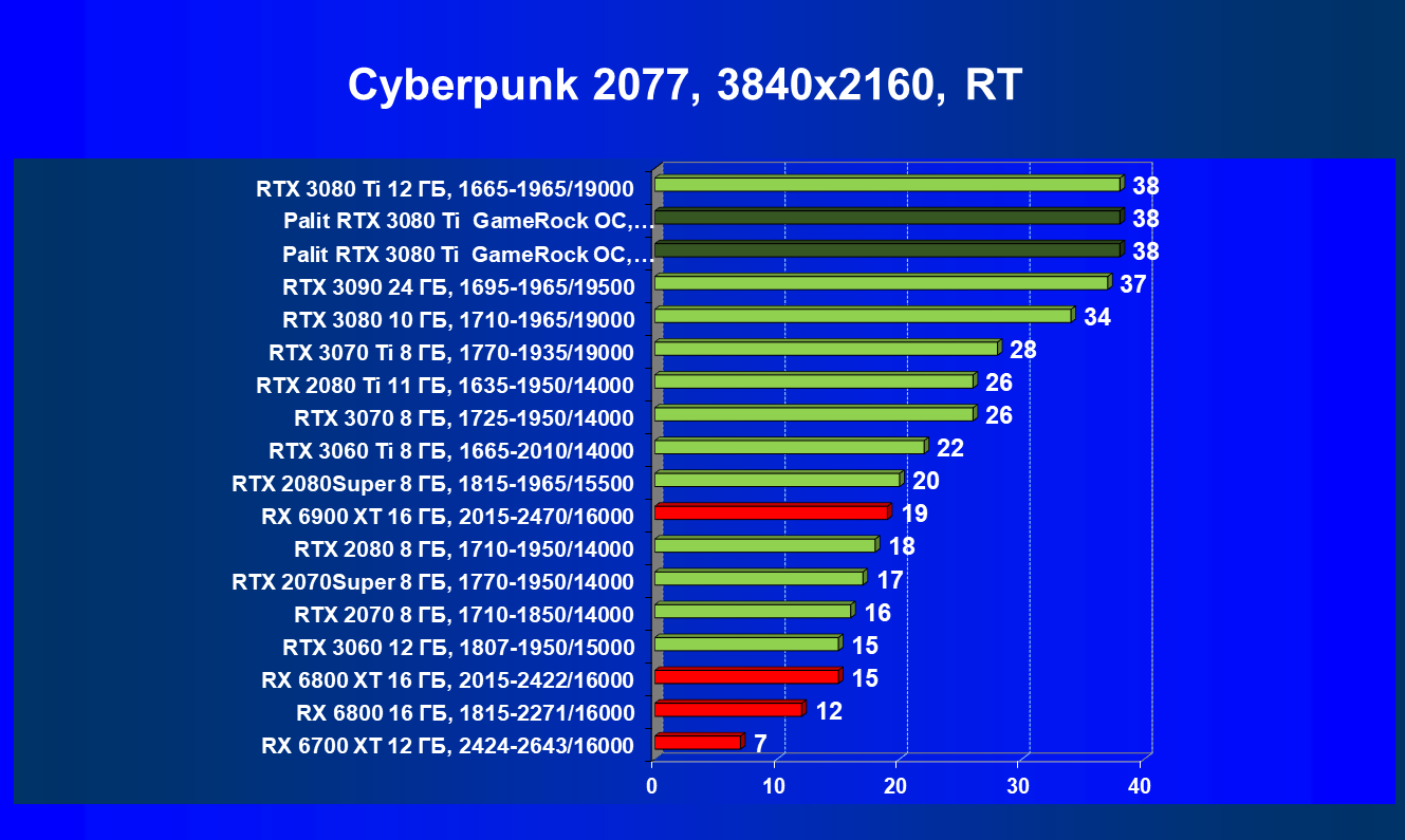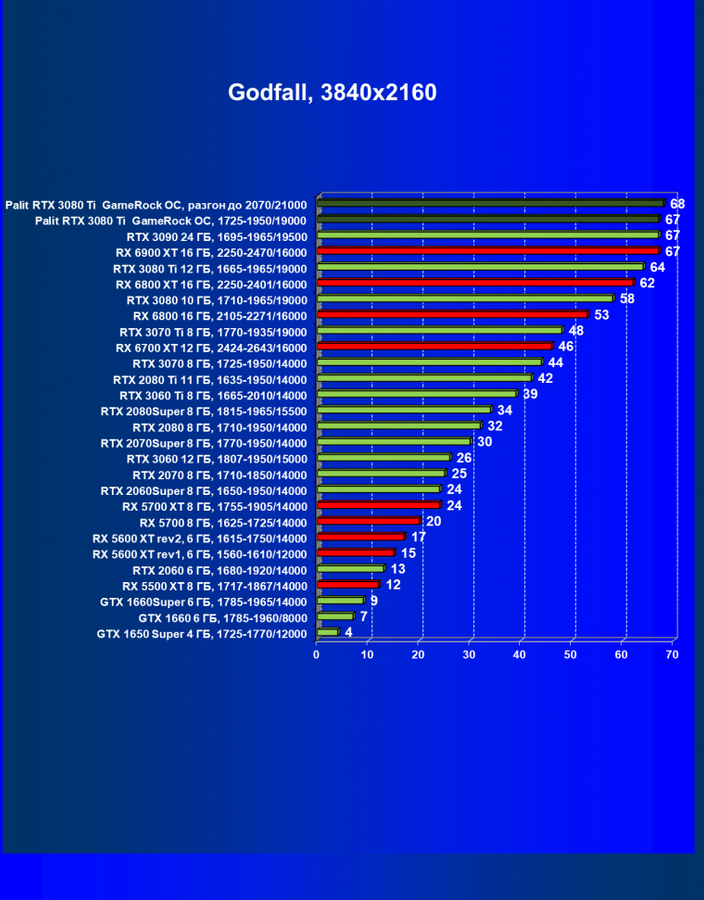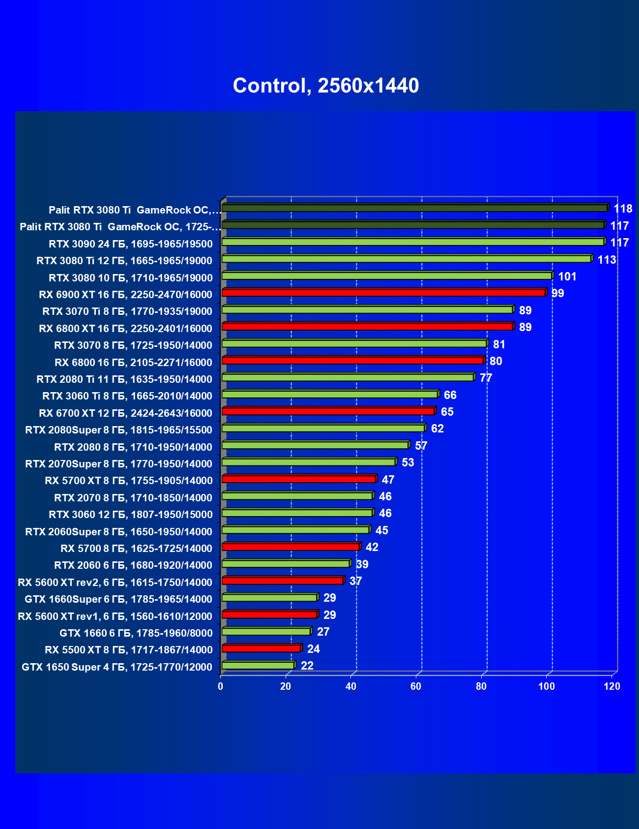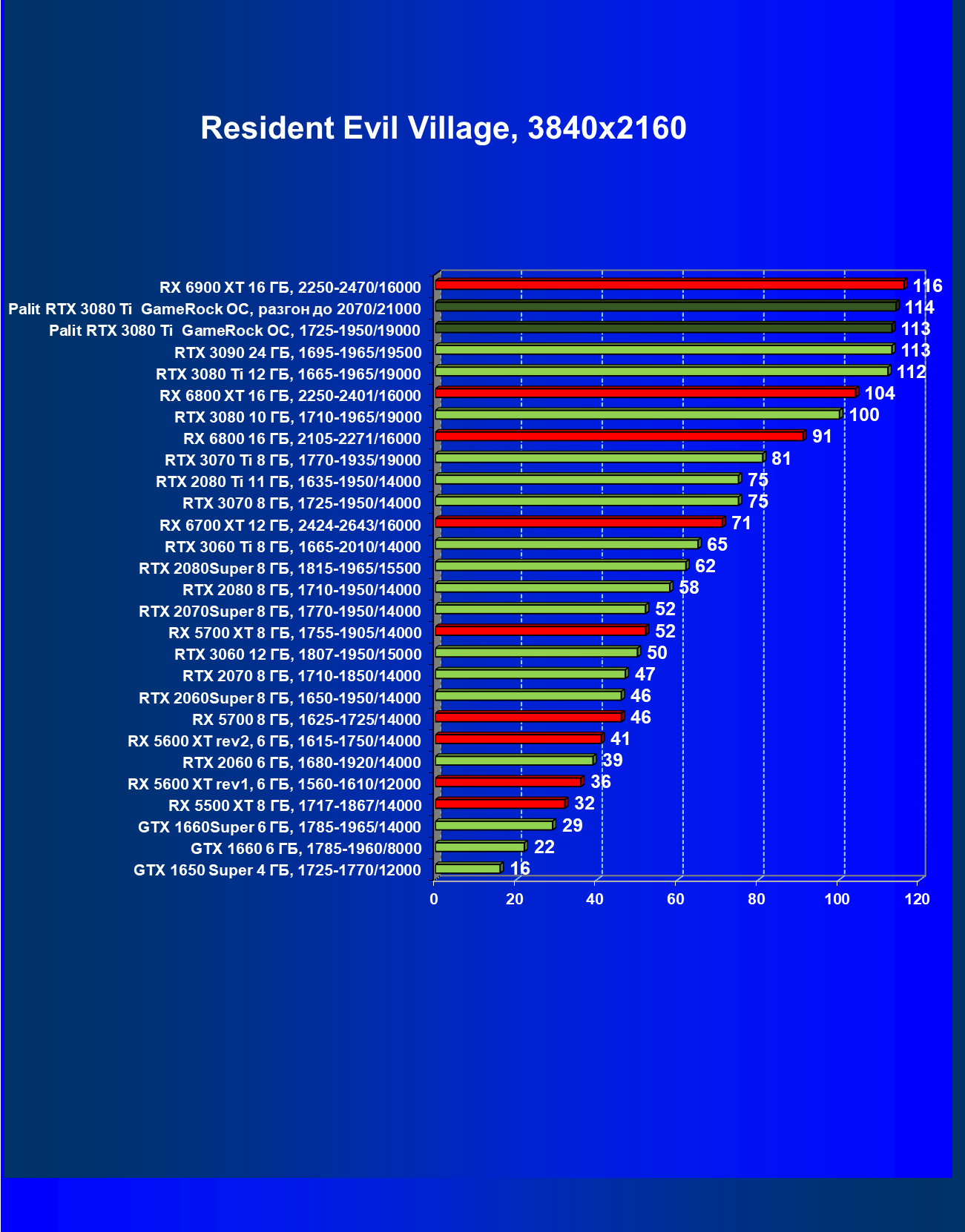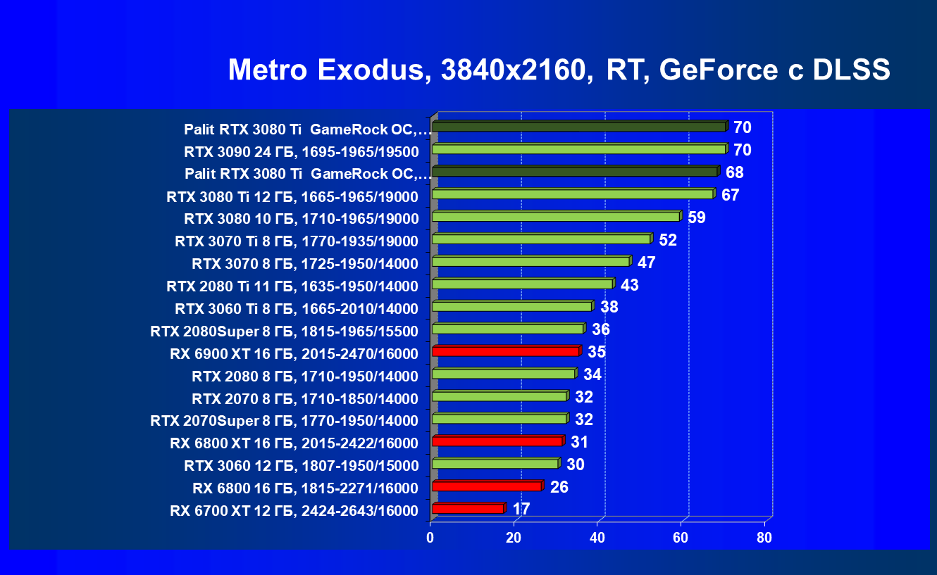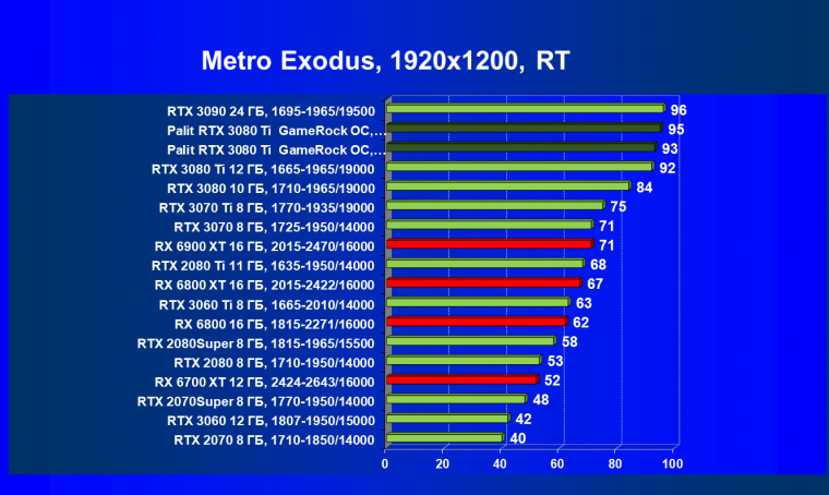 Здесь все логично: RTX 3090 находится в лидерах, за ней следует RX 6900 XT, которую уже преследует RTX 3080 Ti. Карта Palit по частотам работы практически идентична референс-аналогу, поэтому разница между ними ничтожна.