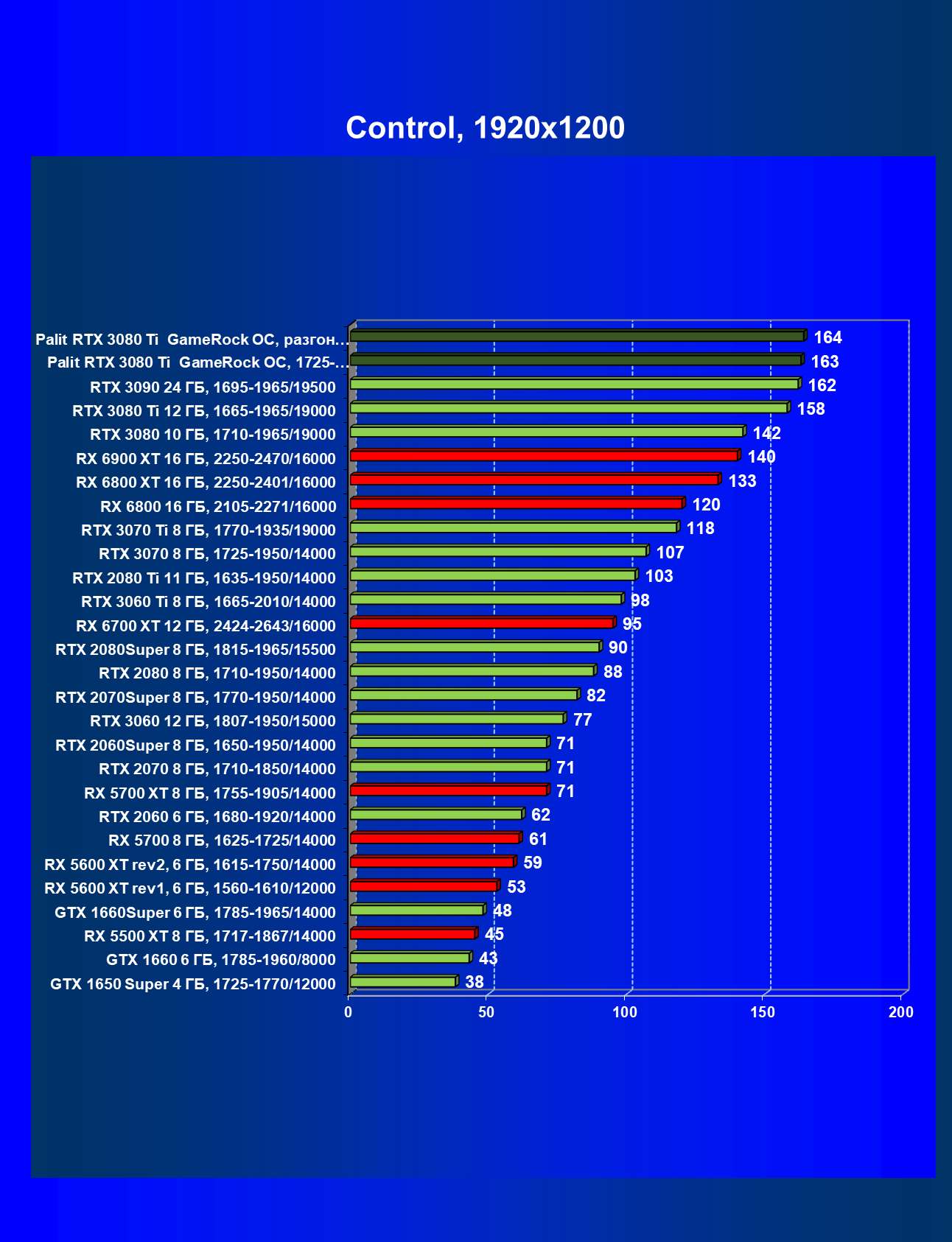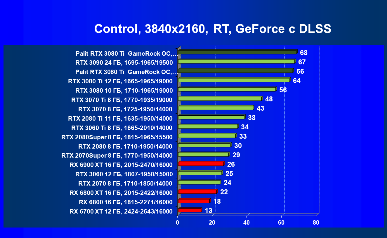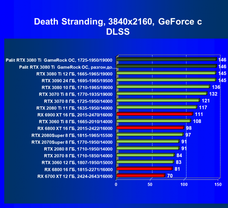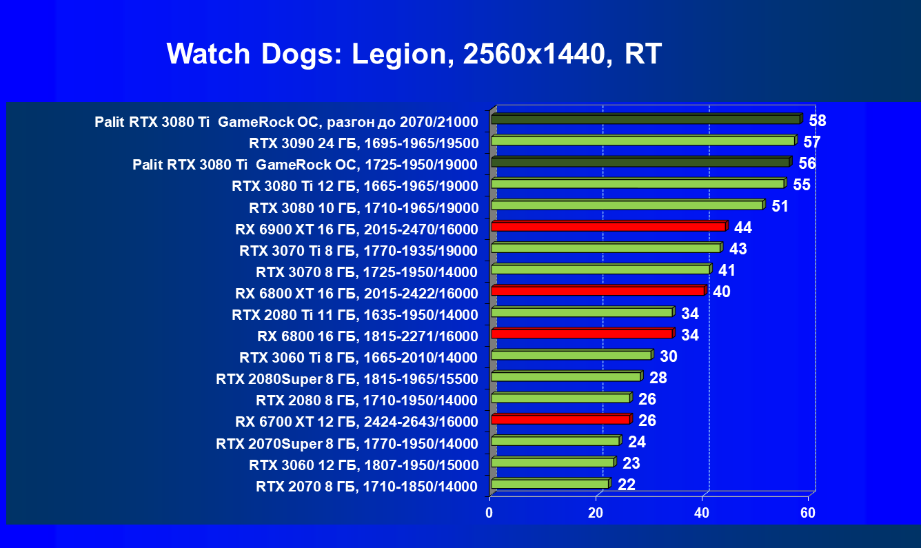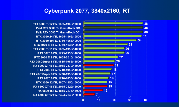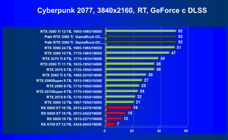 Здесь все логично: RTX 3090 находится в лидерах, за ней следует RX 6900 XT, которую уже преследует RTX 3080 Ti. Карта Palit по частотам работы практически идентична референс-аналогу, поэтому разница между ними ничтожна.