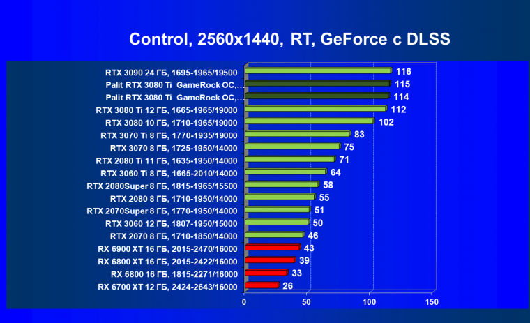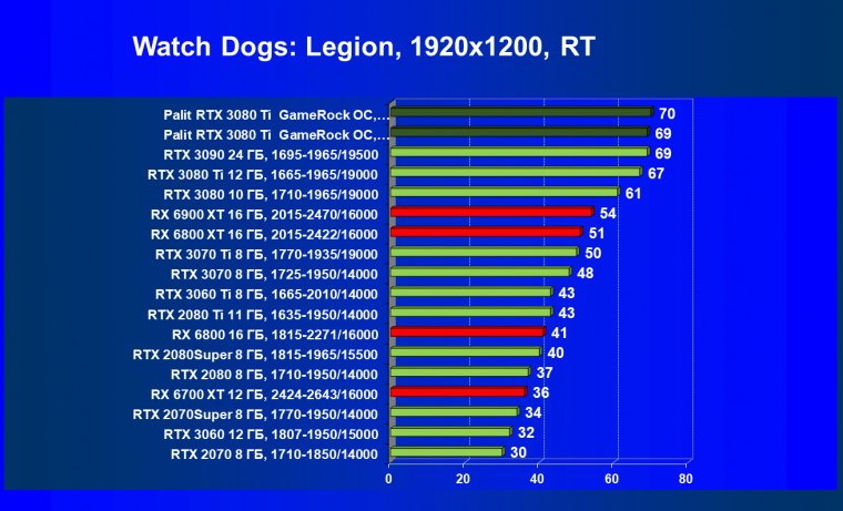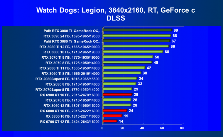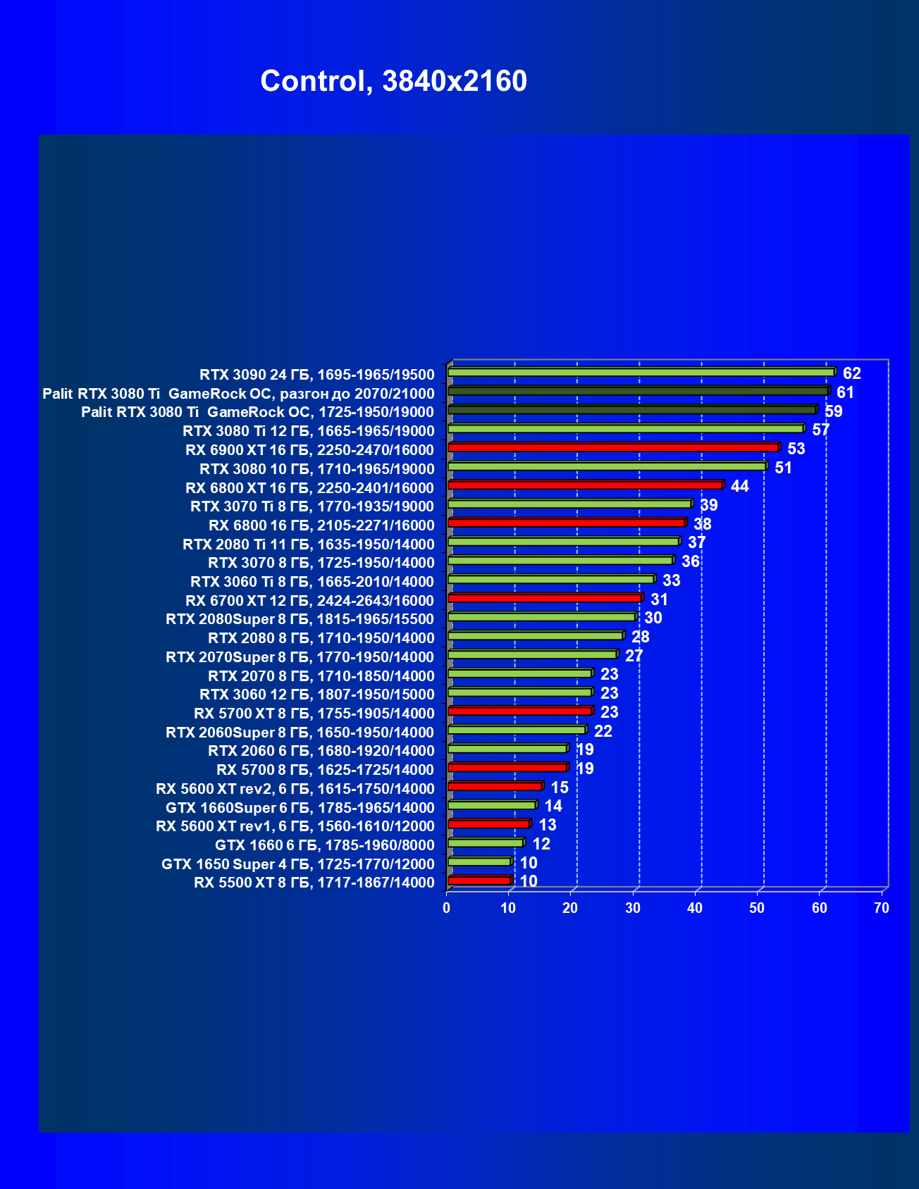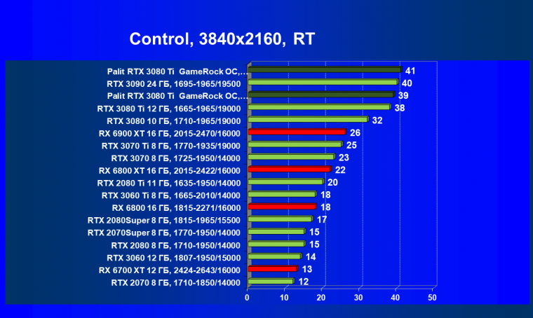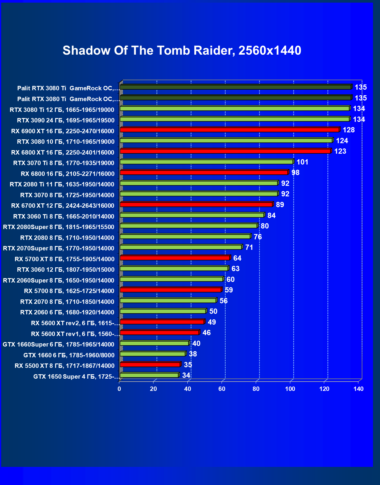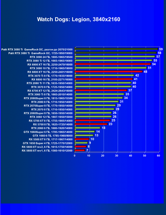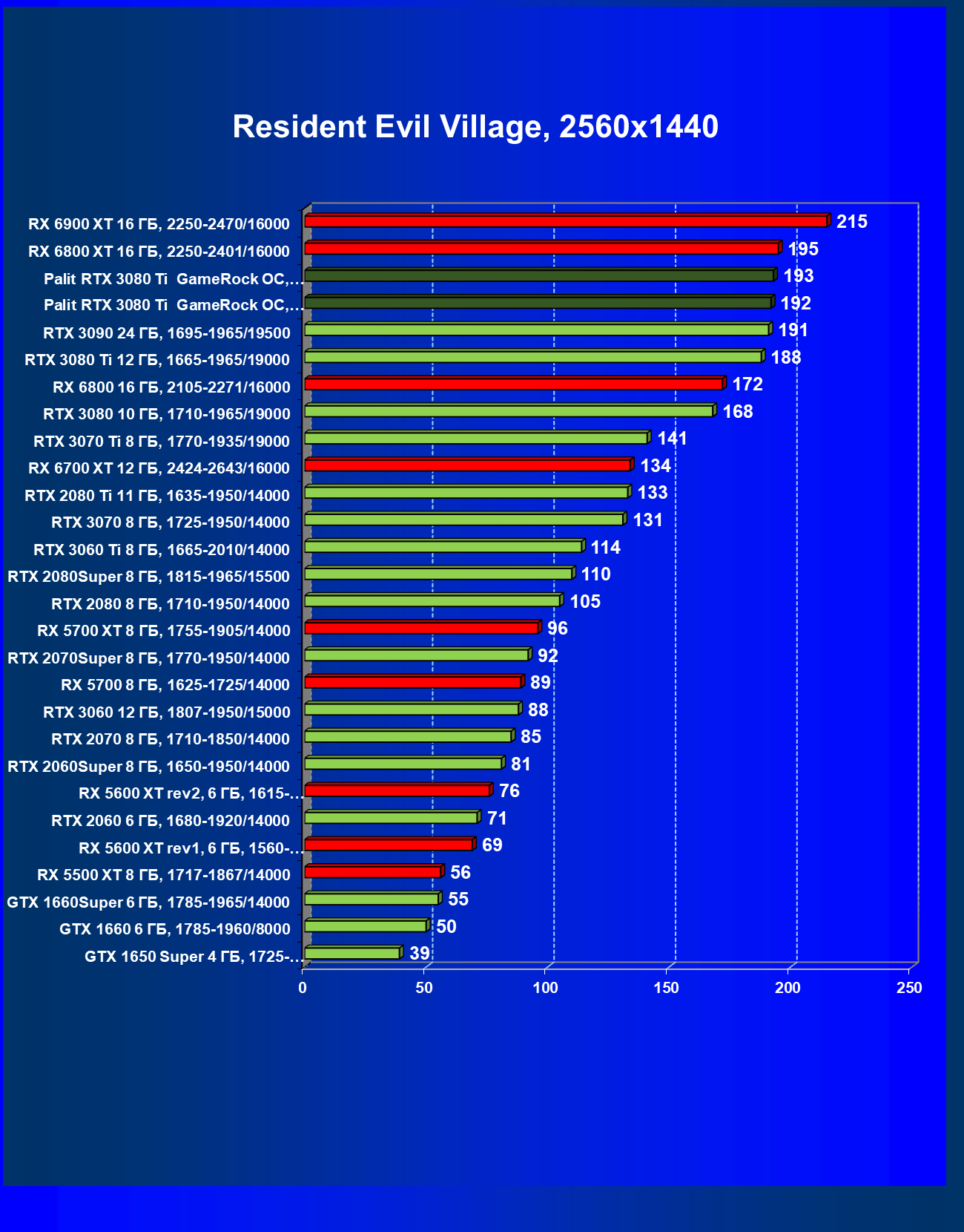Здесь все логично: RTX 3090 находится в лидерах, за ней следует RX 6900 XT, которую уже преследует RTX 3080 Ti. Карта Palit по частотам работы практически идентична референс-аналогу, поэтому разница между ними ничтожна.