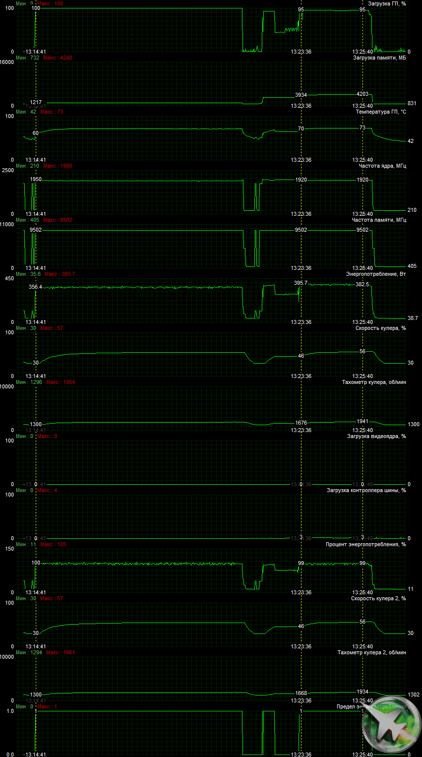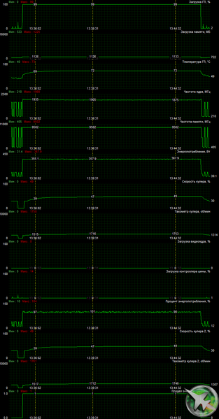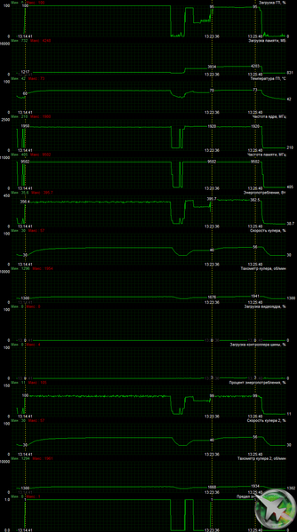 После 2-часового прогона под нагрузкой максимальная температура ядра не превысила 73 градусов, что является приемлемым результатом для видеокарт такого уровня. Максимальная мощность была зафиксирована на уровне 395 Вт, а максимальный нагрев наблюдался вокруг ядра (и основным источником нагрева являются преобразователи питания). Микросхемы памяти нагревались до 88 градусов.