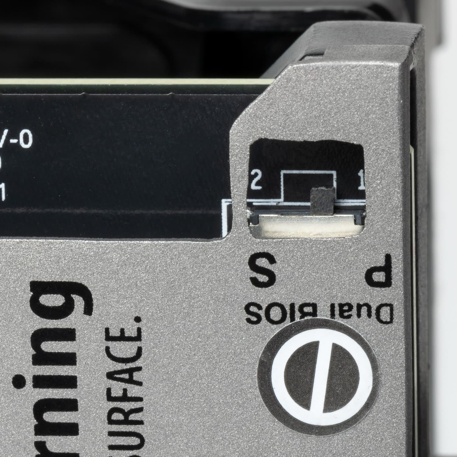 Видеокарта имеет два режима работы, привязанных к разным прошивкам BIOS. Производитель их обозначил просто: 1 и 2 на самой плате, но на бэкплейте подписано для понимания: P (performance) и S (silent). Для выбора на верхнем торце имеется переключатель.