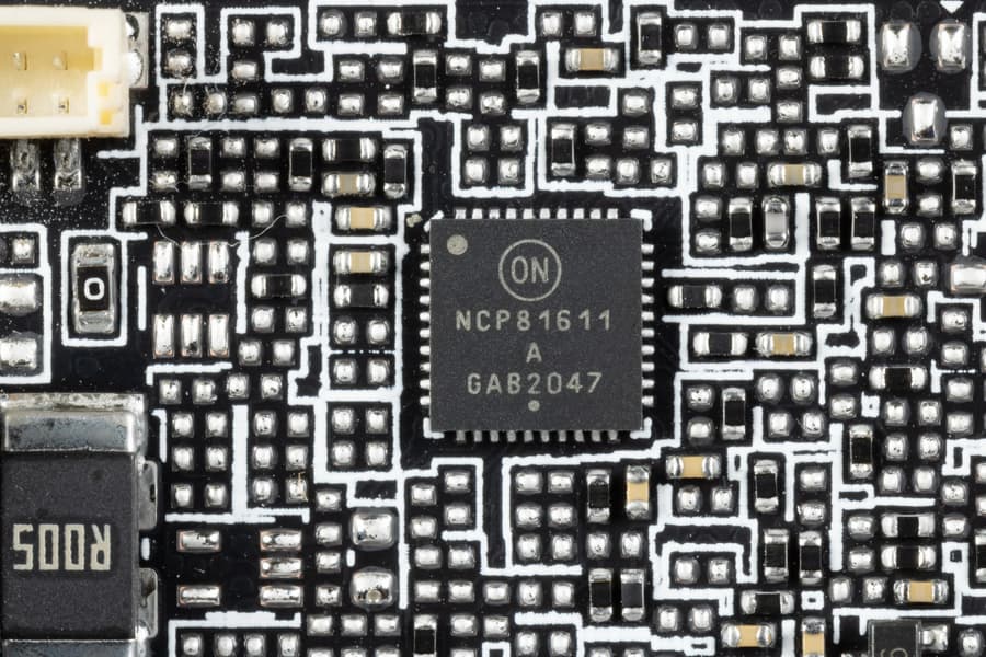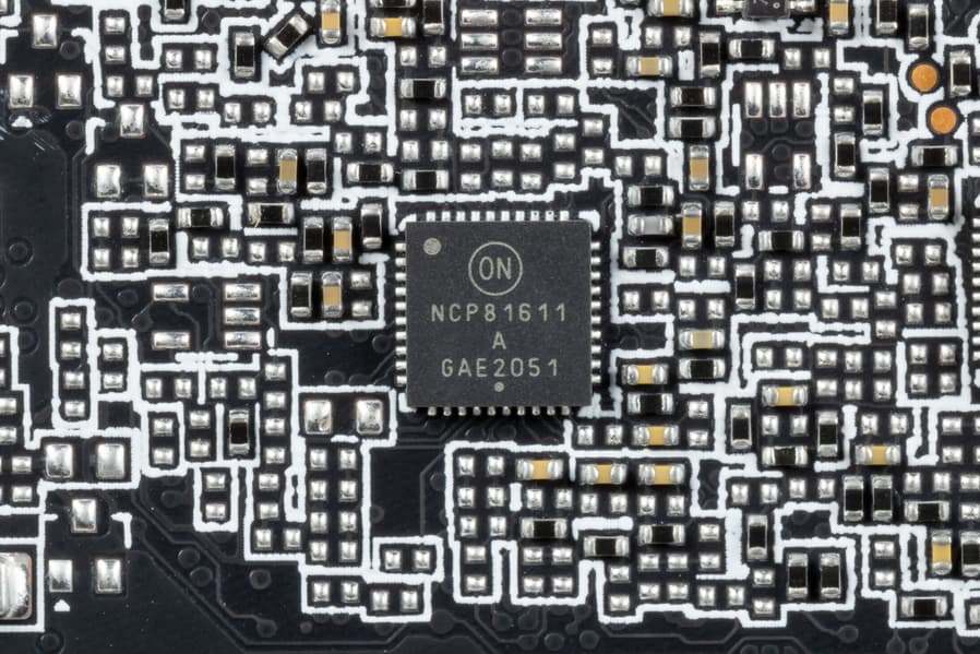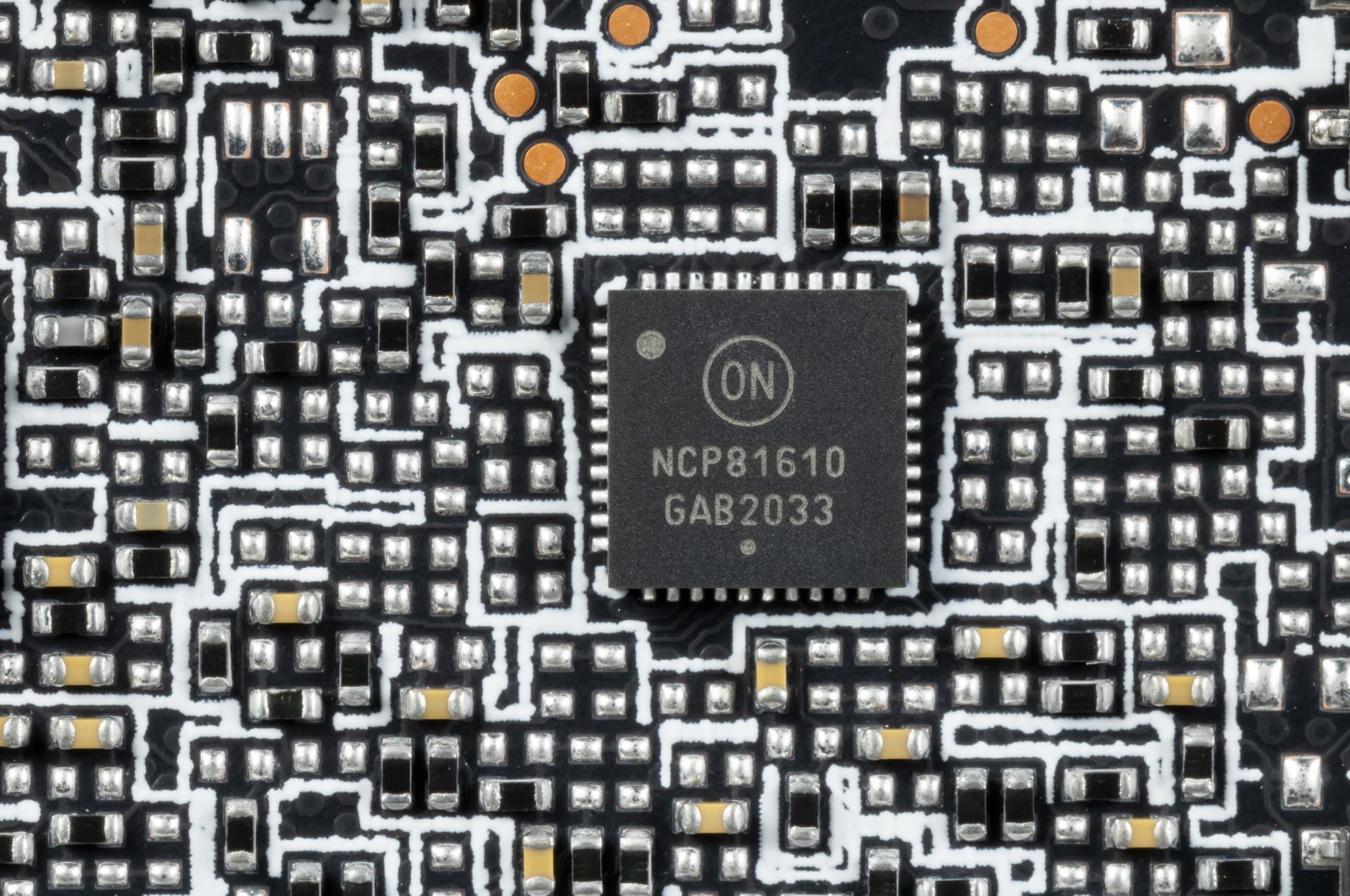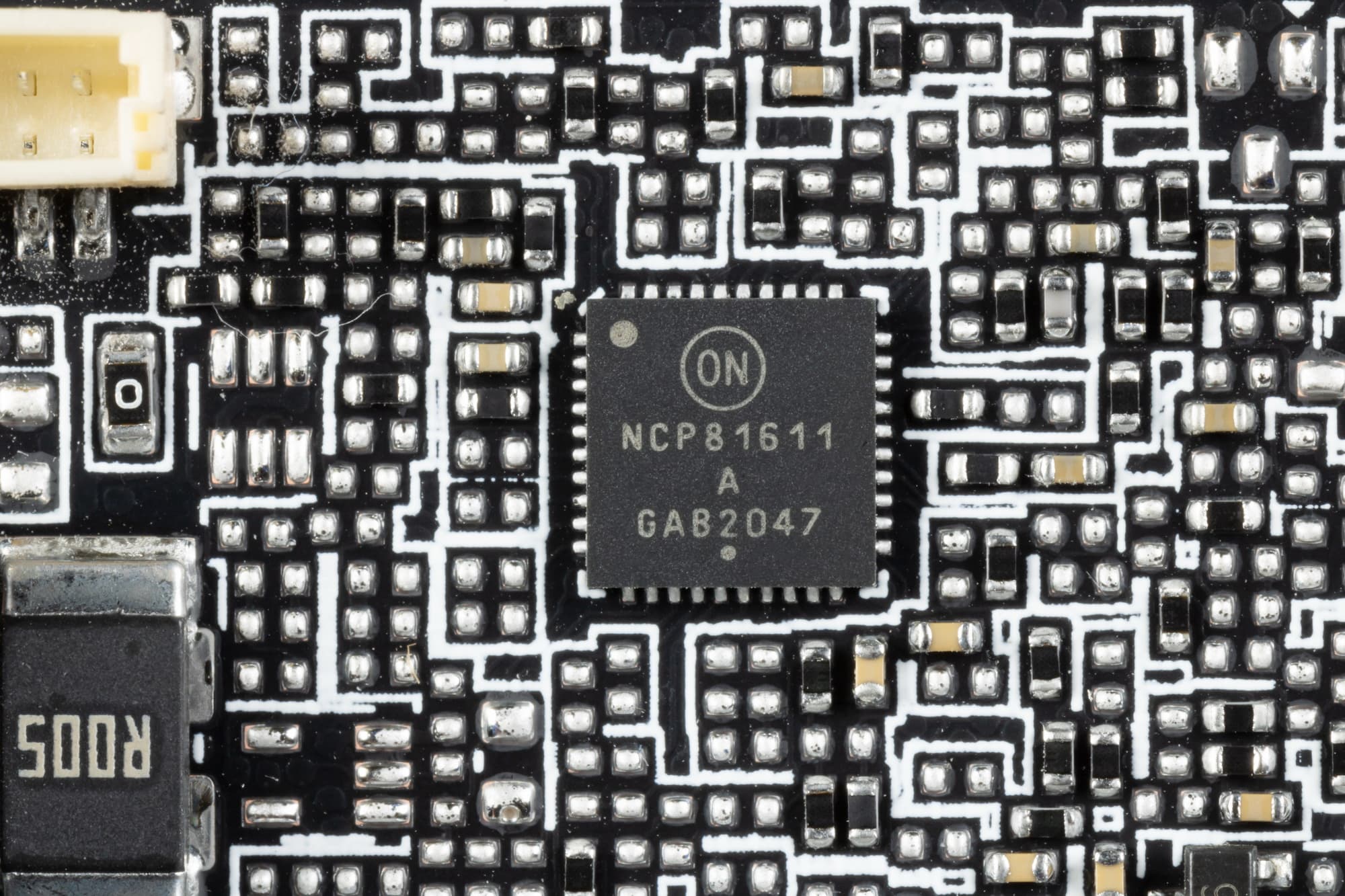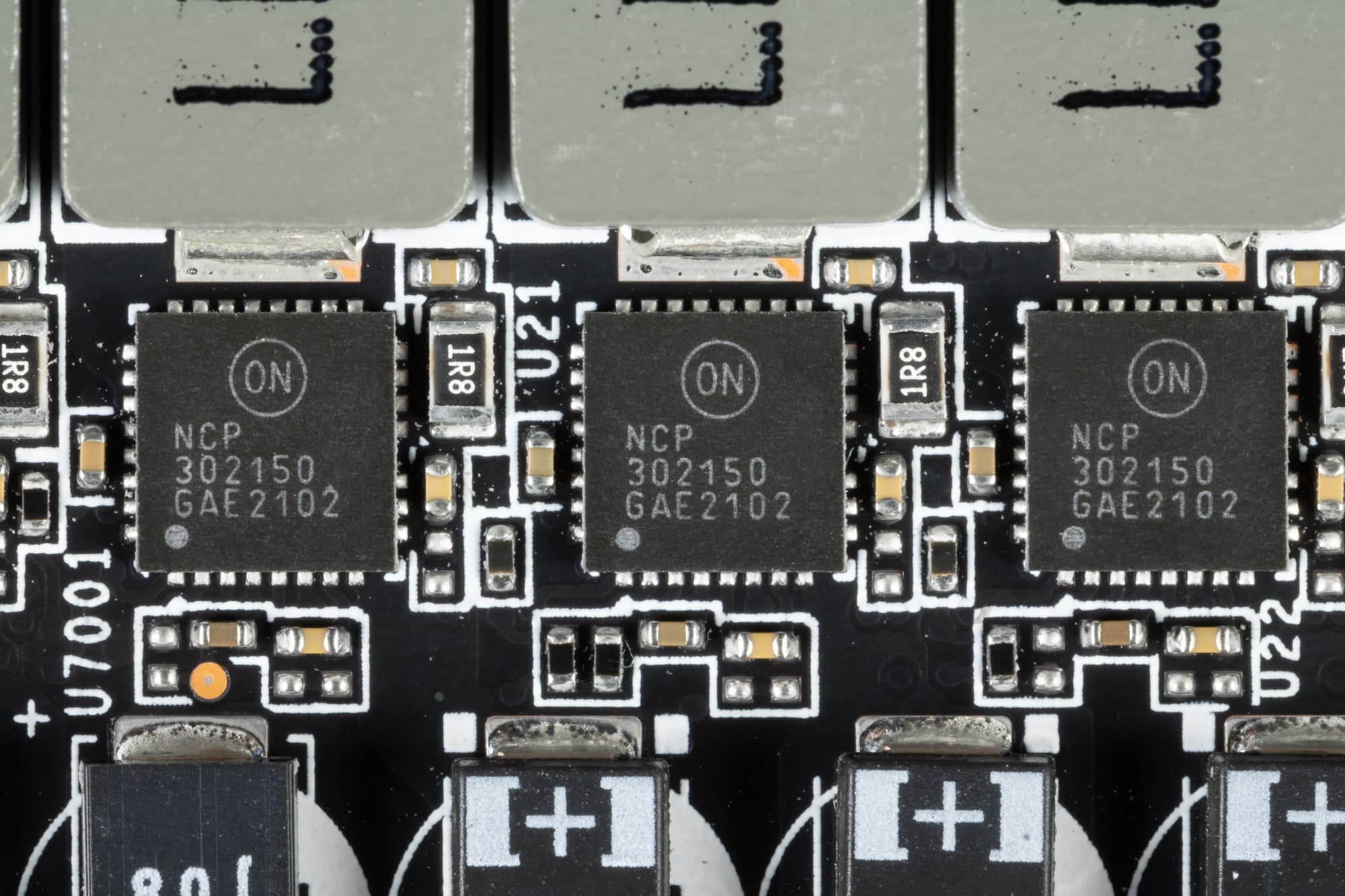 В преобразователе питания, традиционно для всех видеокарт Nvidia, используются транзисторные сборки DrMOS — в данном случае, NCP302150 (тот же On Semiconductor), каждая из которых рассчитана на максимальный ток в 50 А.