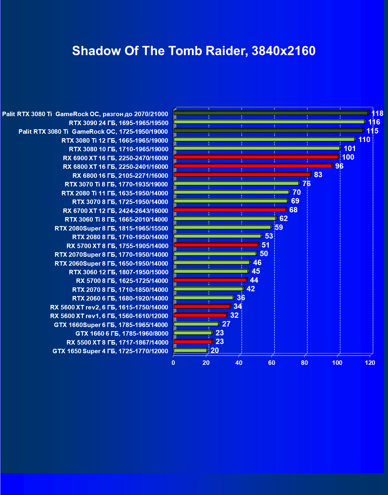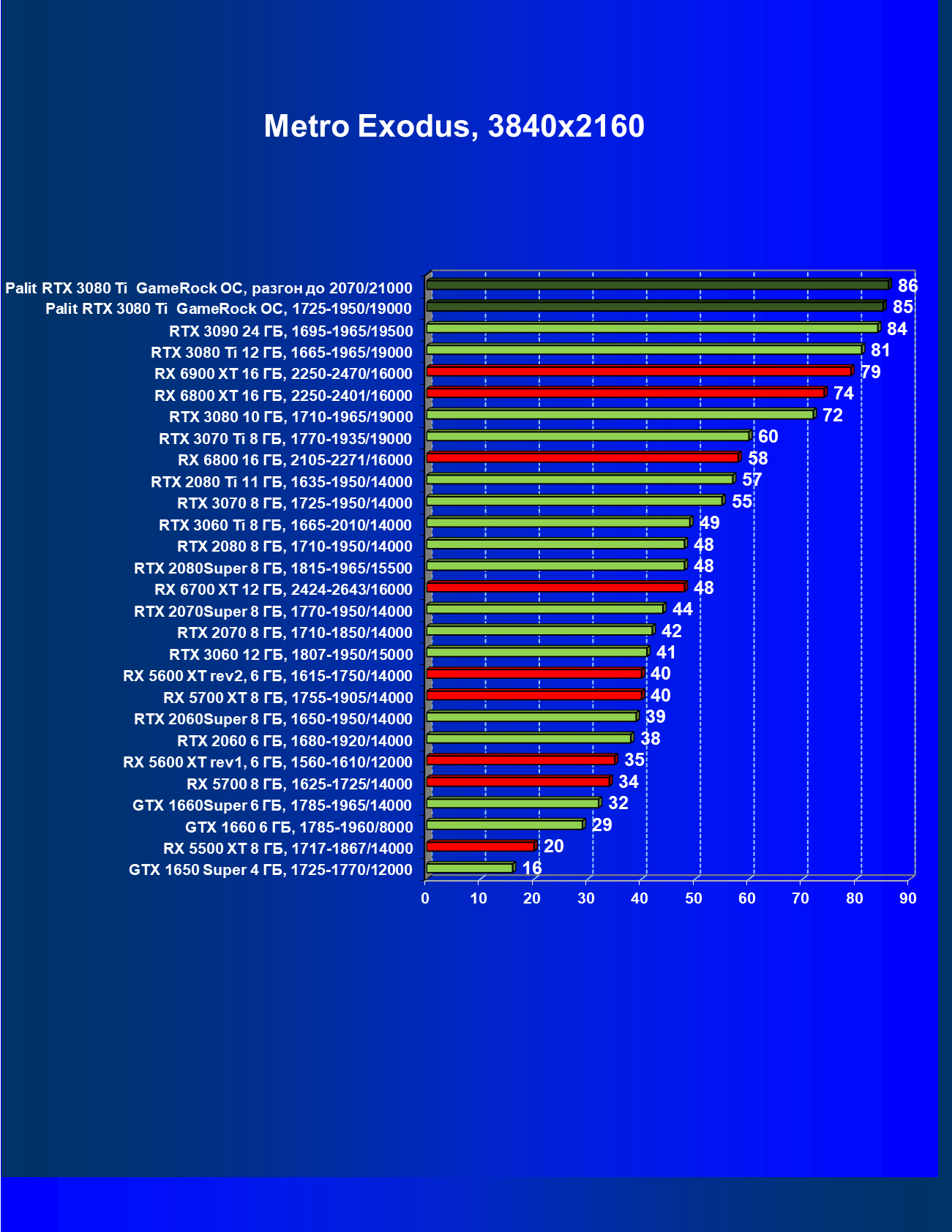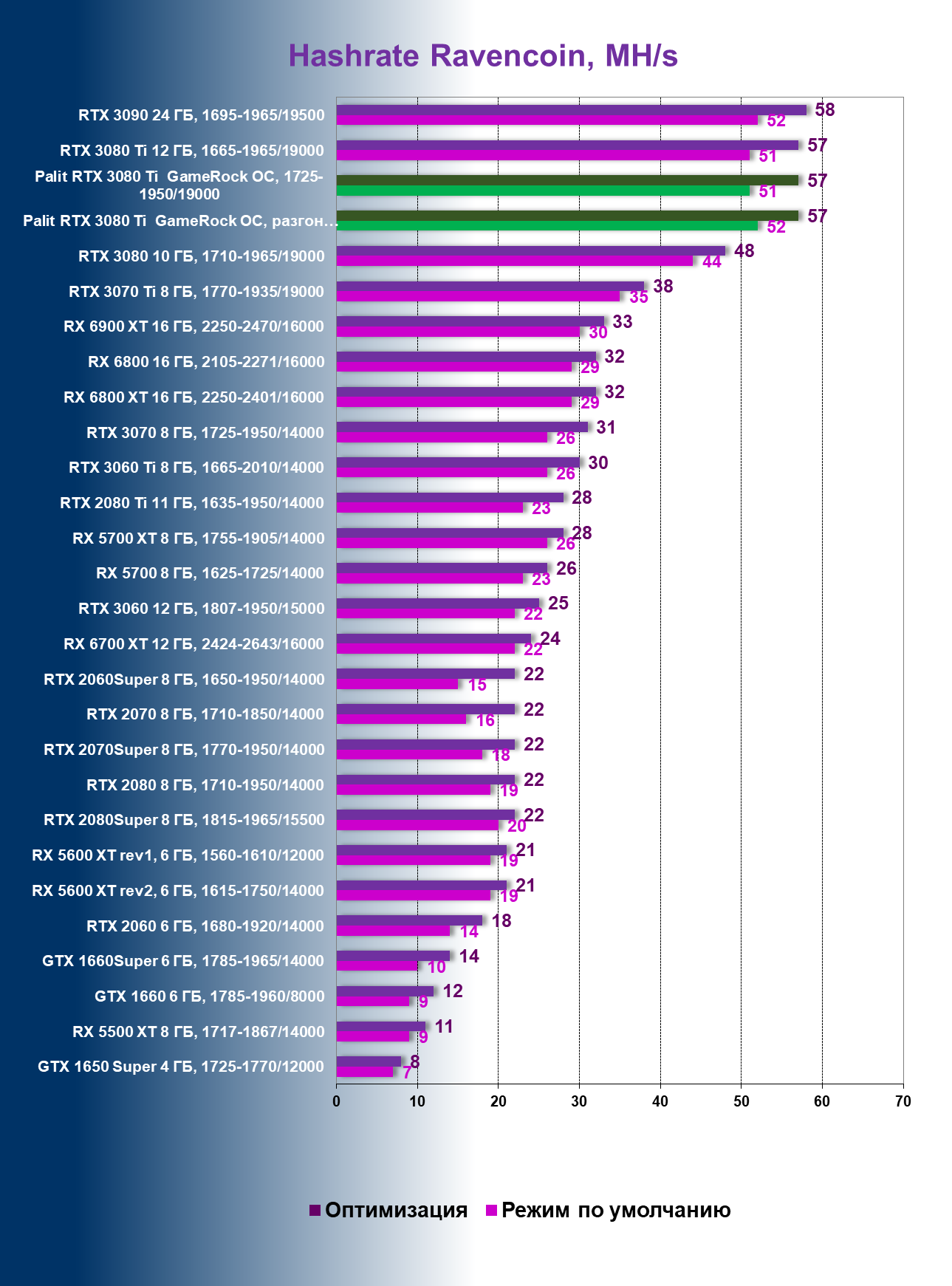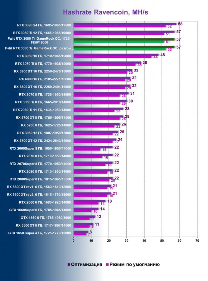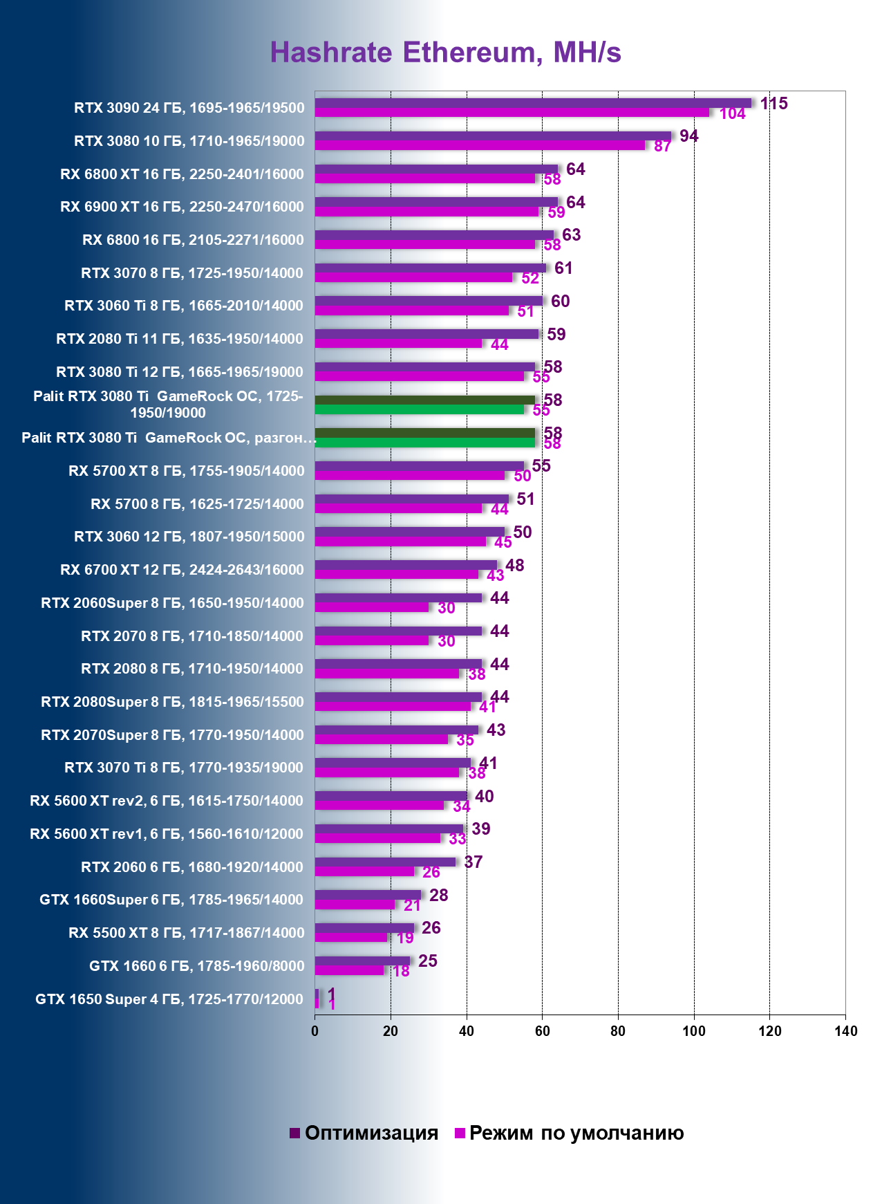 | 06 | Palit RTX 3080 Ti GameRock OC, 1665—1935/19000 | 91 | 1817 | 200 000 |
