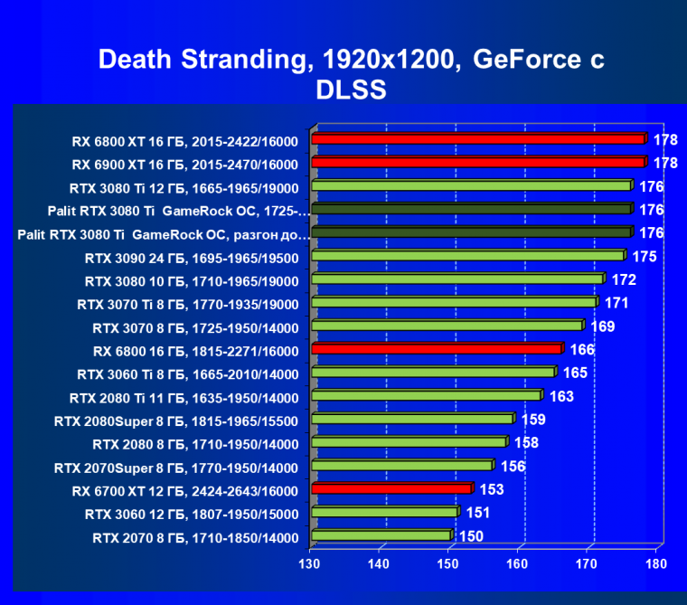 Собственно, картина повторяется за исключением того, что все RX 6000 ушли в аутсайдеры из-за чрезмерного падения производительности в играх с трассировкой лучей у этих продуктов AMD, поэтому все RTX 3000 смотрятся в выигрышном свете. Расклад сил внутри RTX тот же.