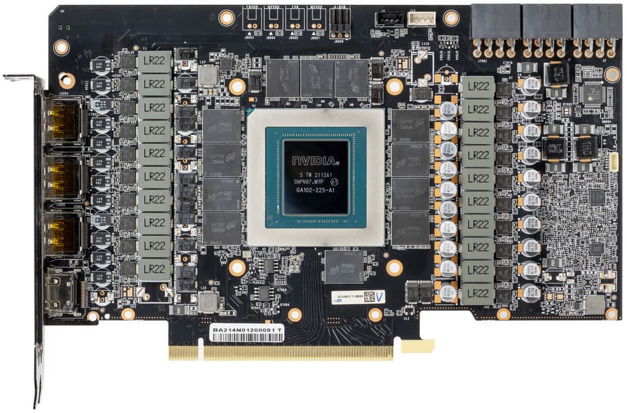 Карта имеет 12 ГБ памяти GDDR6X SDRAM, размещенной в 12 микросхемах по 8 Гбит на лицевой стороне PCB. Микросхемы памяти Micron (GDDR6X, MT61K256M32JE-19) рассчитаны на номинальную частоту работы в 5500 (21000) МГц. Расшифровщик кодов на упаковках FBGA находится здесь.