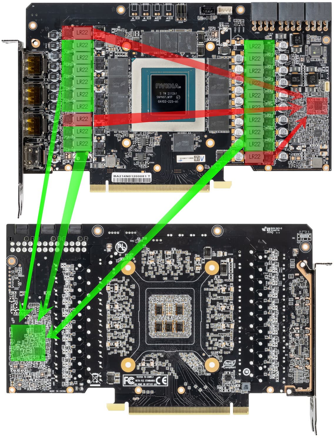 Зеленым цветом отмечена схема питания ядра, красным — памяти. При этом удвоителей (даблеров) фаз нет, для управления схемой питания GPU используются два ШИМ-контроллера NCP81611 (On Semiconductor), каждый из которых способен управлять максимум 8 фазами. Оба расположены на оборотной стороне платы.