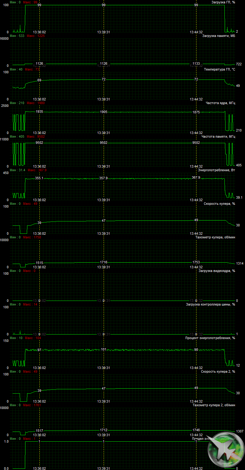 При описанном ручном разгоне параметры работы карты особо не менялись, однако максимальное потребление выросло до 402 Вт.