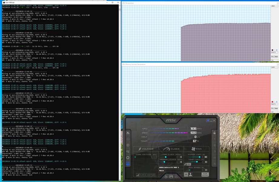 Оптимизация настроек работы видеокарт под майнинг в нашем случае не предусматривает сильного разгона видеопамяти, также обязательным является внешний обдув видеокарт. Особо тщательно надо следить за нагревом GDDR6X у GeForce RTX 3080/3090, ибо максимум для этой памяти — 110 градусов, и она долго не проживет, постоянно работая в условиях нагрева выше 100 °C. В нашем случае нагрев памяти при майнинге по алгоритму ethash не превышал 92 градусов, однако в случае с kawpow нагрев памяти вырастал до 98 °C.