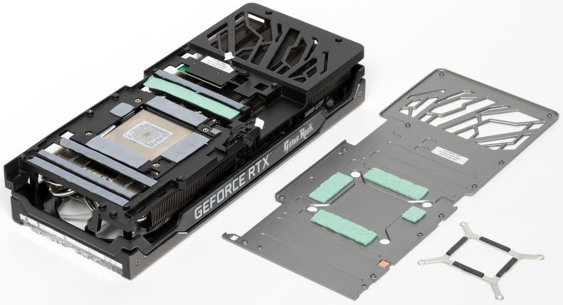 Перед нами большой двухсекционный пластинчатый радиатор с тепловыми трубками, подошва которого охлаждает GPU. Микросхемы памяти, как и преобразователи питания VRM, охлаждаются с помощью отдельной пластины, прикрученной к основному радиатору. Задняя пластина не только служит элементом жесткости, но и участвует в охлаждении печатной платы в области микросхем памяти через термоинтерфейс.