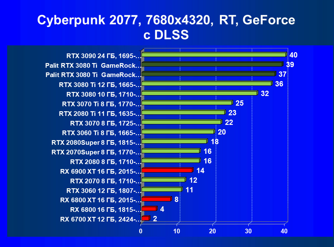 Результаты тестов с включенной аппаратной трассировкой лучей (и DLSS) в разрешении 7680×4320 (8К)