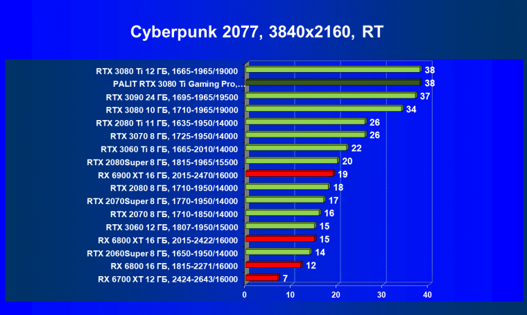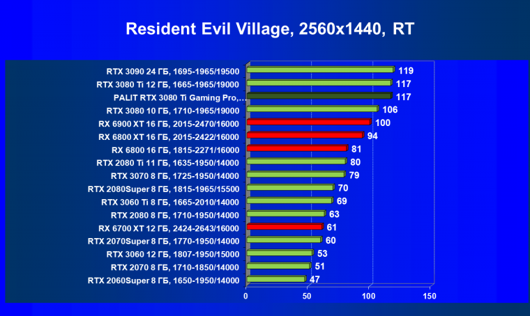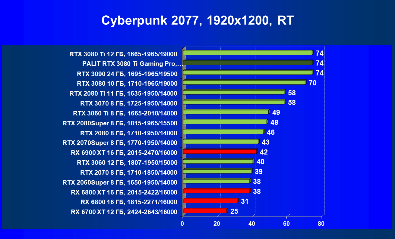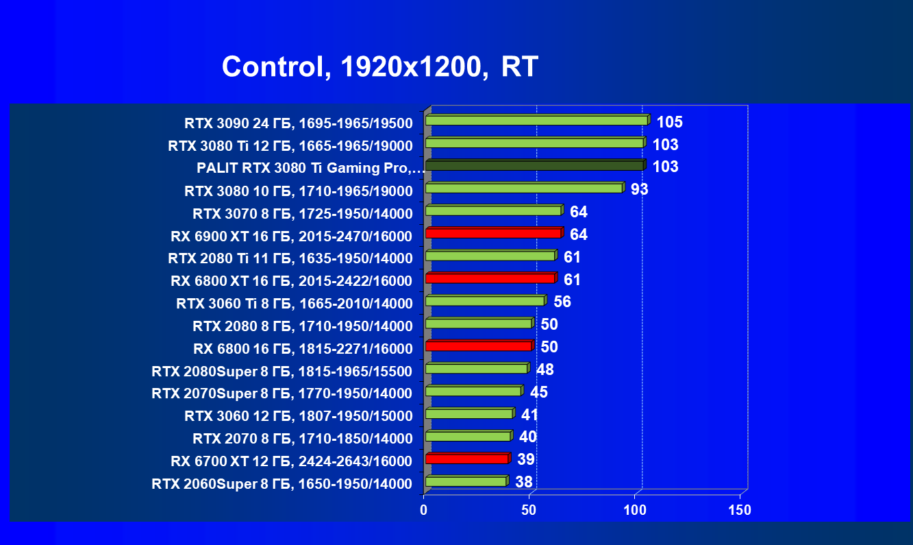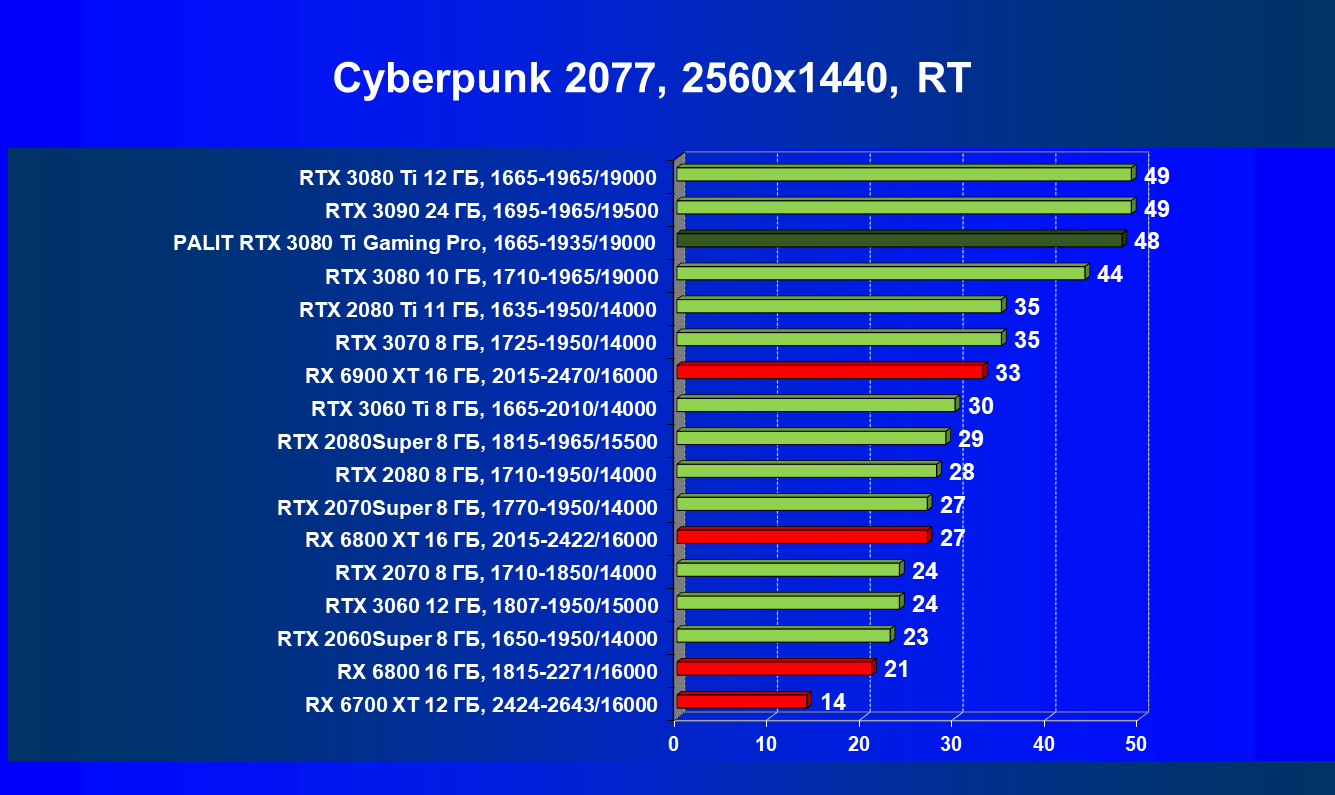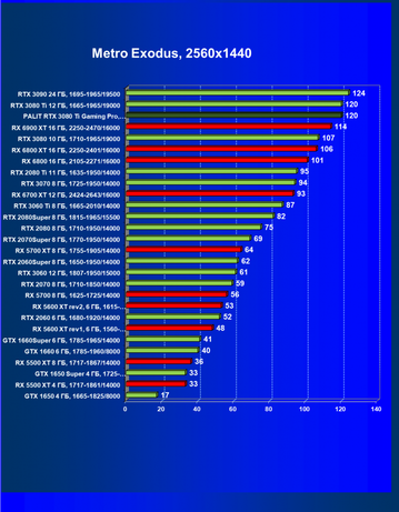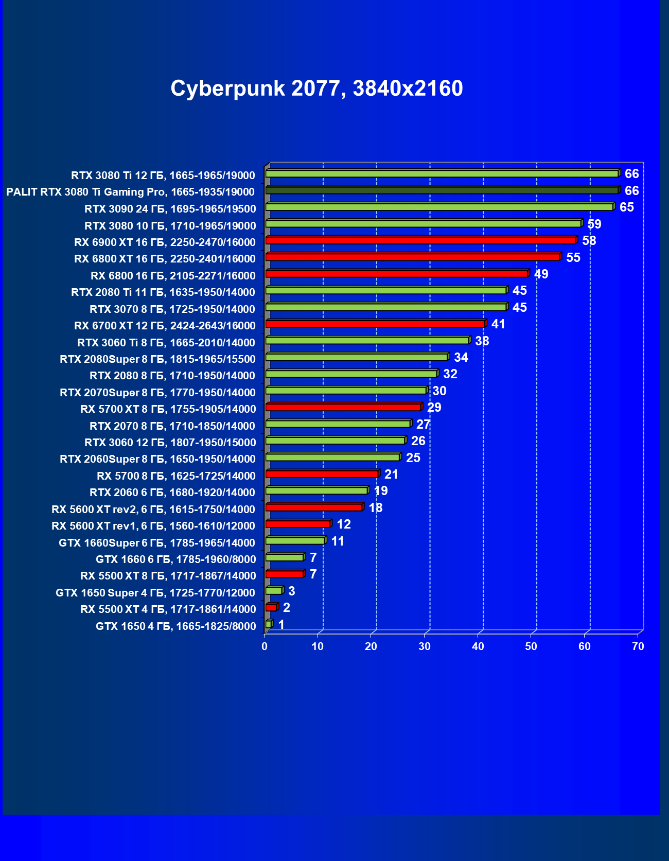 Здесь все логично: RTX 3090 находится в лидерах, за ней следует RX 6900 XT, которую уже преследует RTX 3080 Ti. Карта Palit по частотам работы практически идентична референс-аналогу, поэтому разница между ними ничтожна.