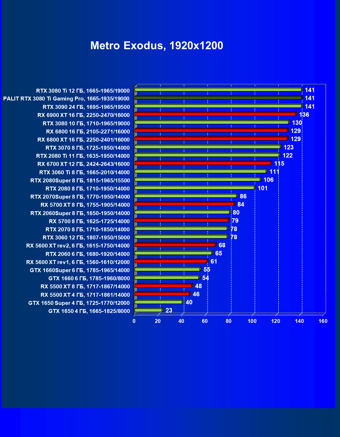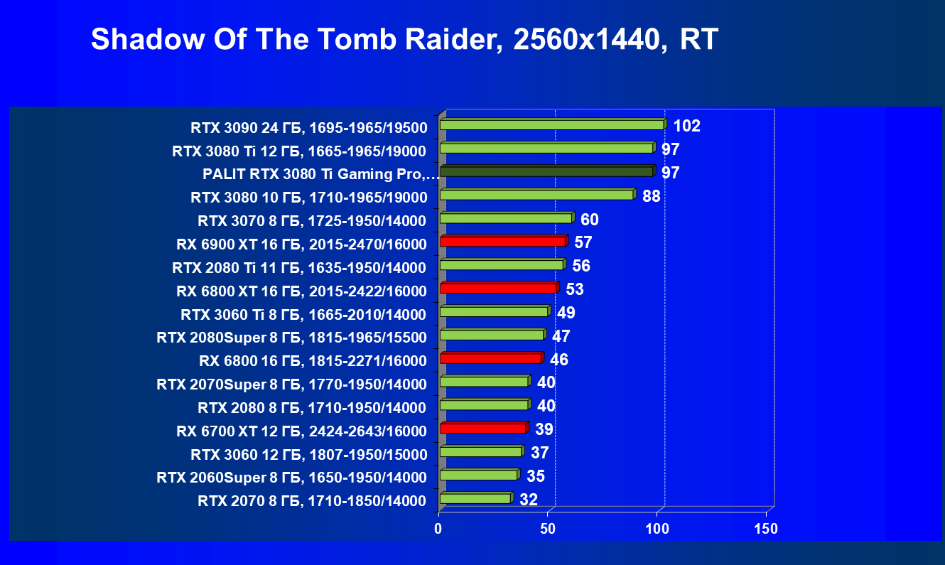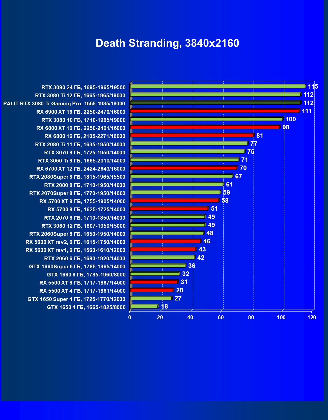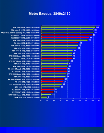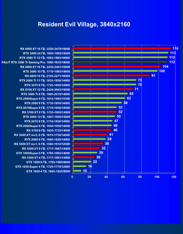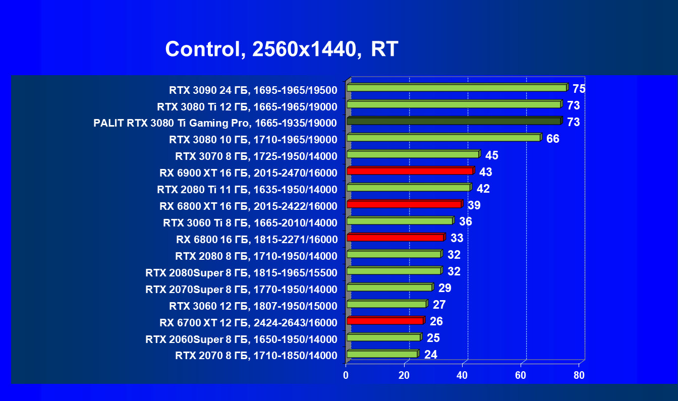 Здесь все логично: RTX 3090 находится в лидерах, за ней следует RX 6900 XT, которую уже преследует RTX 3080 Ti. Карта Palit по частотам работы практически идентична референс-аналогу, поэтому разница между ними ничтожна.