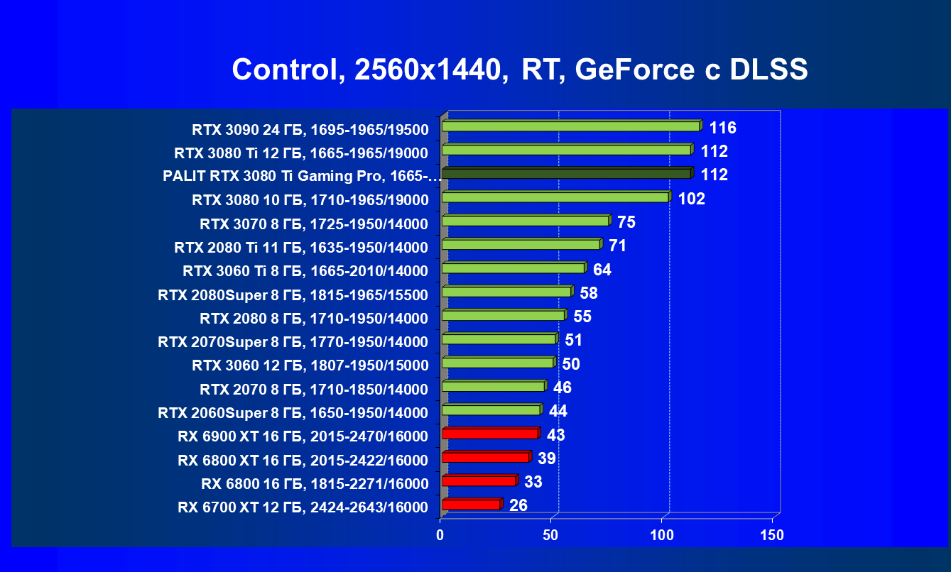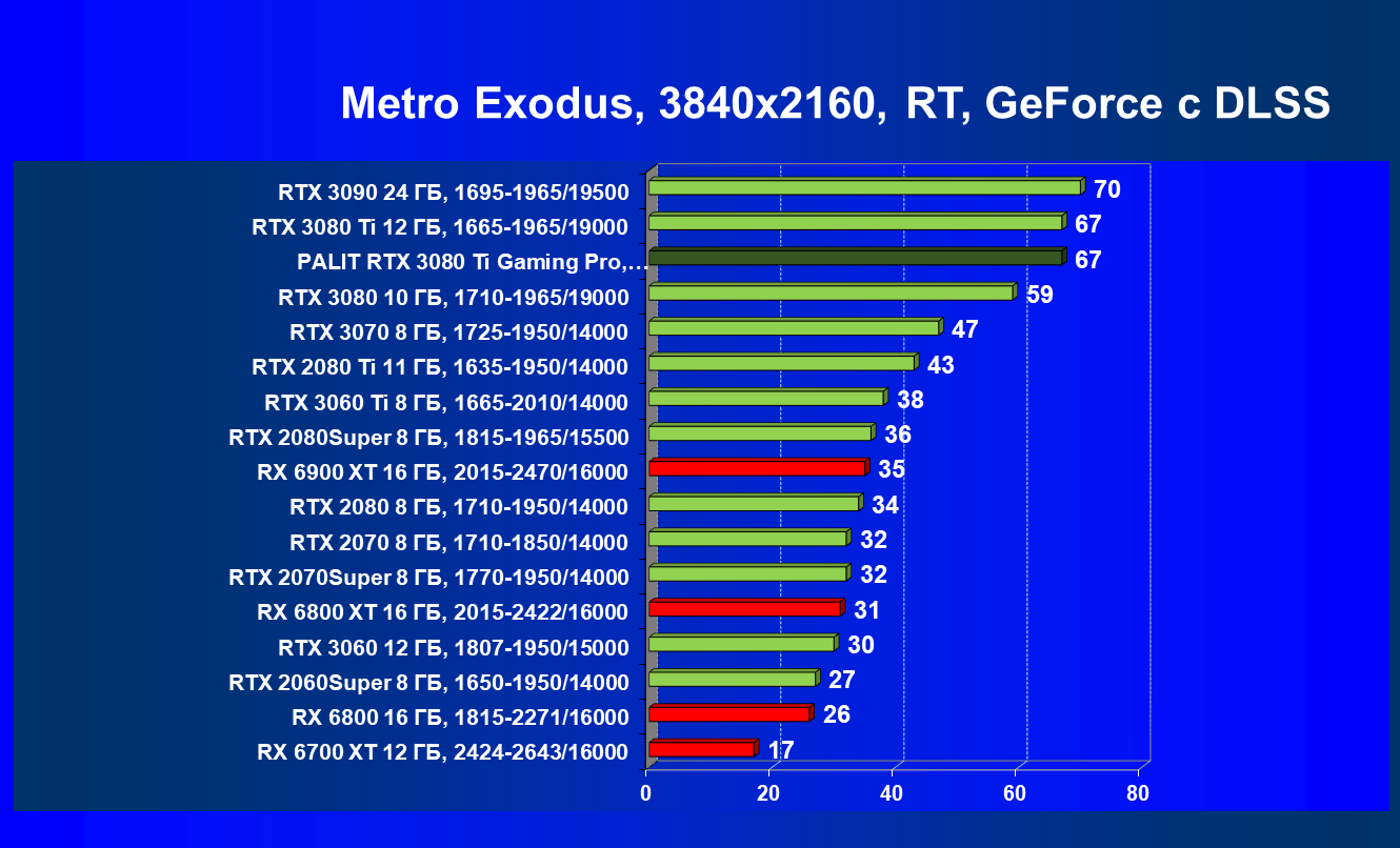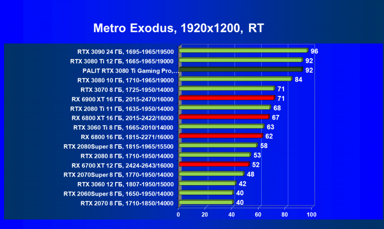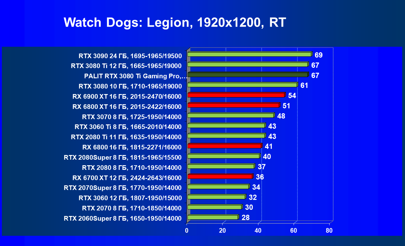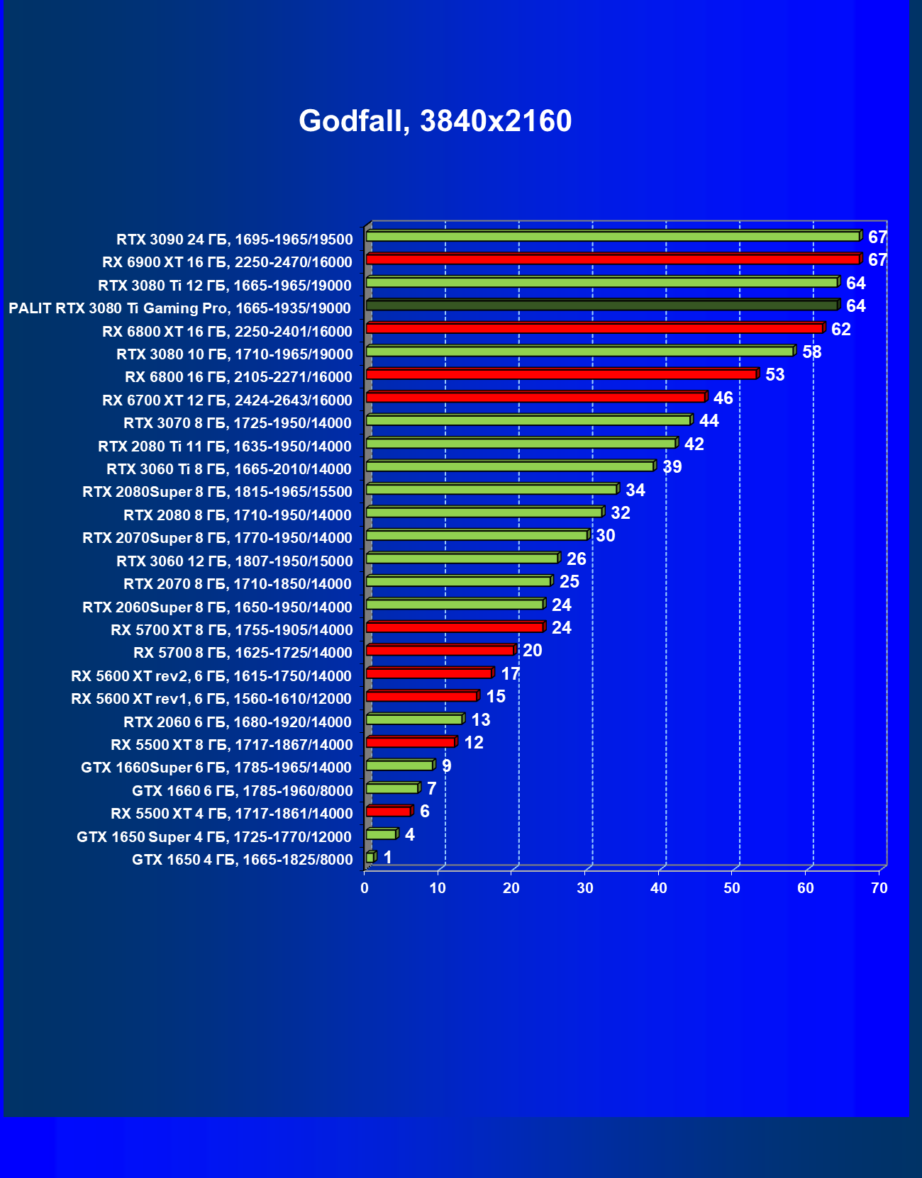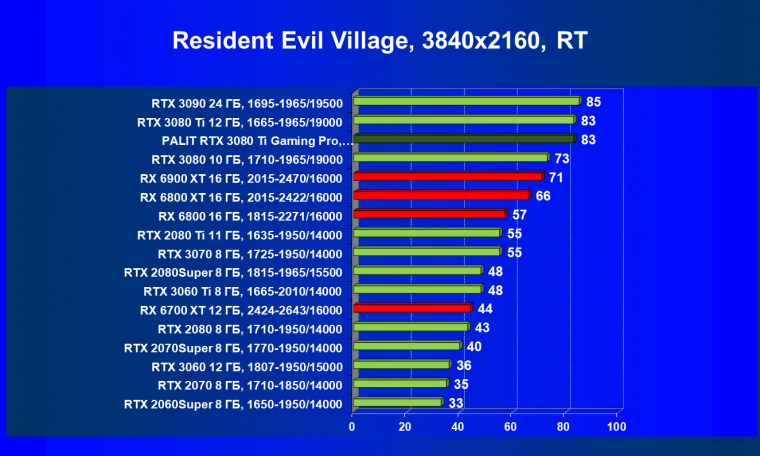 Здесь все логично: RTX 3090 находится в лидерах, за ней следует RX 6900 XT, которую уже преследует RTX 3080 Ti. Карта Palit по частотам работы практически идентична референс-аналогу, поэтому разница между ними ничтожна.
