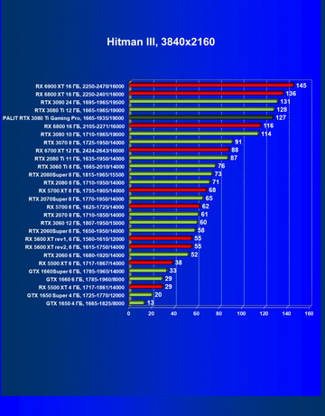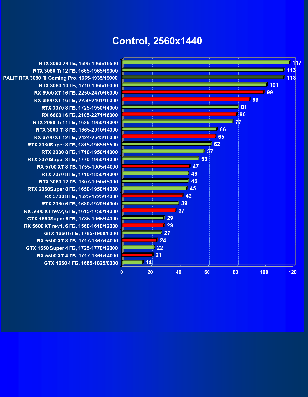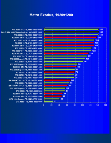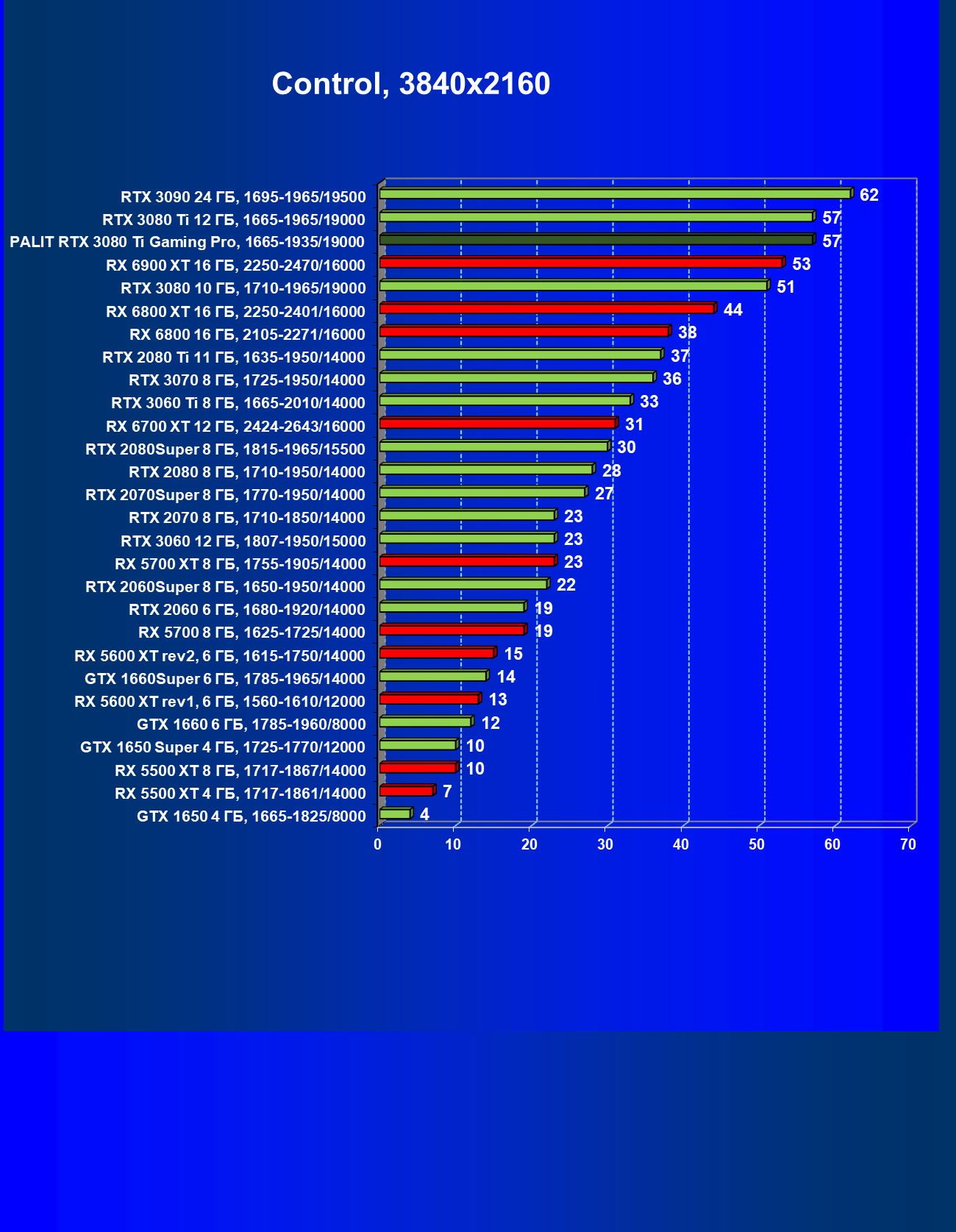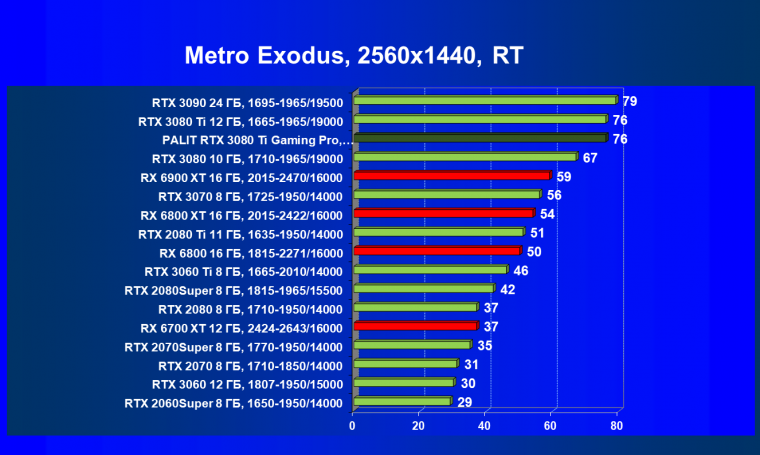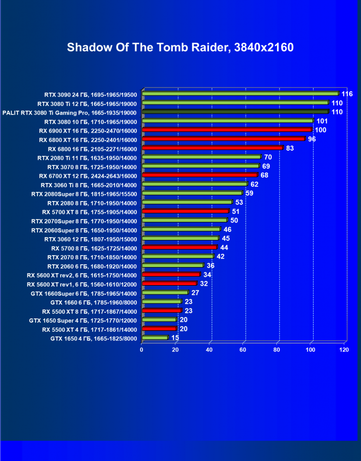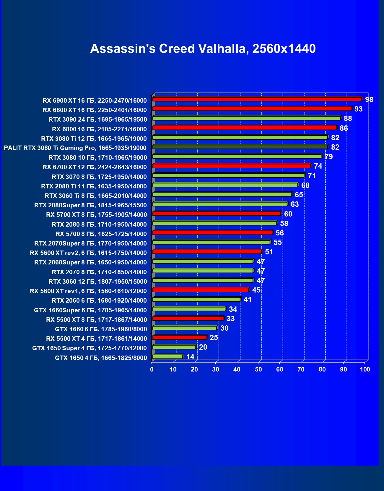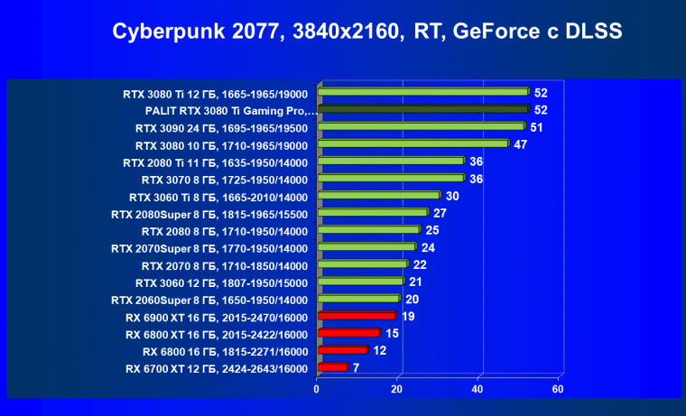 Здесь все логично: RTX 3090 находится в лидерах, за ней следует RX 6900 XT, которую уже преследует RTX 3080 Ti. Карта Palit по частотам работы практически идентична референс-аналогу, поэтому разница между ними ничтожна.