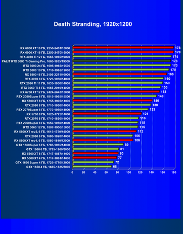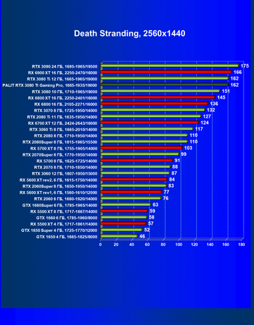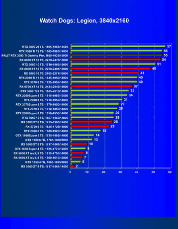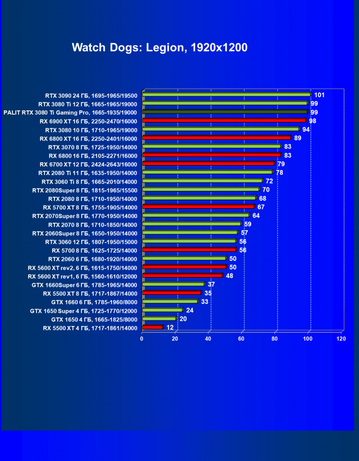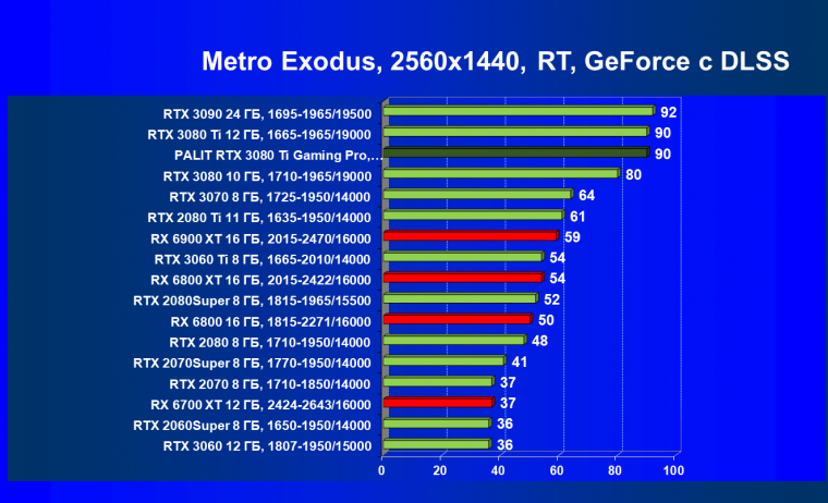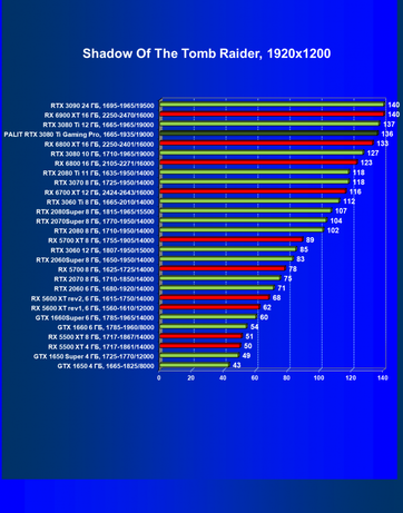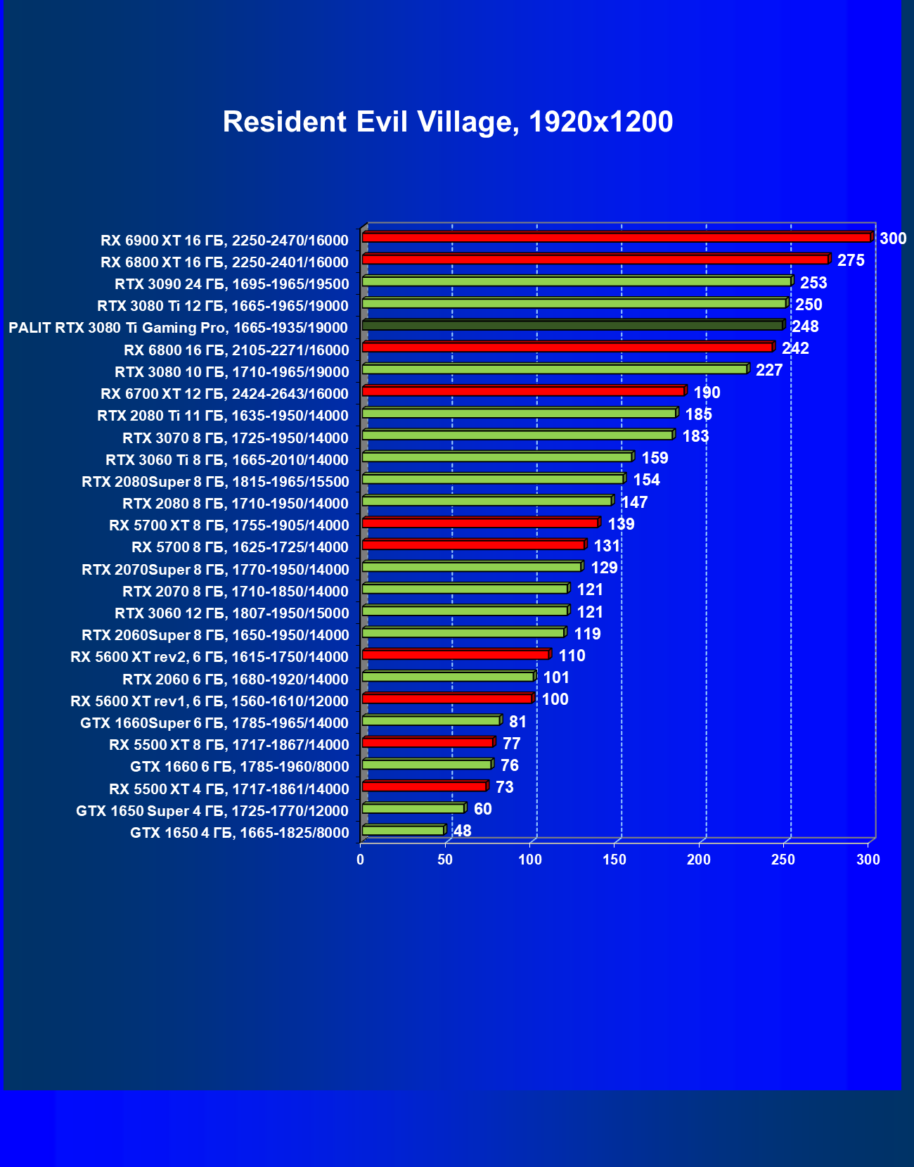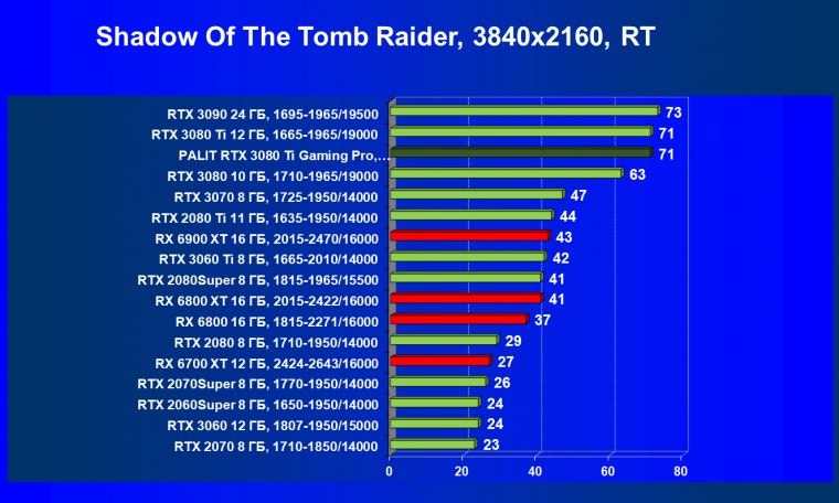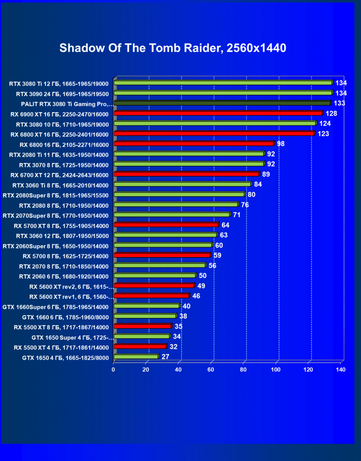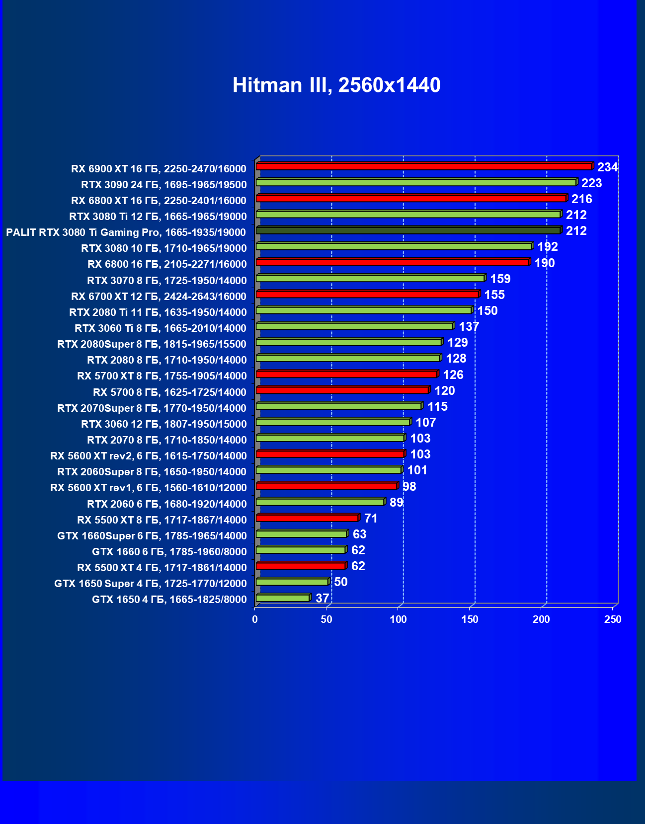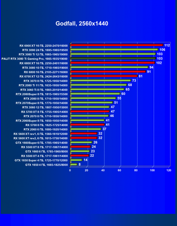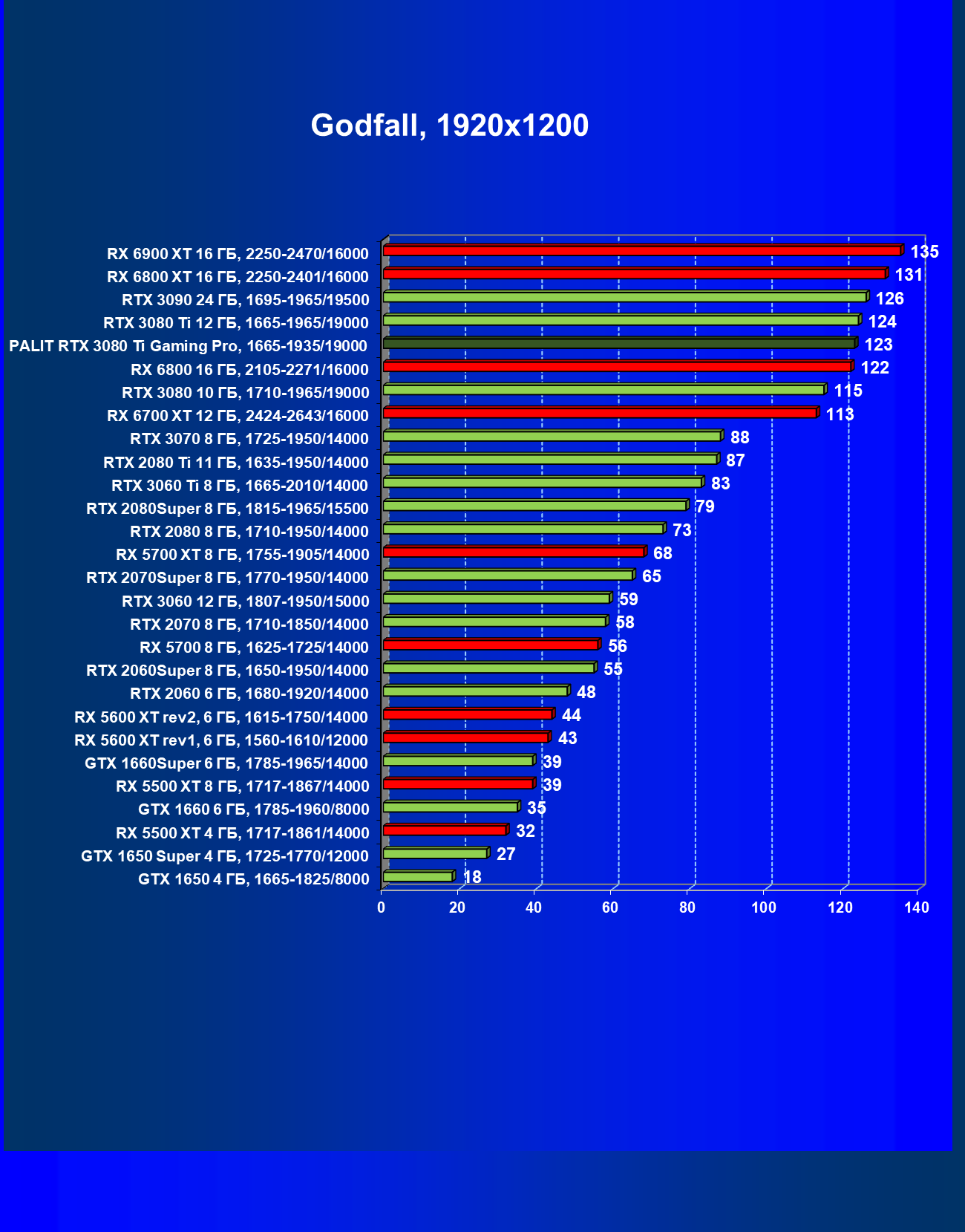 Здесь все логично: RTX 3090 находится в лидерах, за ней следует RX 6900 XT, которую уже преследует RTX 3080 Ti. Карта Palit по частотам работы практически идентична референс-аналогу, поэтому разница между ними ничтожна.