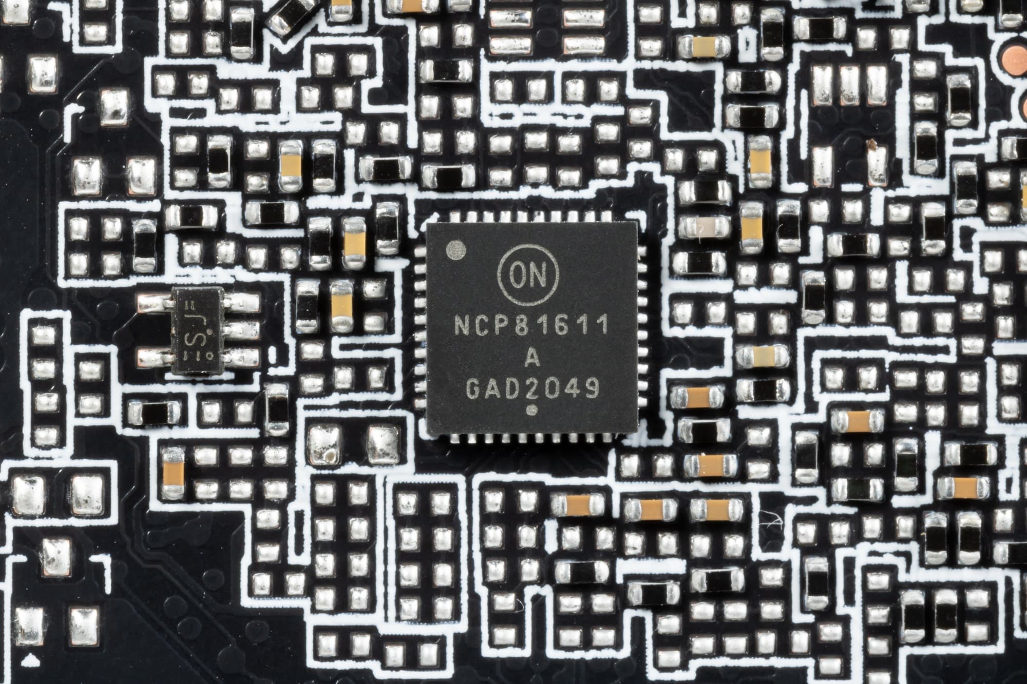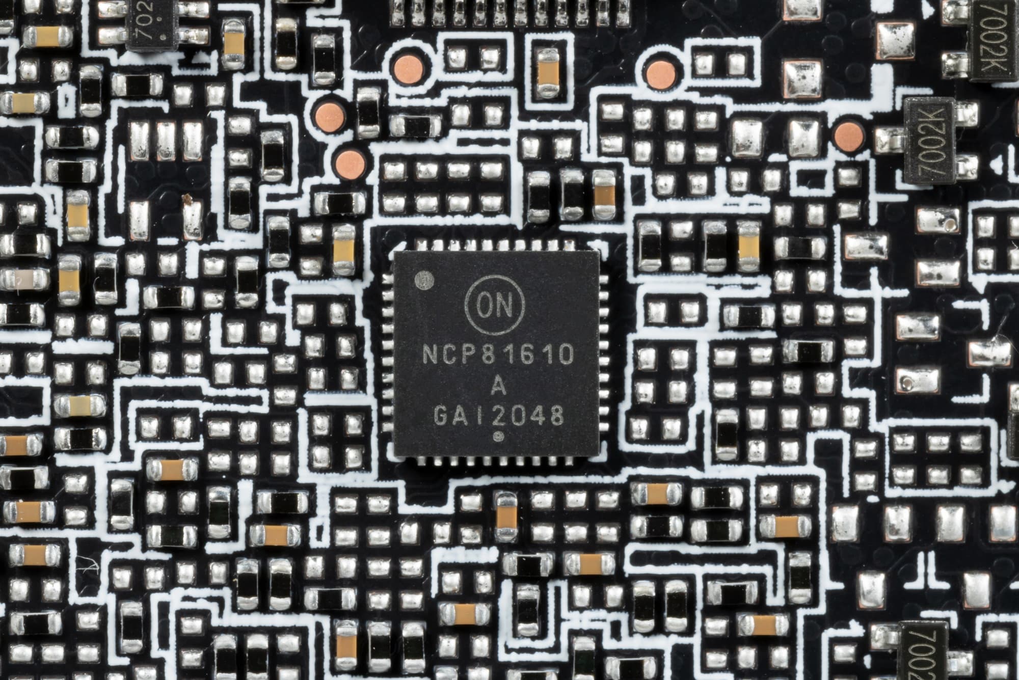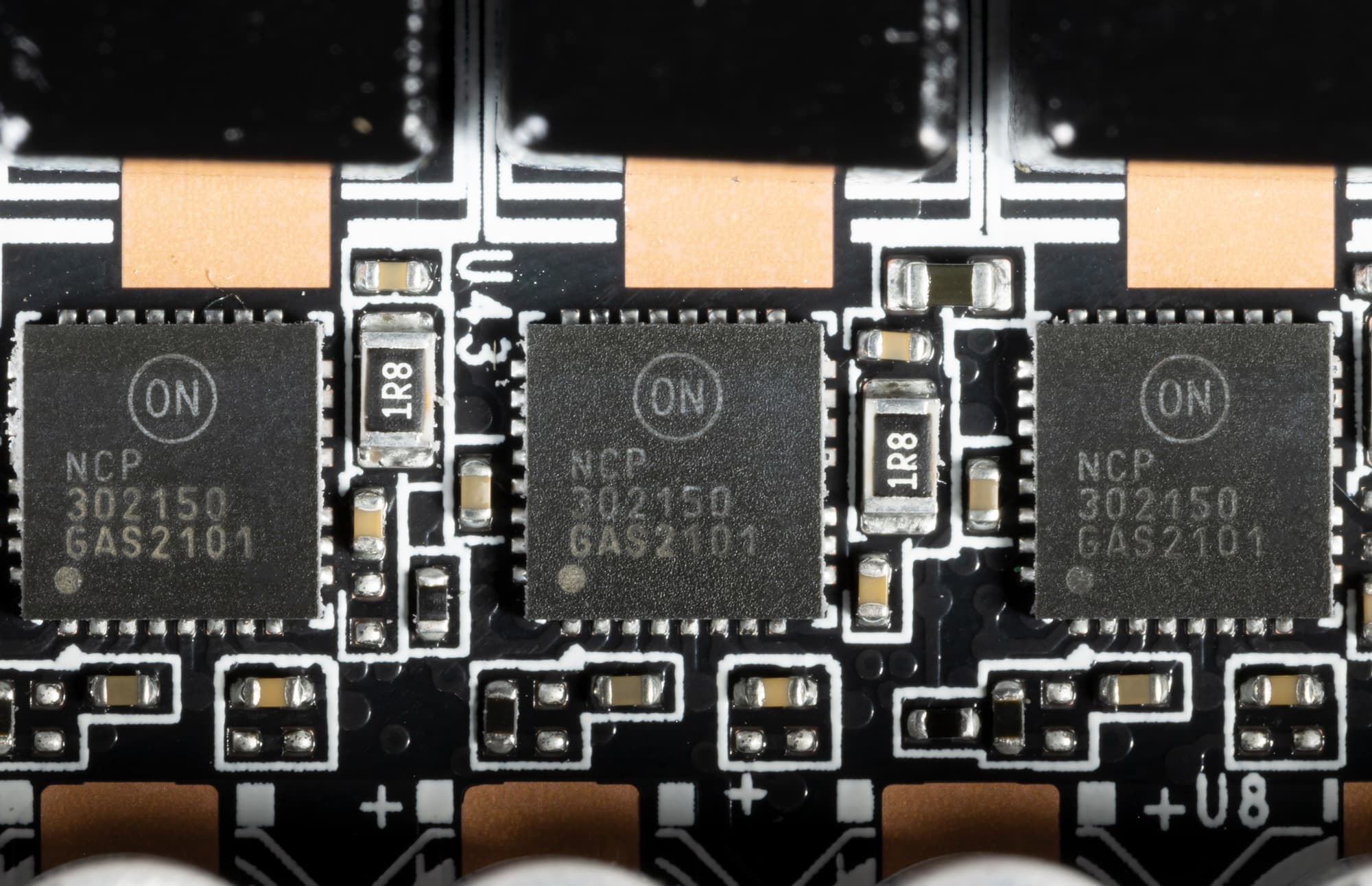 В преобразователе питания, традиционно для всех видеокарт Nvidia, используются транзисторные сборки DrMOS — в данном случае, NCP302150 (тот же On Semiconductor), каждая из которых рассчитана на максимальный ток в 50 А.