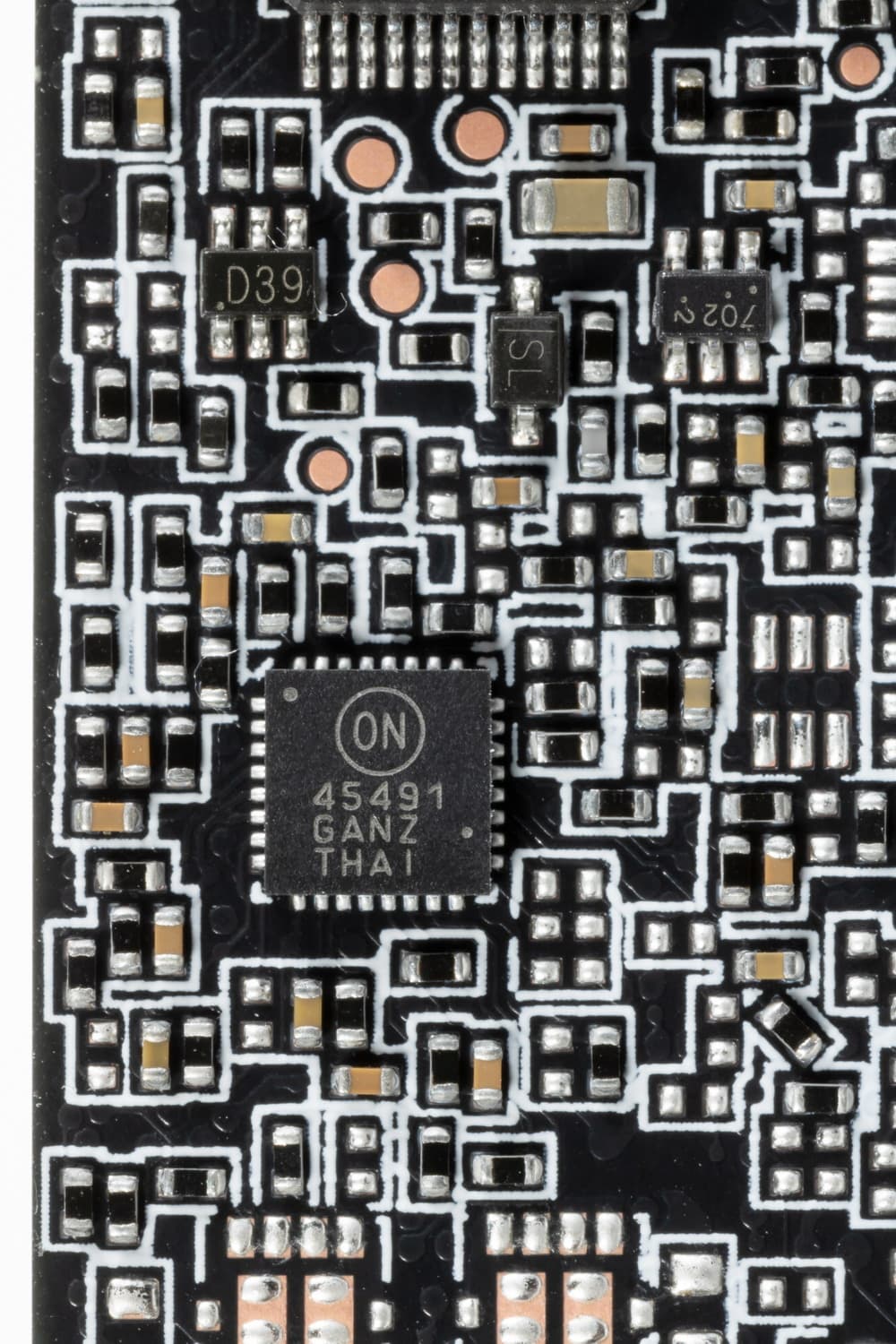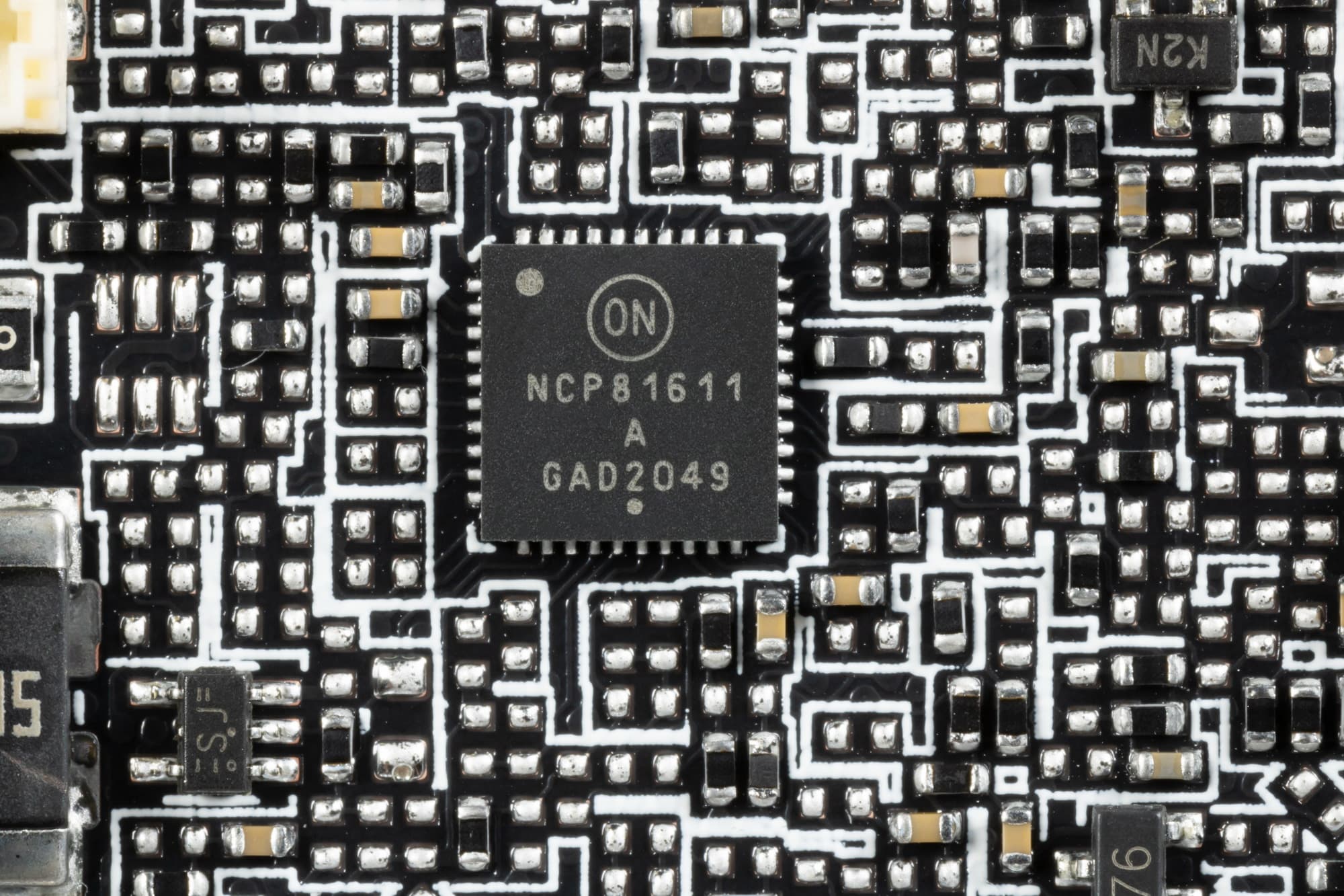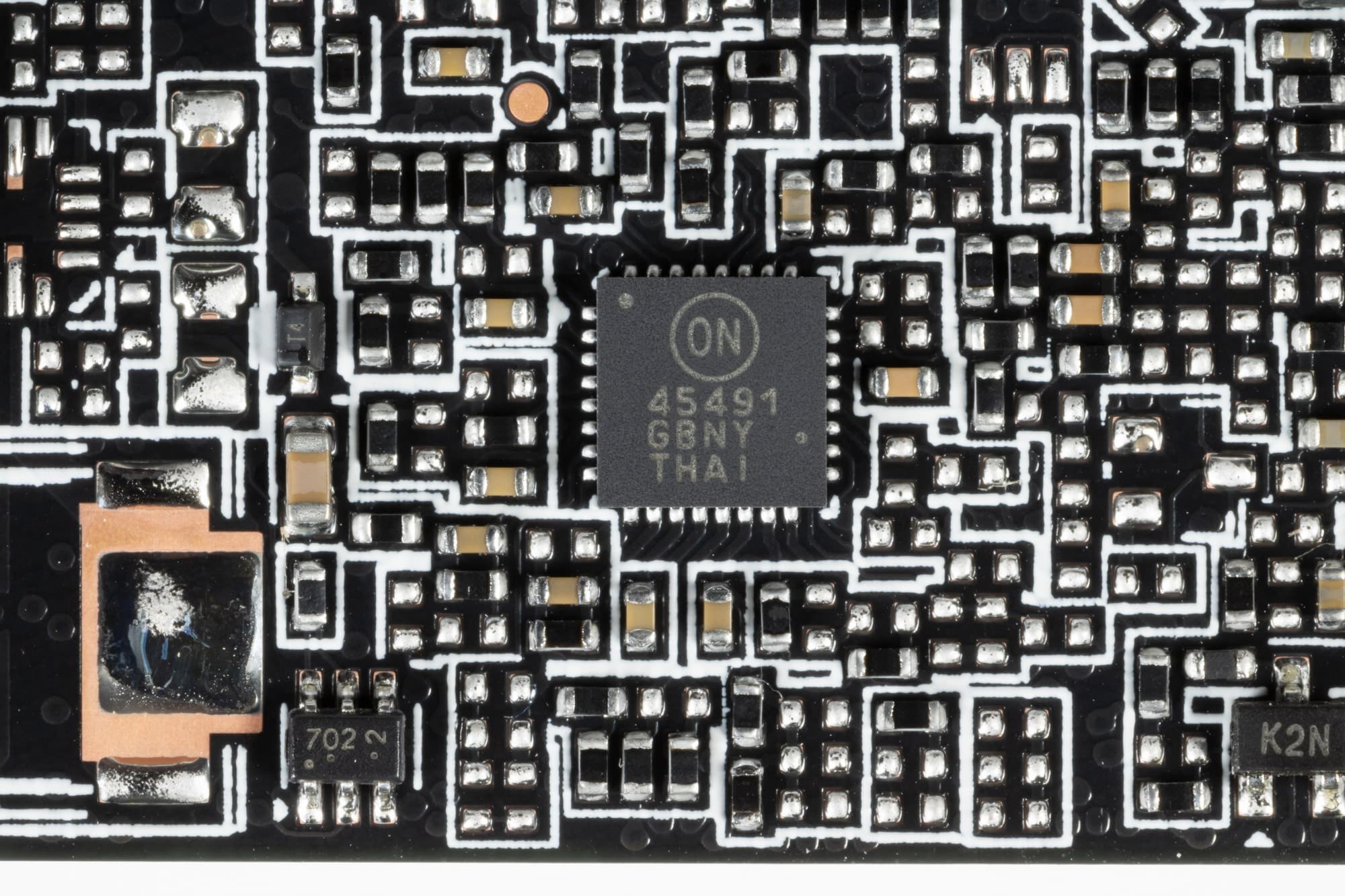 В преобразователе питания, традиционно для всех видеокарт Nvidia, используются транзисторные сборки DrMOS — в данном случае, NCP302150 (тот же On Semiconductor), каждая из которых рассчитана на максимальный ток в 50 А.