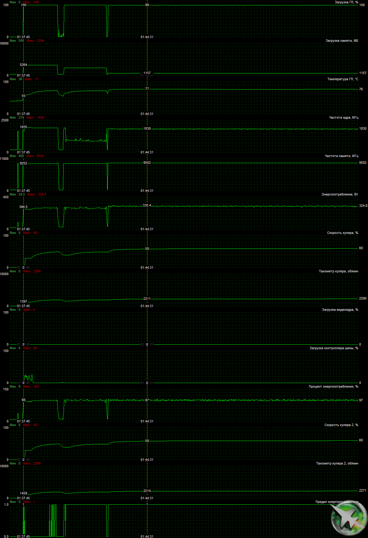 После 2-часового прогона под нагрузкой максимальная температура ядра не превысила 77 градусов, что является приемлемым результатом для видеокарт такого уровня. Максимальная мощность была зафиксирована на уровне 258 Вт, а максимальный нагрев наблюдался в левой части PCB, в основном слева от ядра (и основным источником нагрева являются преобразователи питания).