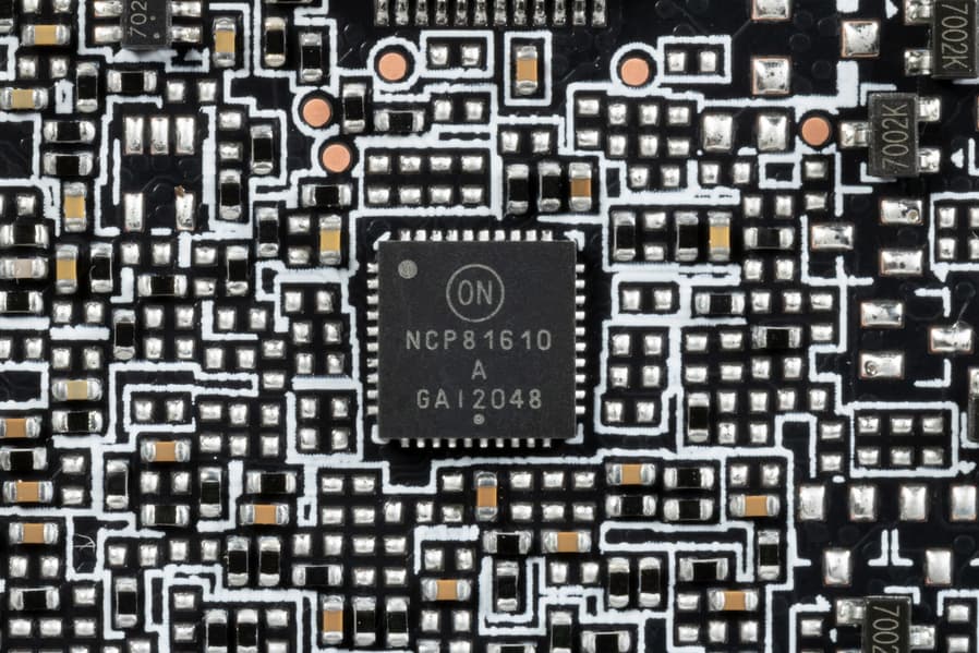 На лицевой же стороне имеется другой ШИМ-контроллер On Semiconductor NCP81610, который управляет 3-фазной схемой питания микросхем памяти.