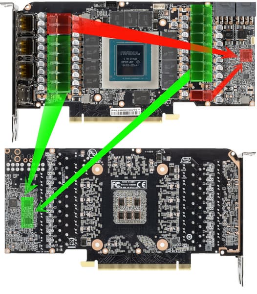 Зеленым цветом отмечена схема питания ядра, красным — памяти. При этом удвоителей (даблеров) фаз нет, для управления схемой питания GPU используются два ШИМ-контроллера NCP81611 (On Semiconductor), каждый из которых способен управлять максимум 8 фазами. Оба расположены на оборотной стороне платы.