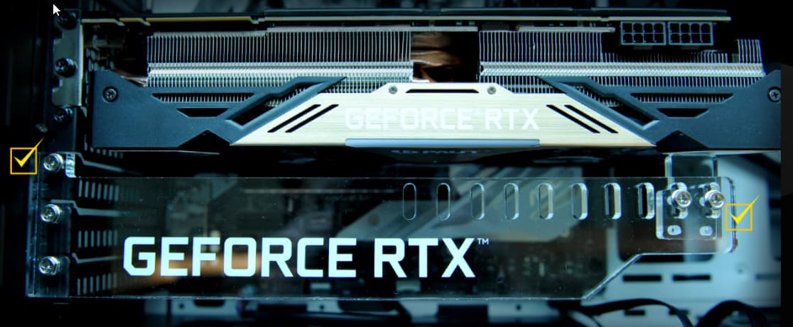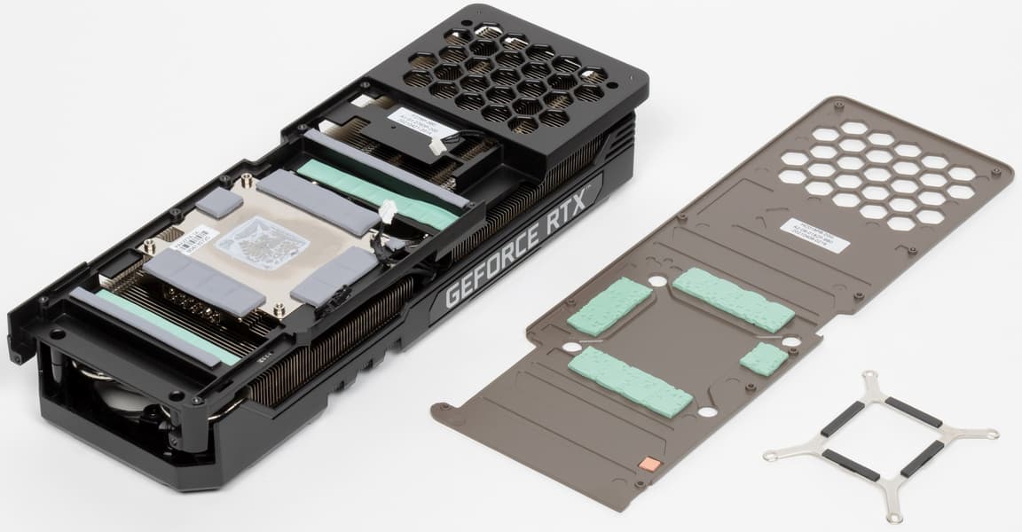 Мы видим традиционный большой двухсекционный пластинчатый никелированный радиатор с тепловыми трубками, подошва которого охлаждает GPU и микросхемы памяти. А преобразователи питания VRM охлаждаются с помощью отдельной пластины, прикрученной к основному радиатору. Задняя пластина служит не только элементом жесткости, но и участвует в охлаждении оборотной стороны PCB через термоинтерфейс.