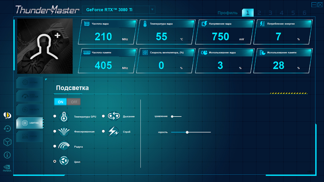 Тем не менее, программное управление подсветкой карты может предложить неплохое сочетание эффектов, особенно совместно с подсветкой материнских плат или корпуса. К сожалению, синхронизации работы с утилитами управления для материнских плат известных производителей не предусмотрено.