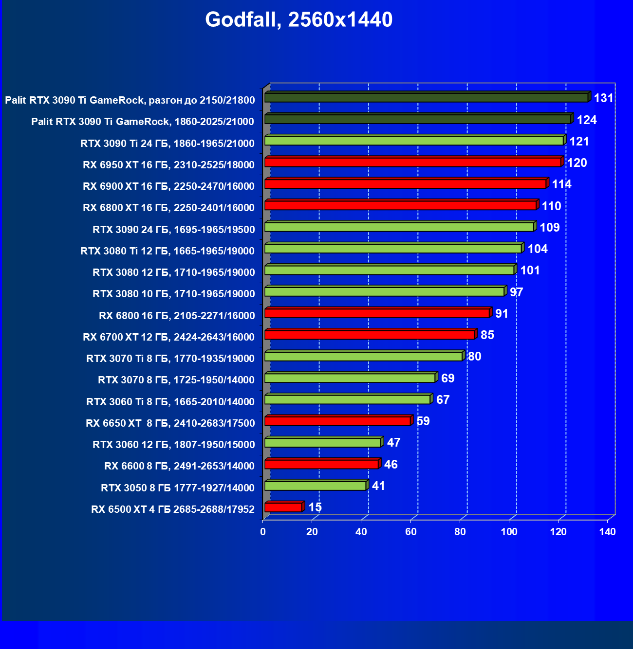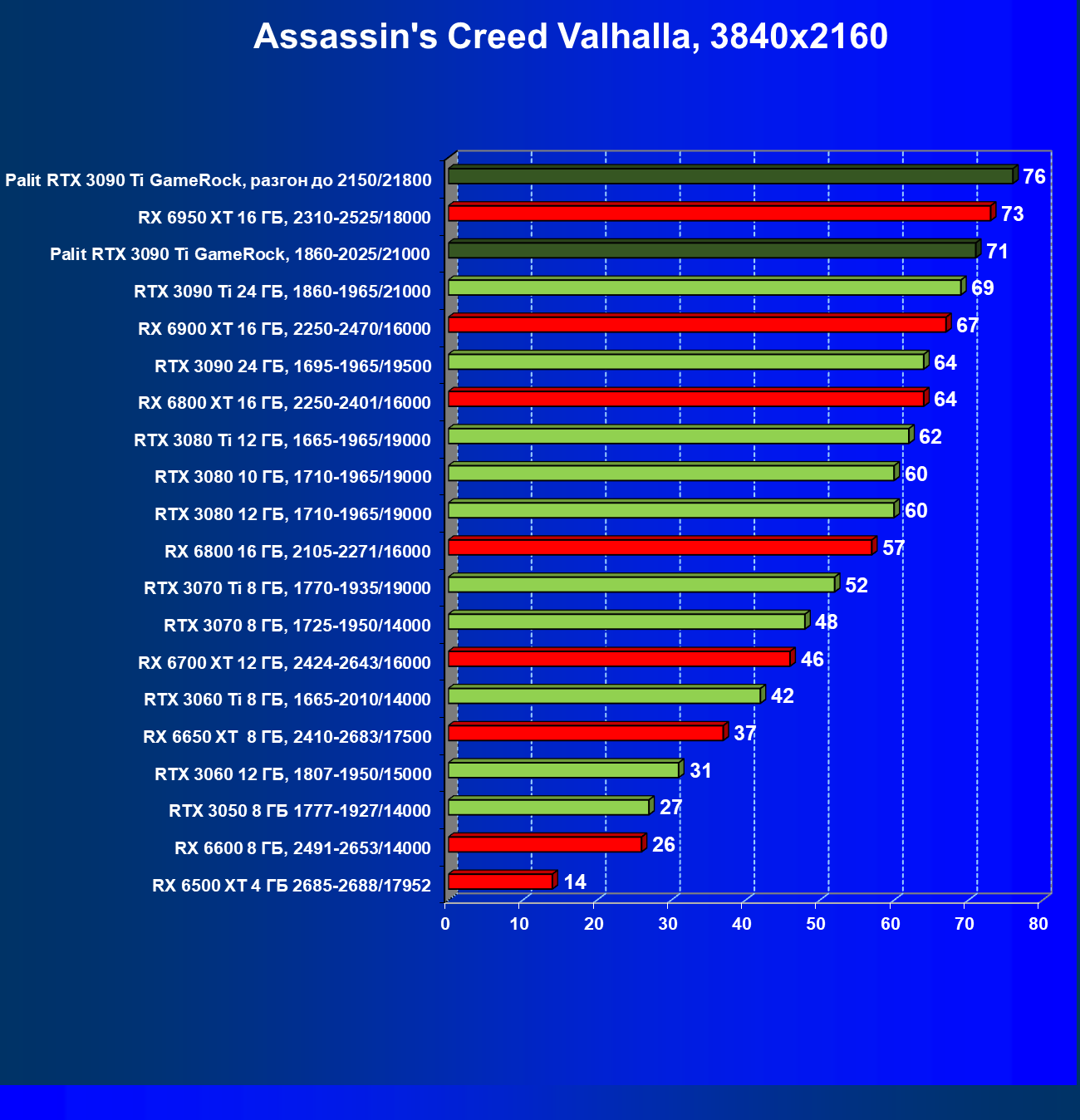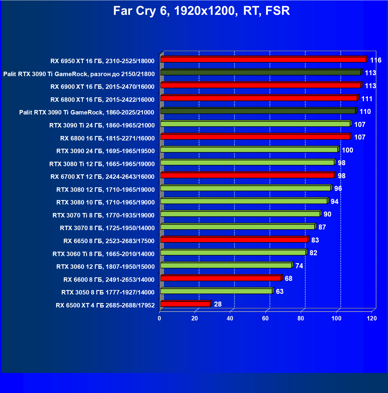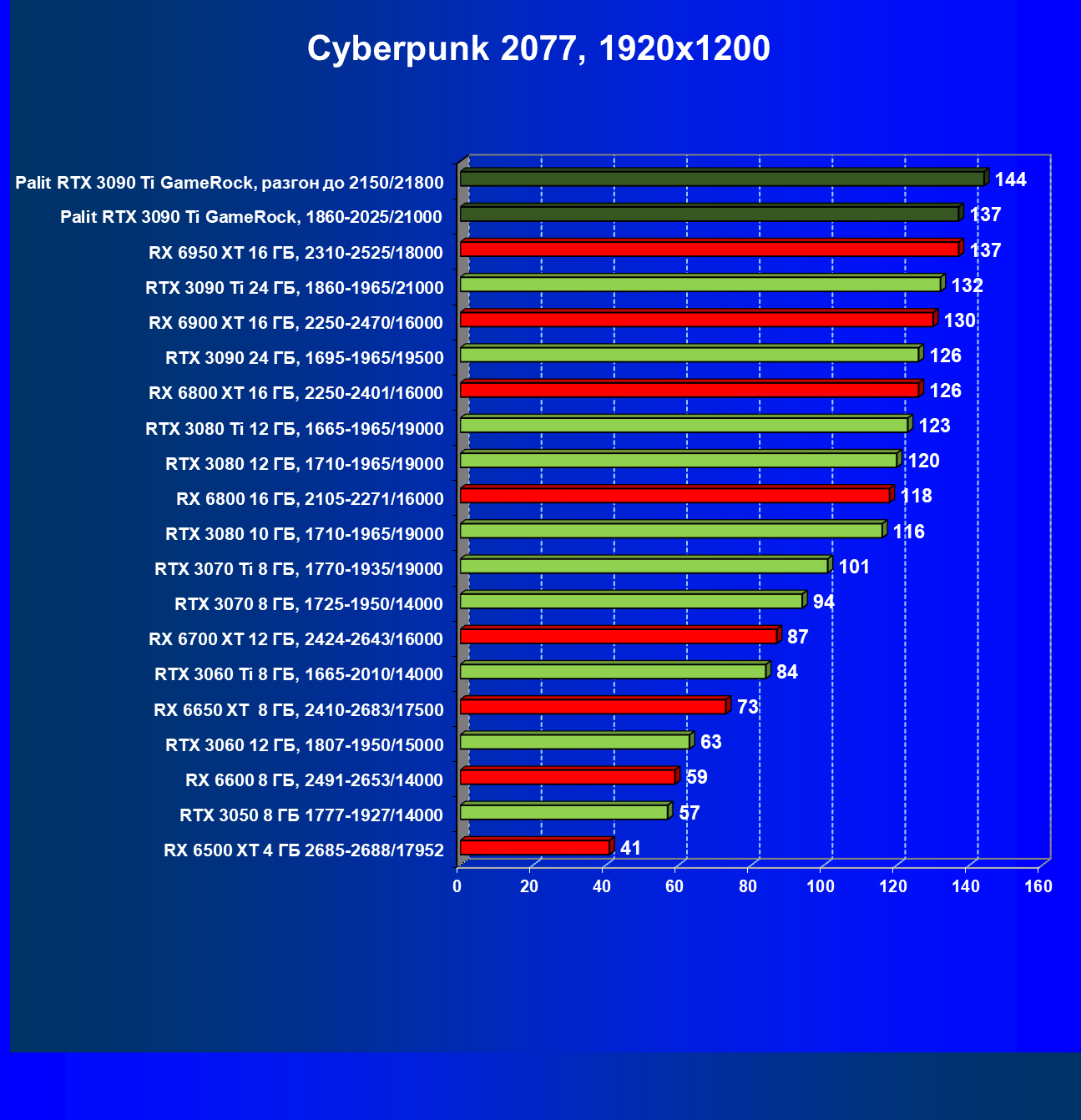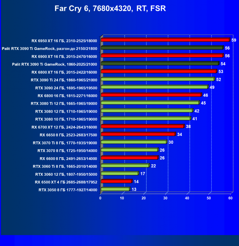 | 14 | RX 6950 XT 16 ГБ, 2310—2525/18000 | 63 | 678 | 108 000 |